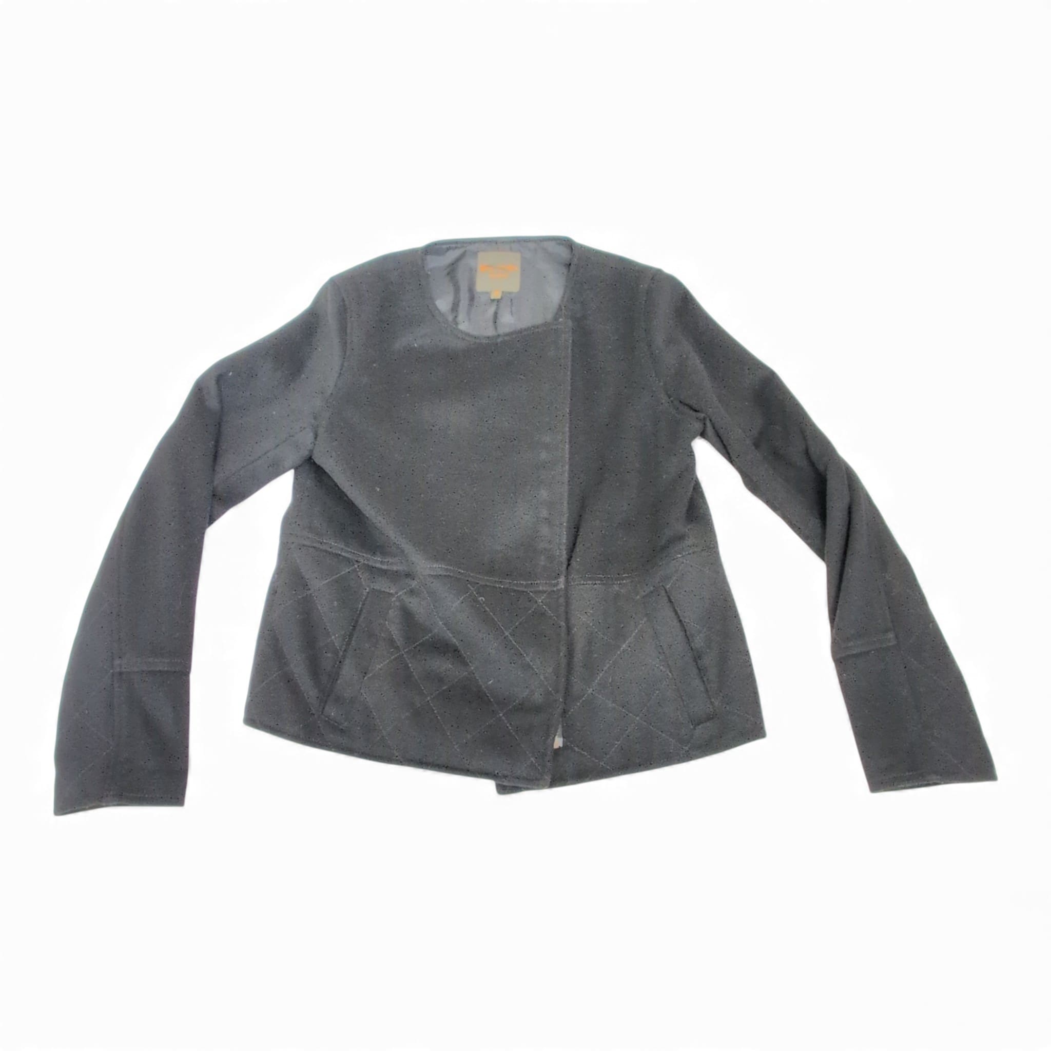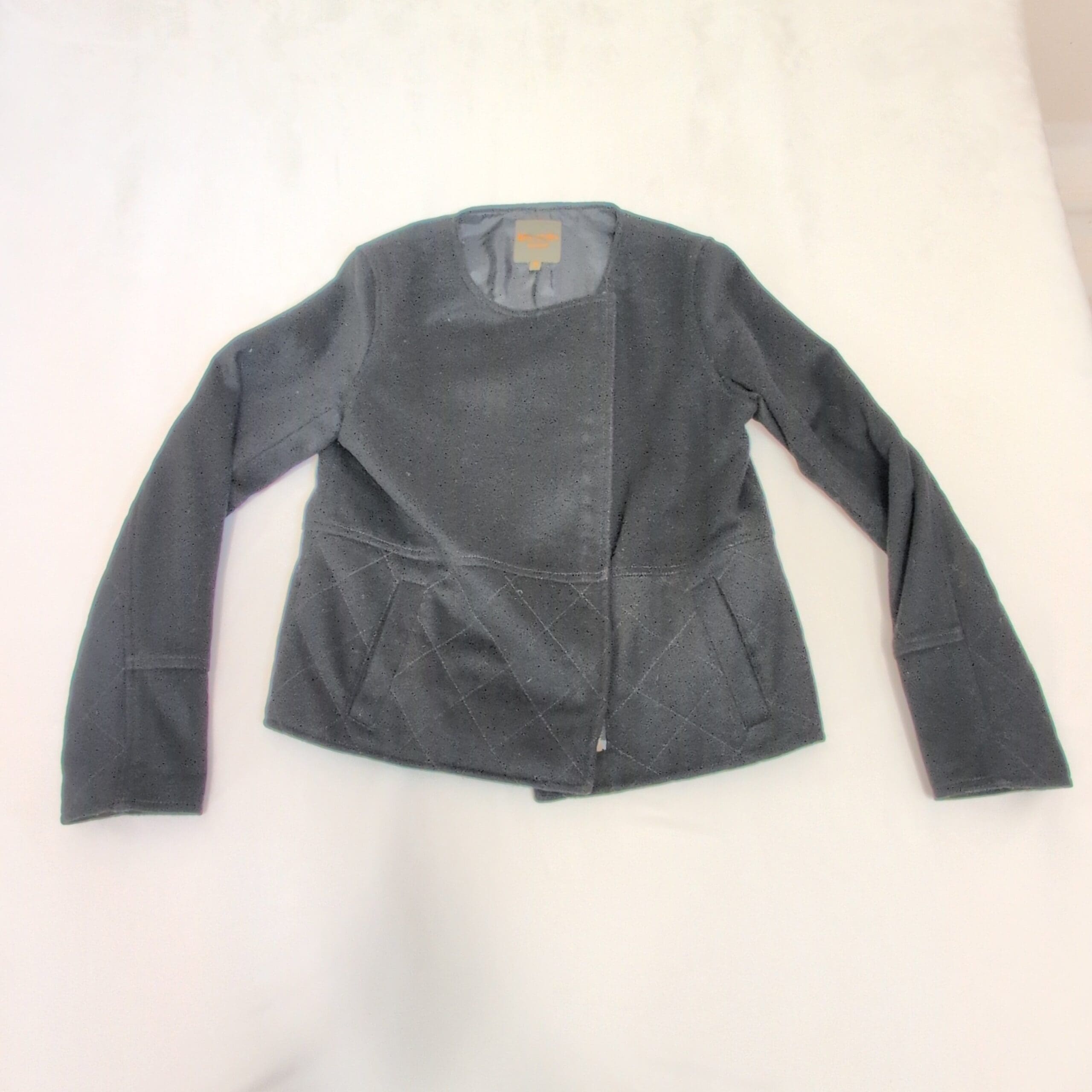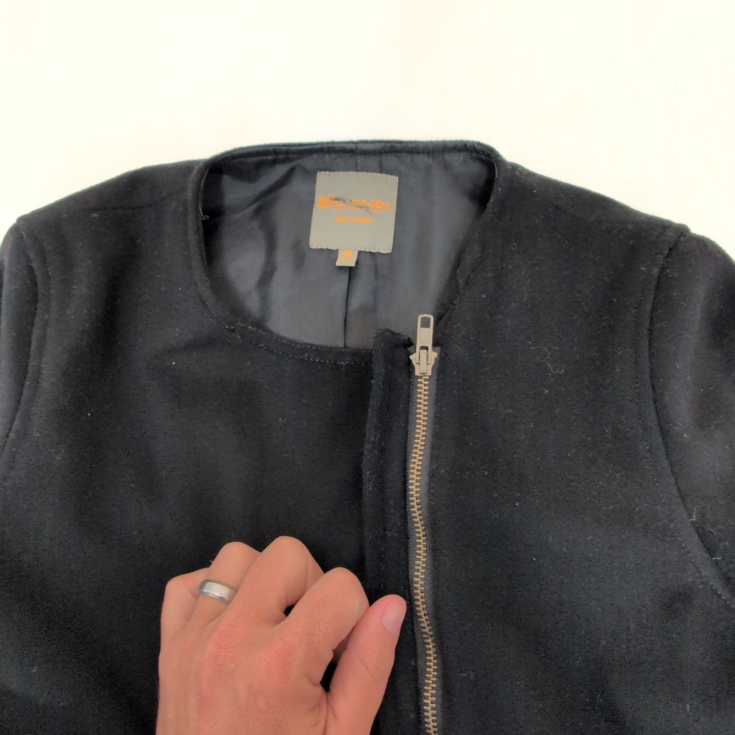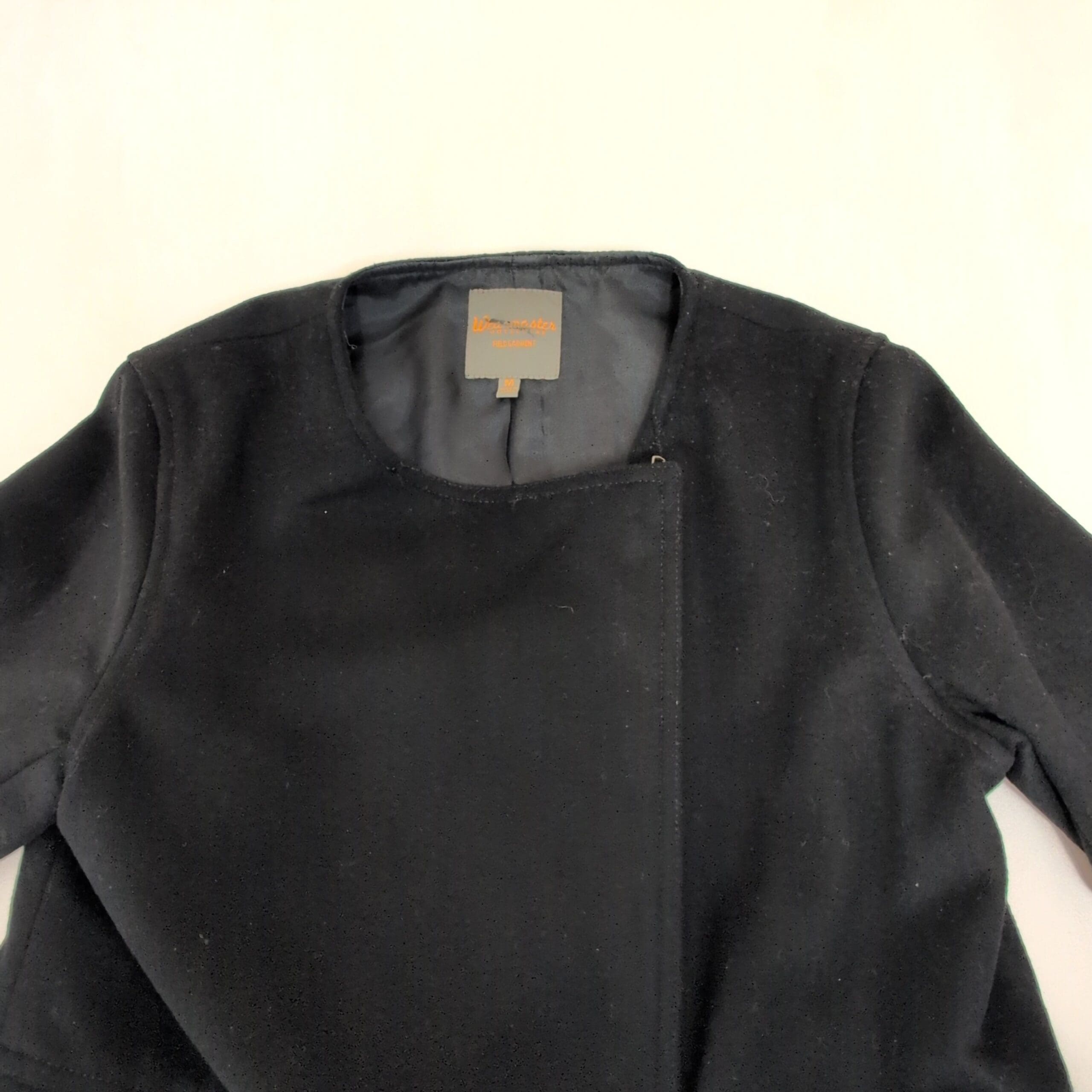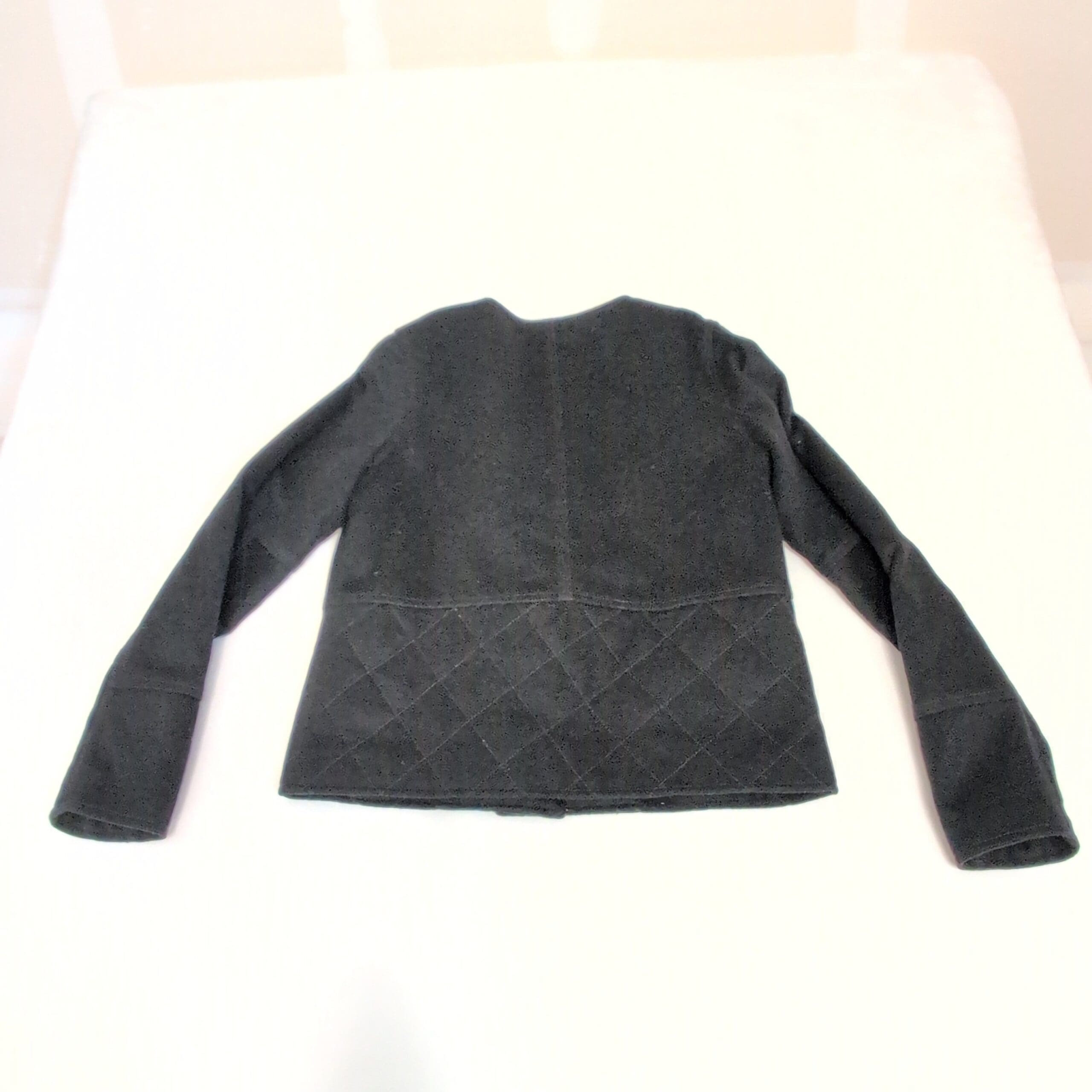 Wearmaster women’s black pea coat in a size M. Features a collarless round neckline, asymmetrical front closure, quilted diamond panels at the waist, front slit pockets, long sleeves and a slightly tailored silhouette. Lined interior for added comfort. Versatile and polished for work or weekend wear. Gently used — good pre-owned condition with light wear; no noticeable stains, tears, or missing hardware.