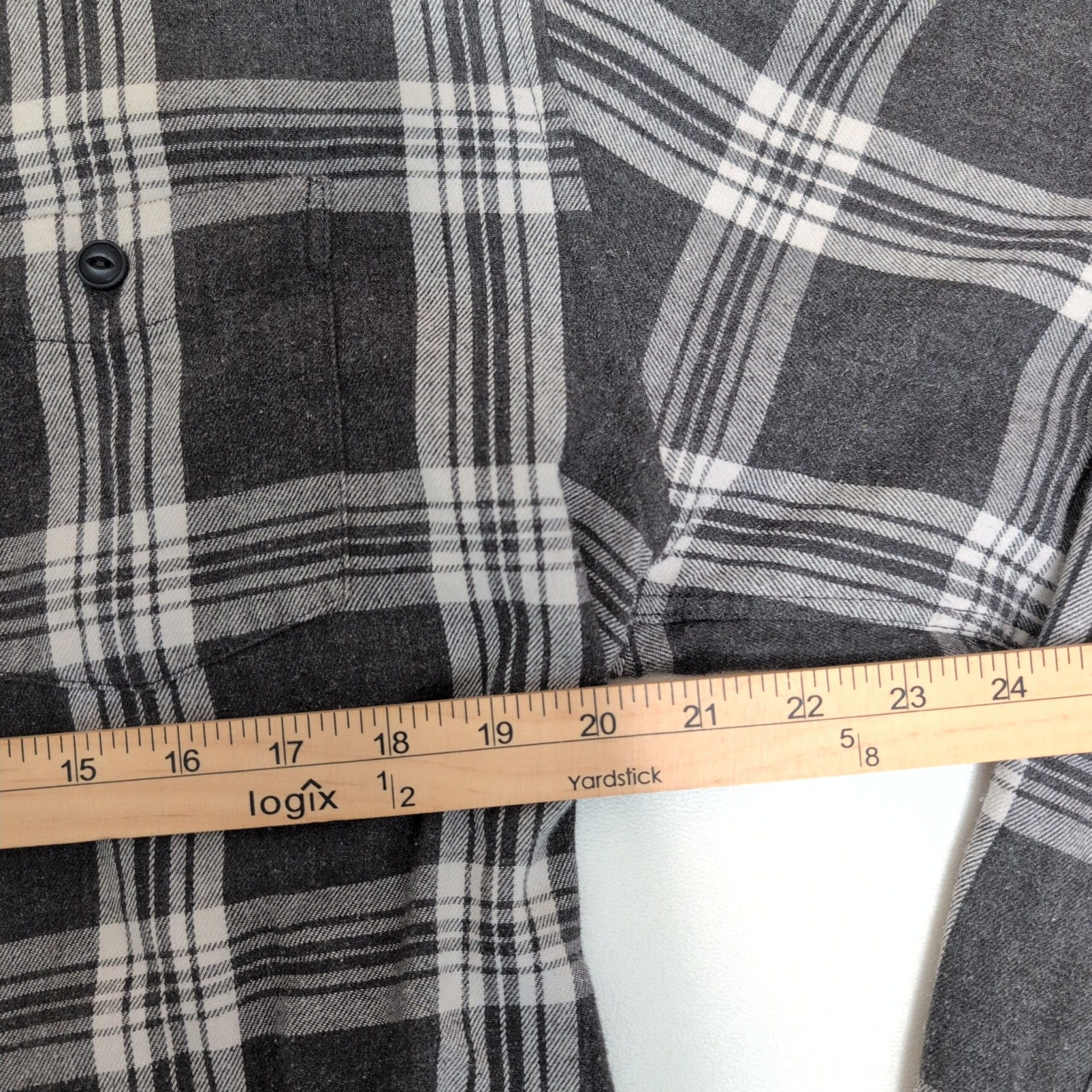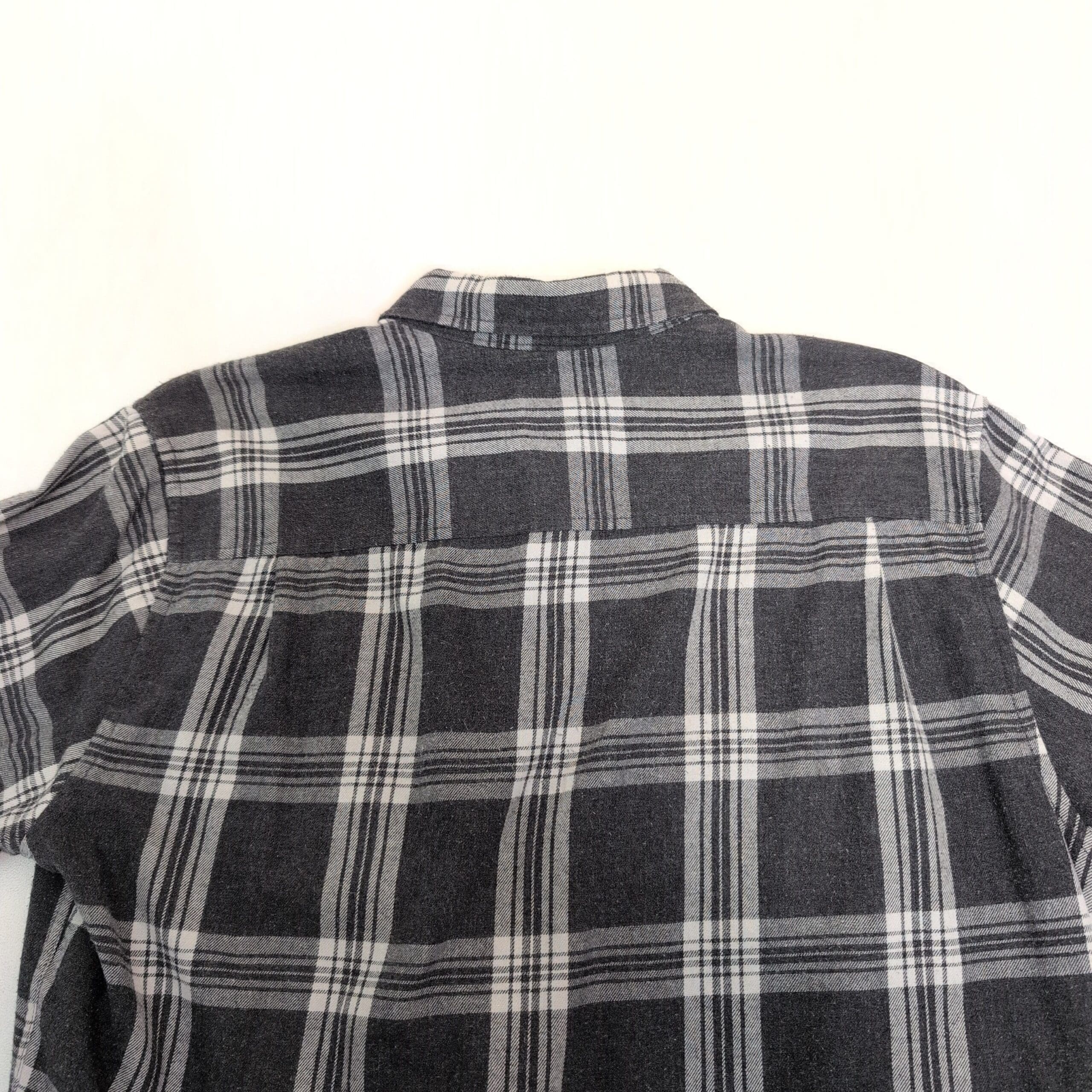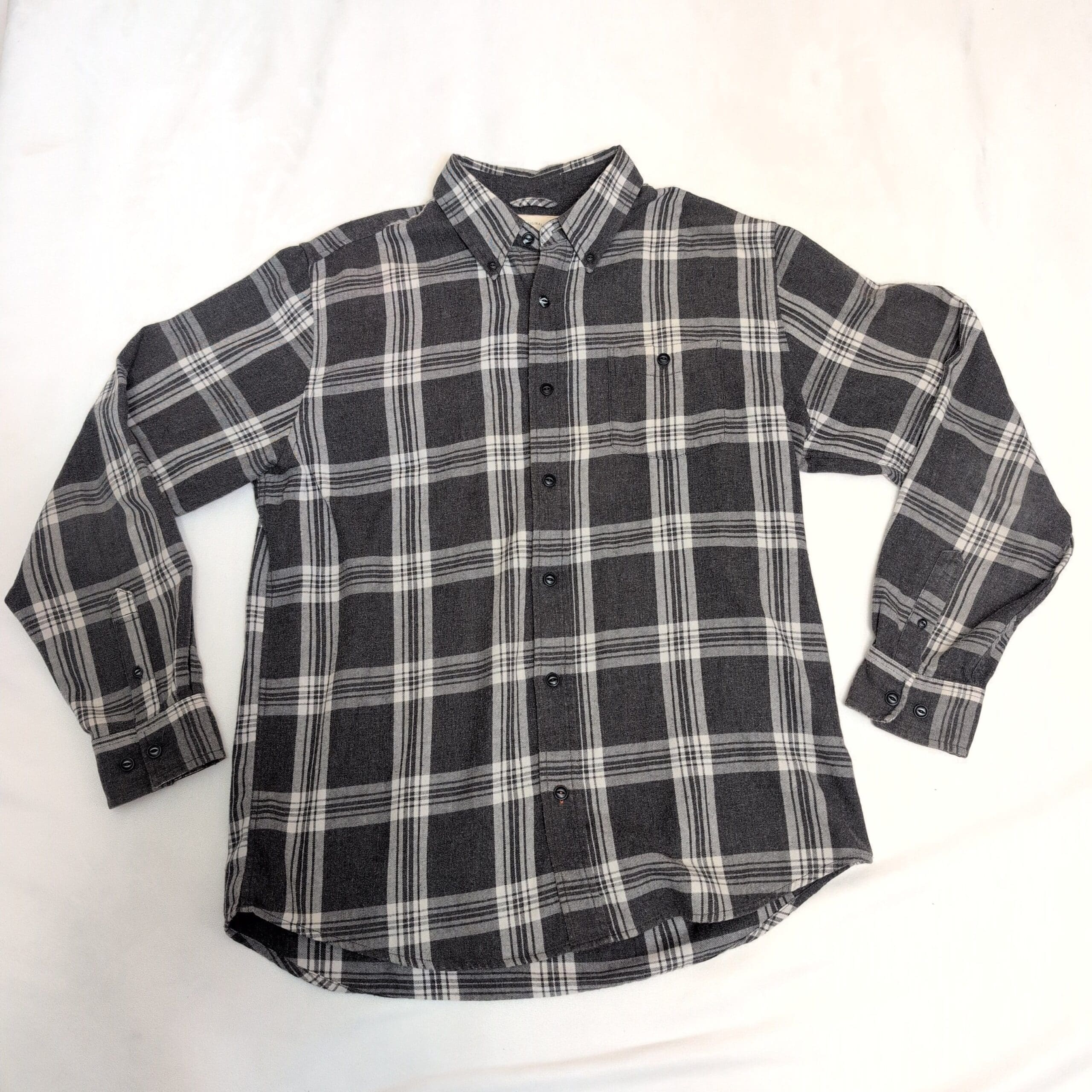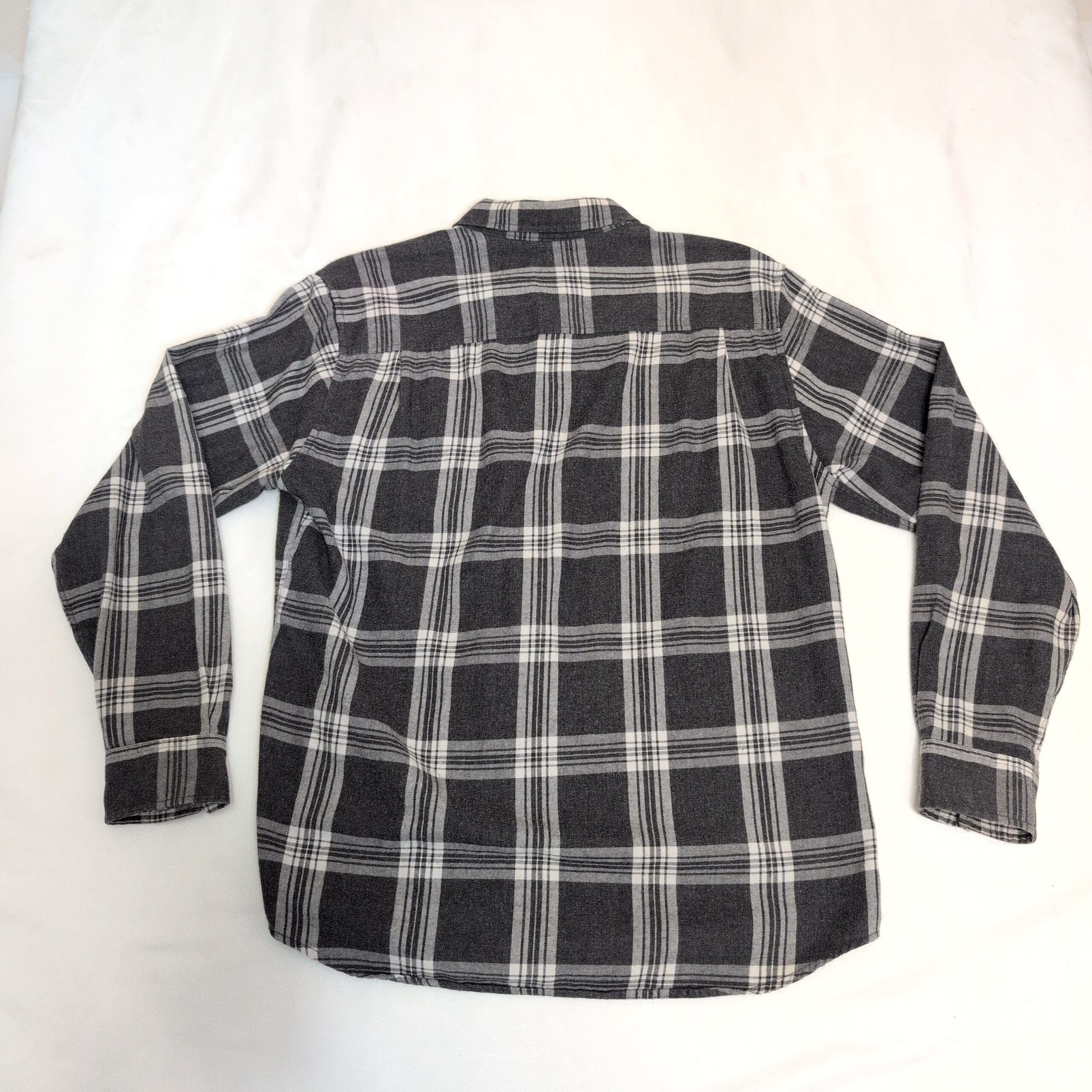 Weatherproof men’s long-sleeve casual button-down in gray and white plaid. Size L (standard). Features a button-down collar, full button front, and a single chest pocket — a classic, versatile shirt for everyday wear. Pre-owned, gently used condition.