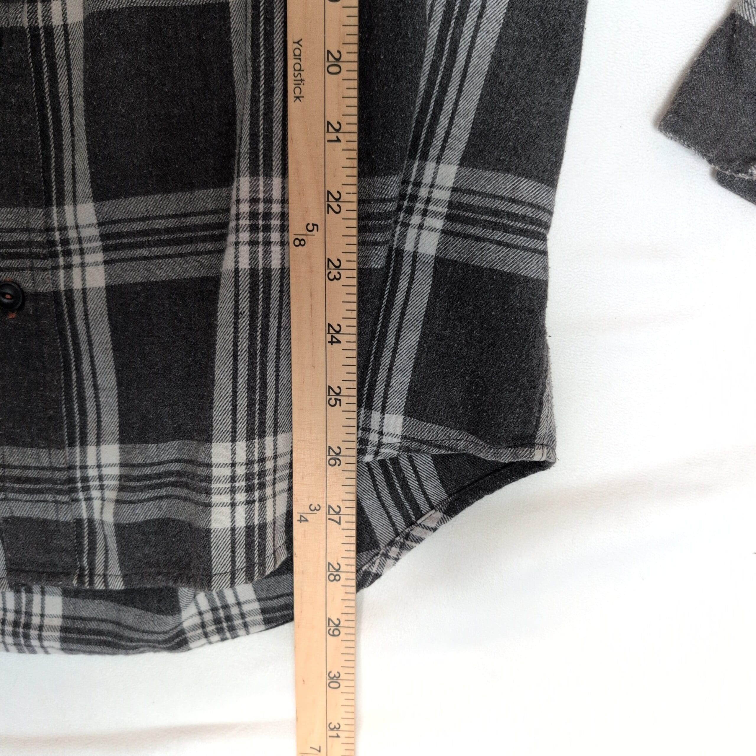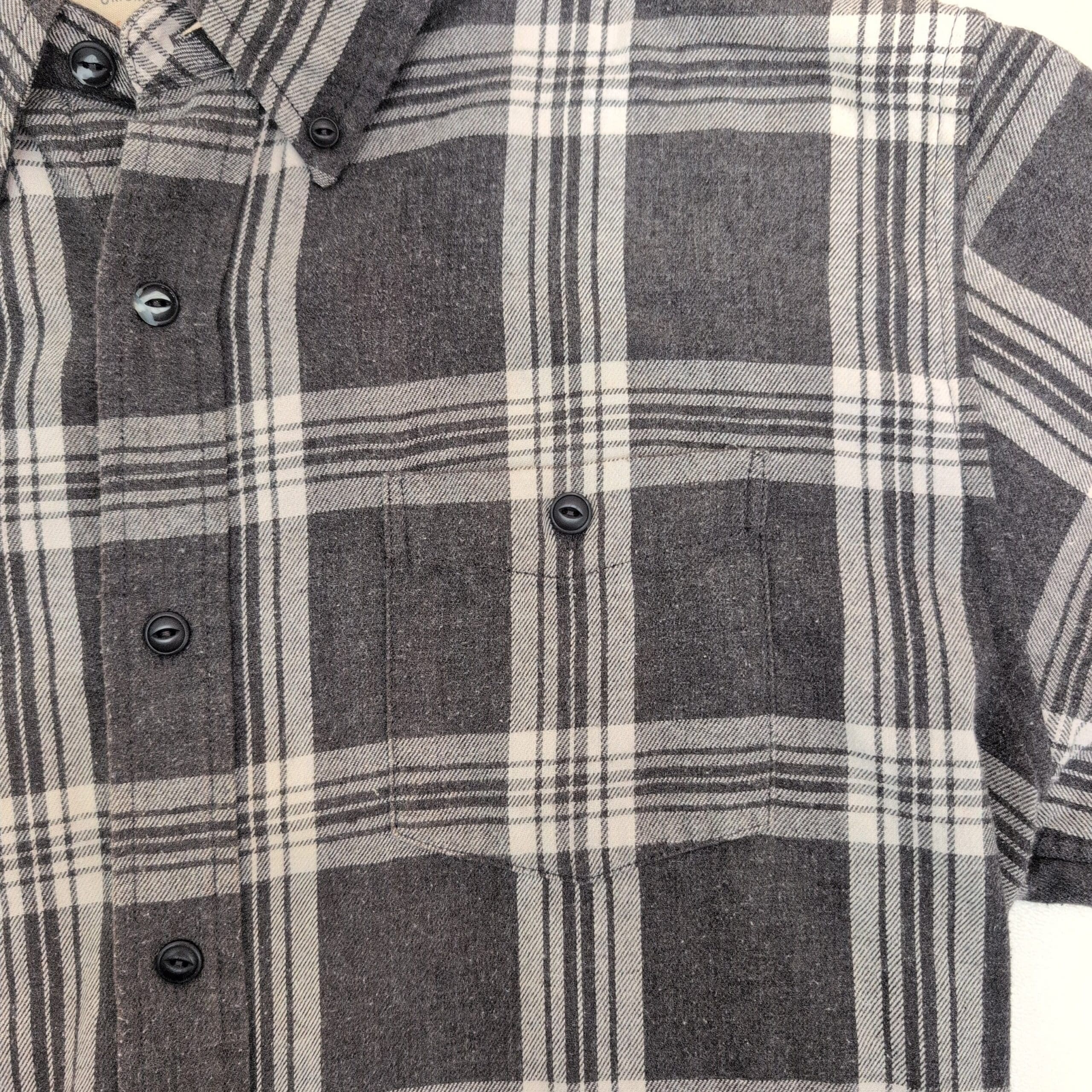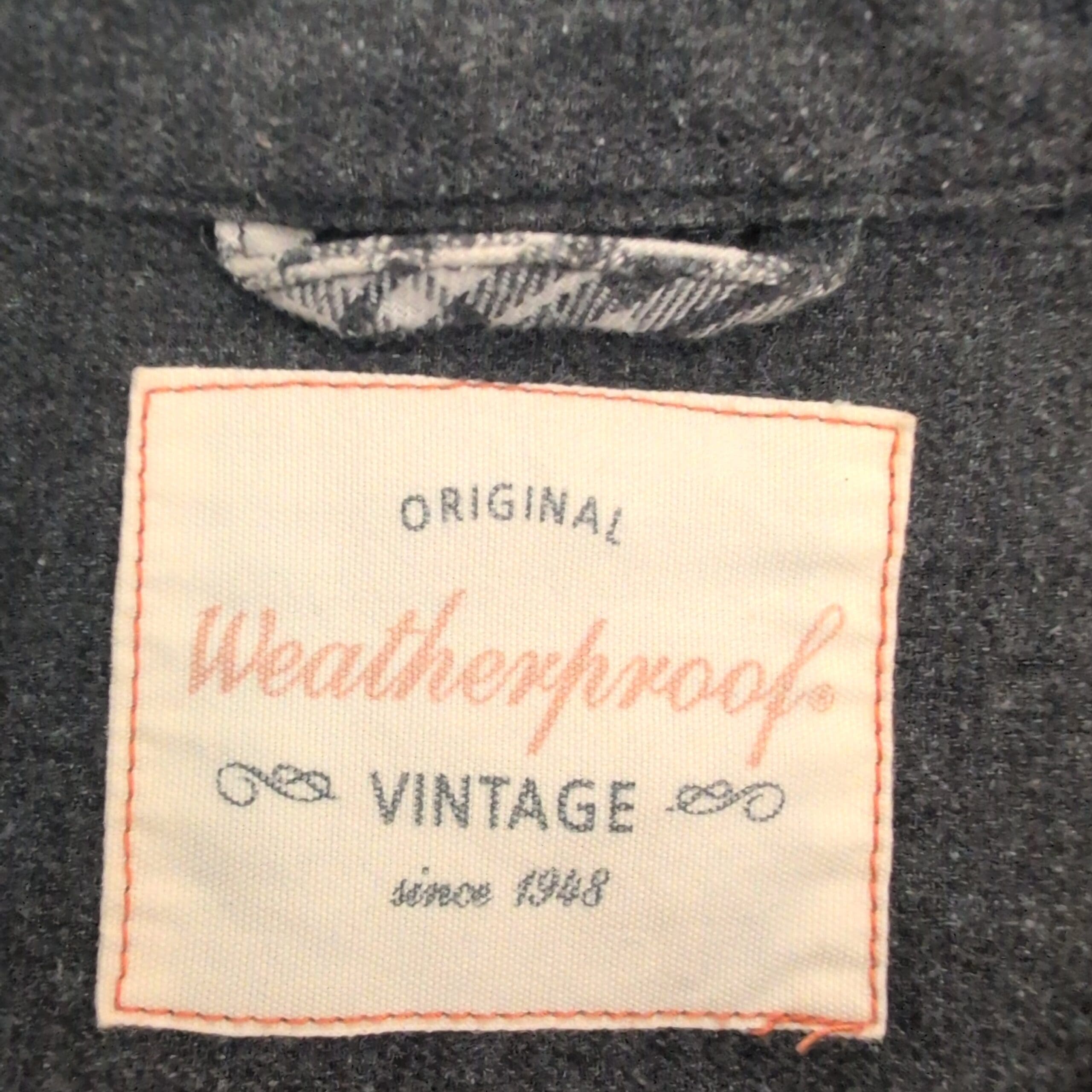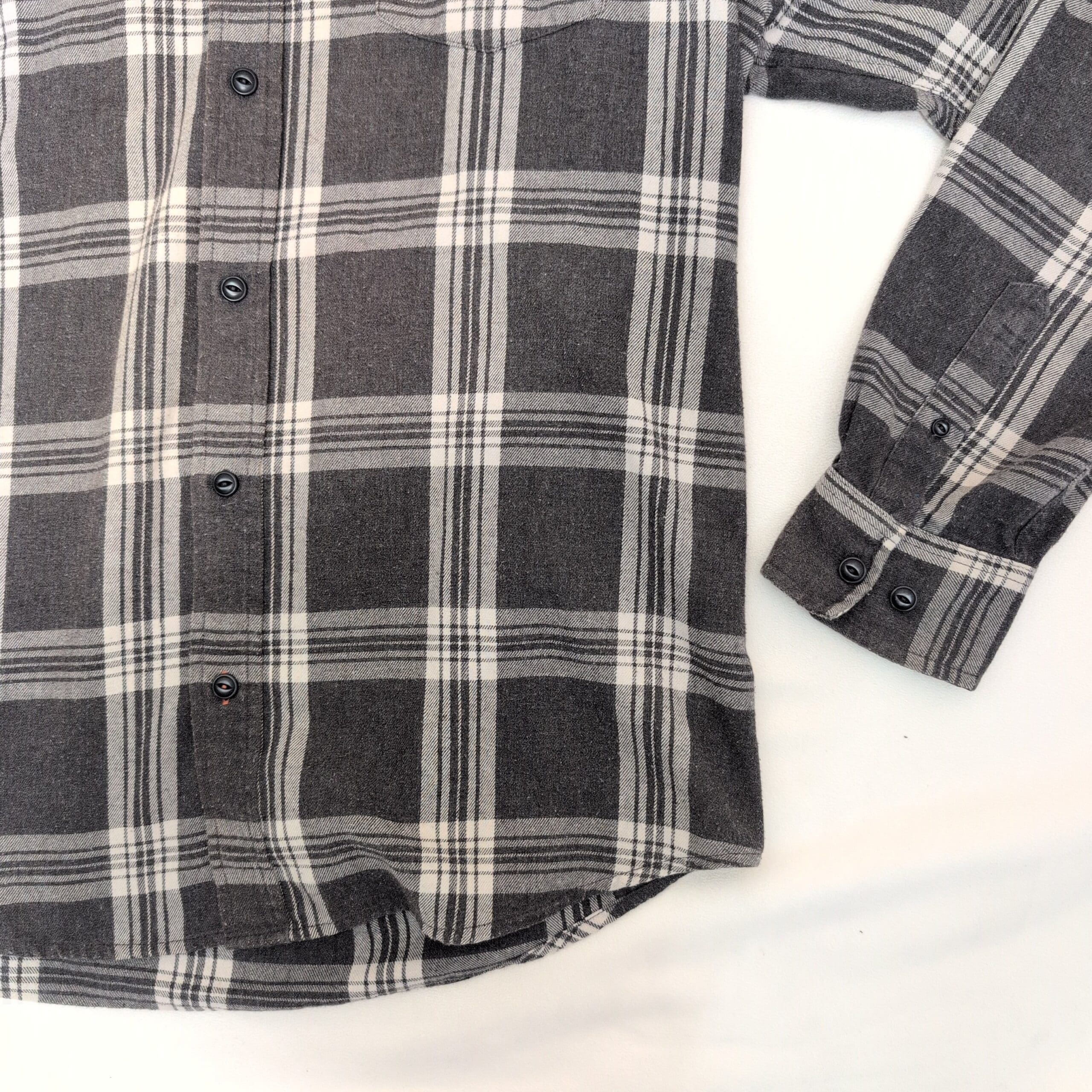Weatherproof men’s long-sleeve casual button-down in gray and white plaid. Size L (standard). Features a button-down collar, full button front, and a single chest pocket — a classic, versatile shirt for everyday wear. Pre-owned, gently used condition.