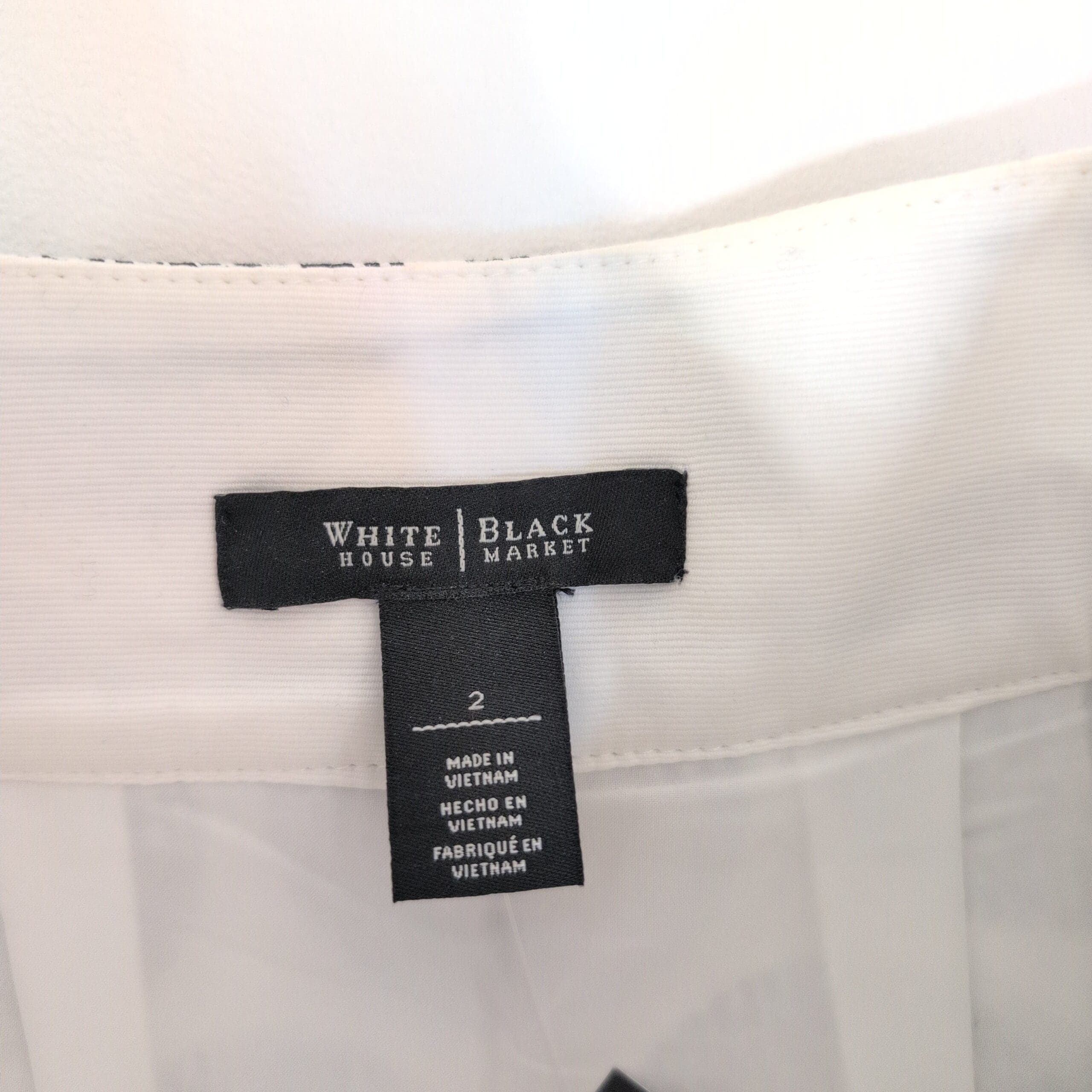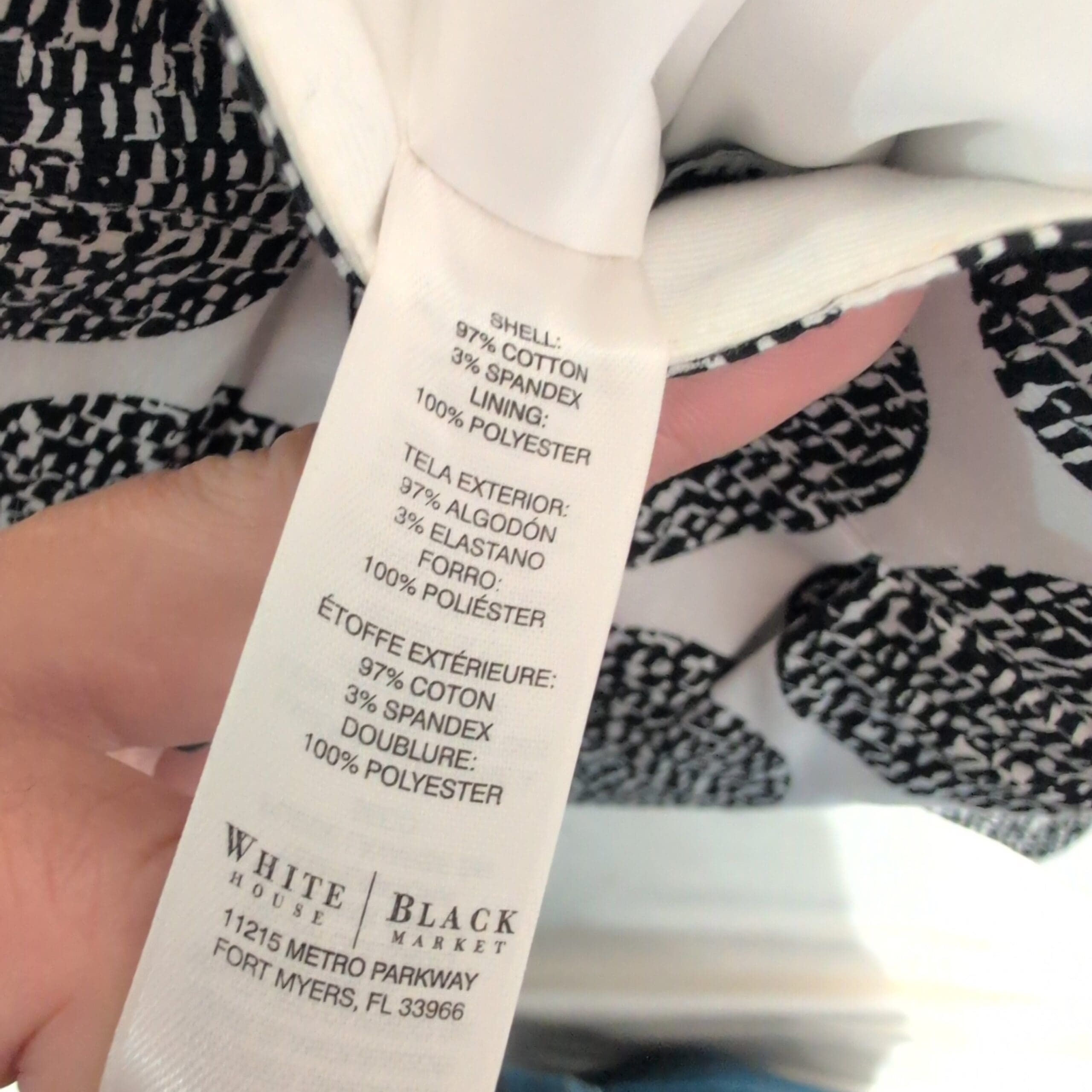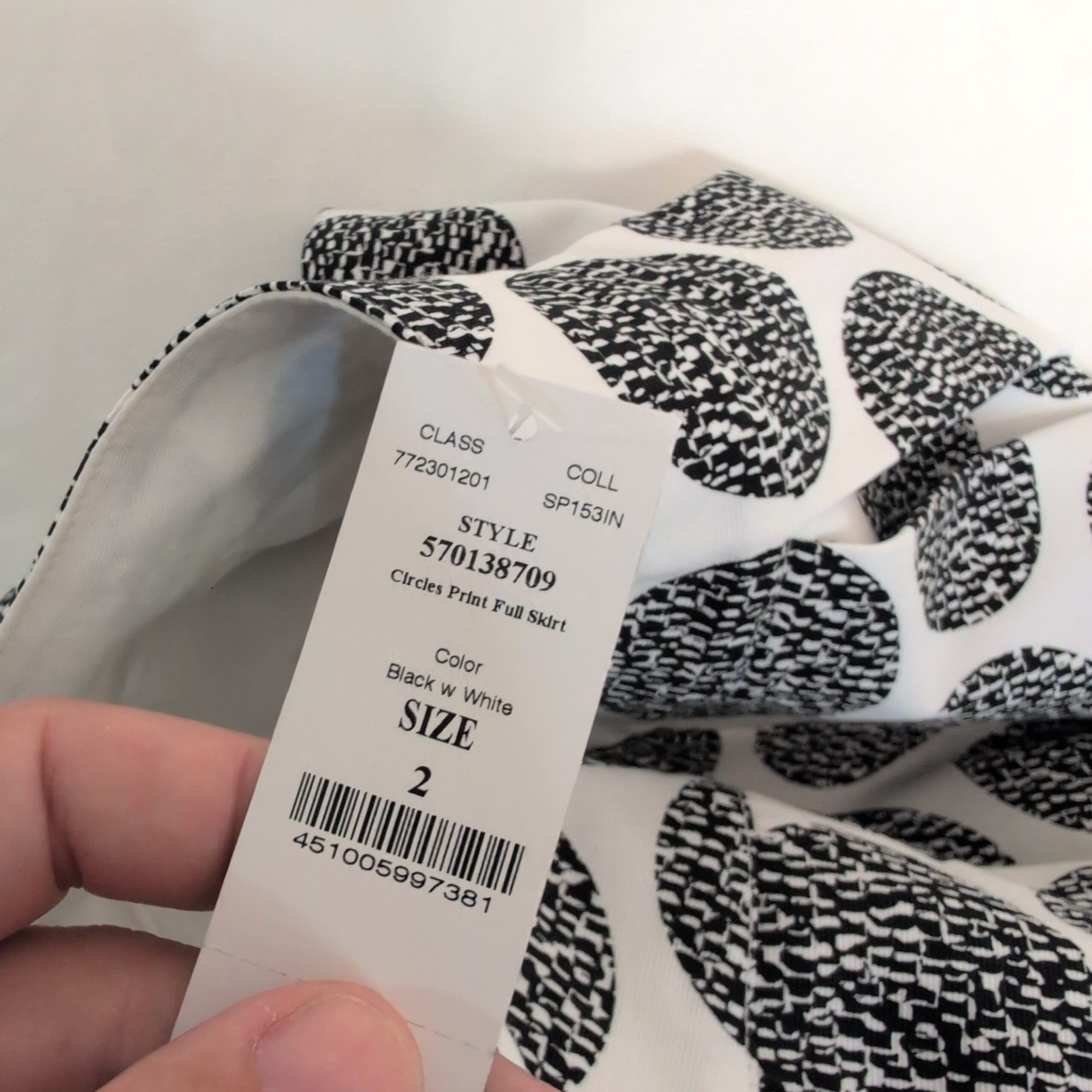 White House Black Market circle skater skirt in white with bold black textured dot print. Flared A-line silhouette with a fitted waist — perfect for work, brunch, or a night out. Size 2 (standard). New with tags; original MSRP $110.