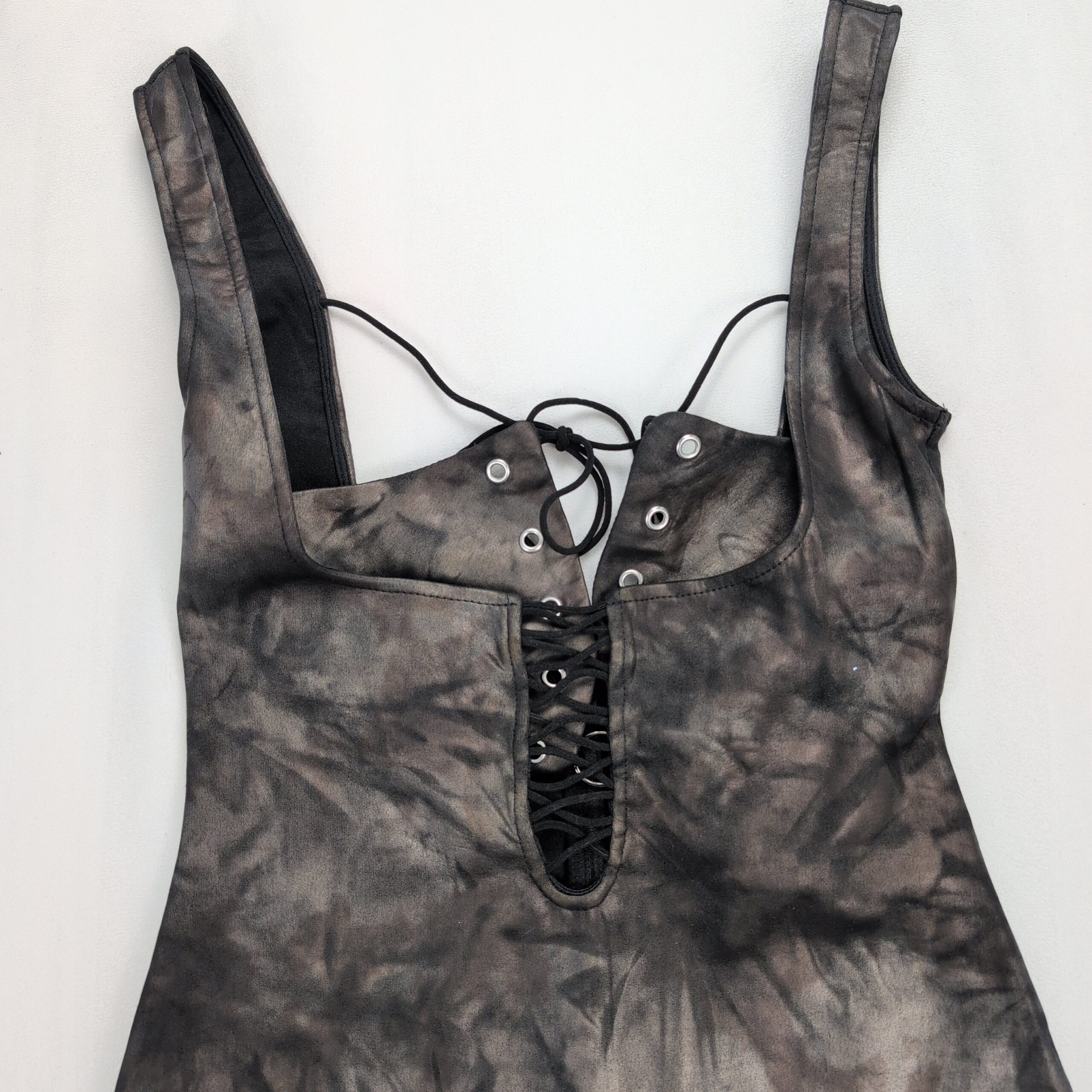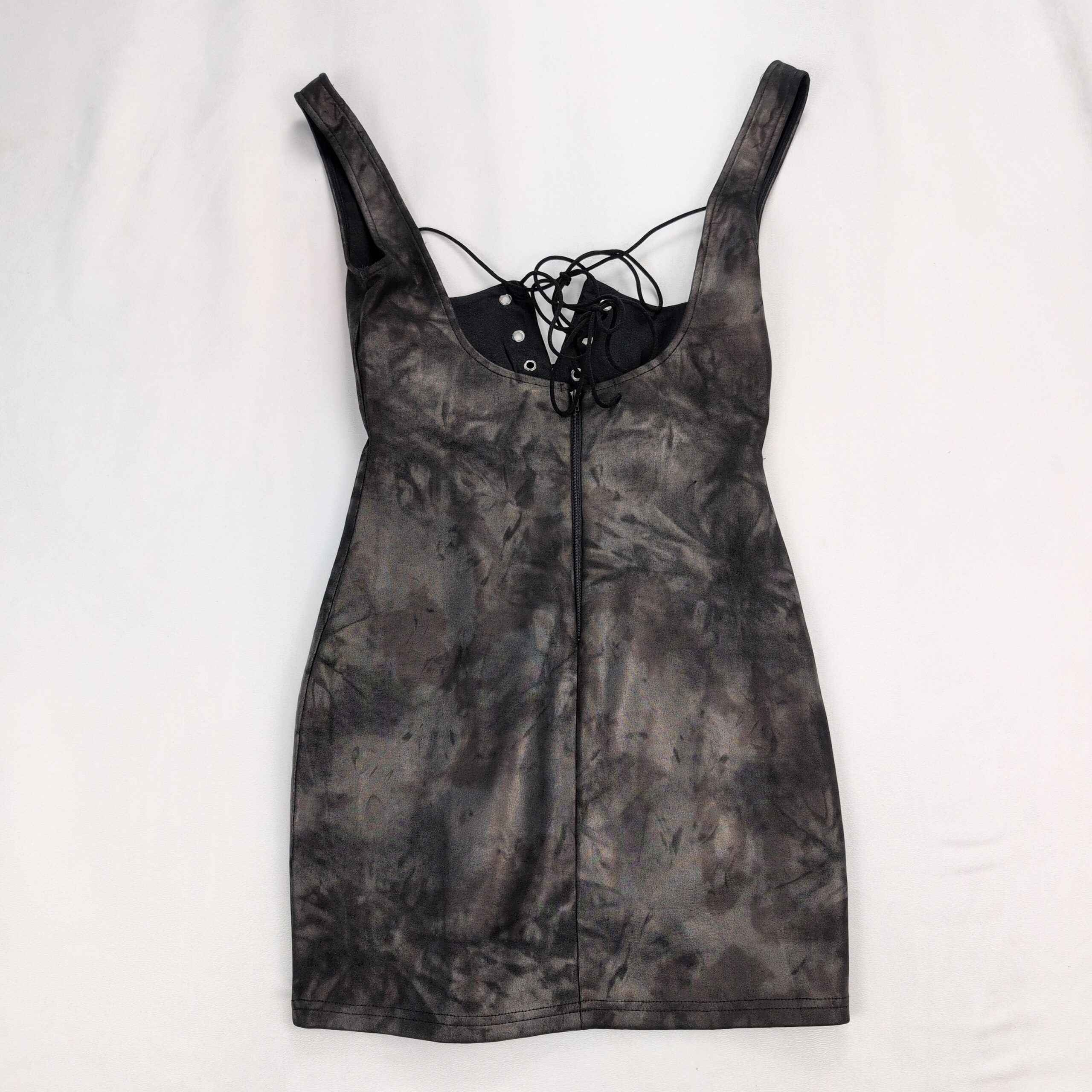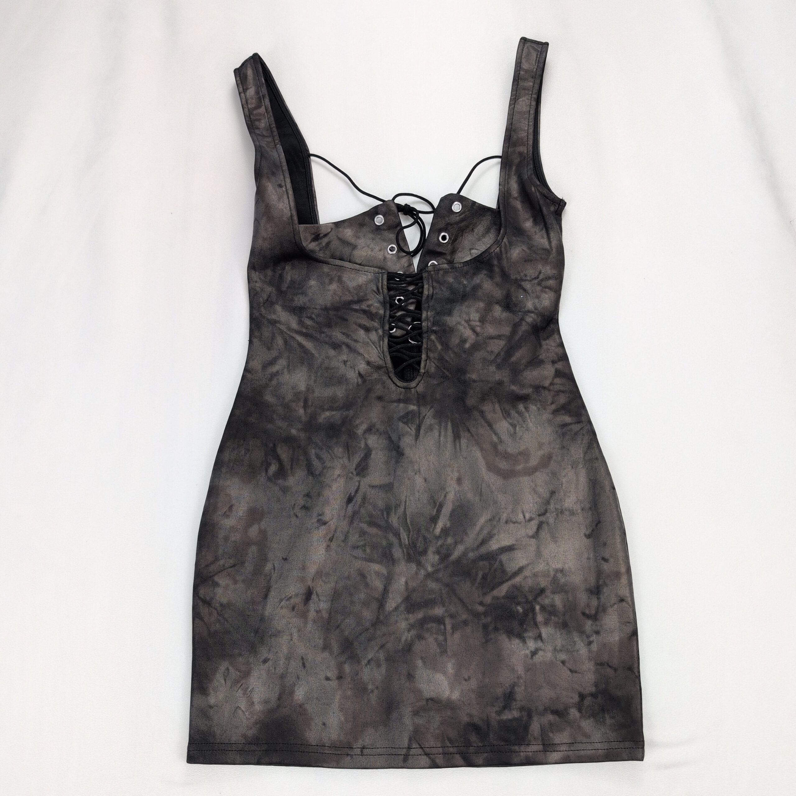 Windsor size S tie-dye lace-up bodycon mini dress in charcoal/black. Features a scoop neckline with grommet lace-up front, adjustable back tie, sleeveless straps, and a fitted mini silhouette — great for nights out or parties. Stretchy, figure-hugging fabric for a sleek look. Excellent used condition — free of major rips, tears, stains, or flaws; typical light wear may be present.