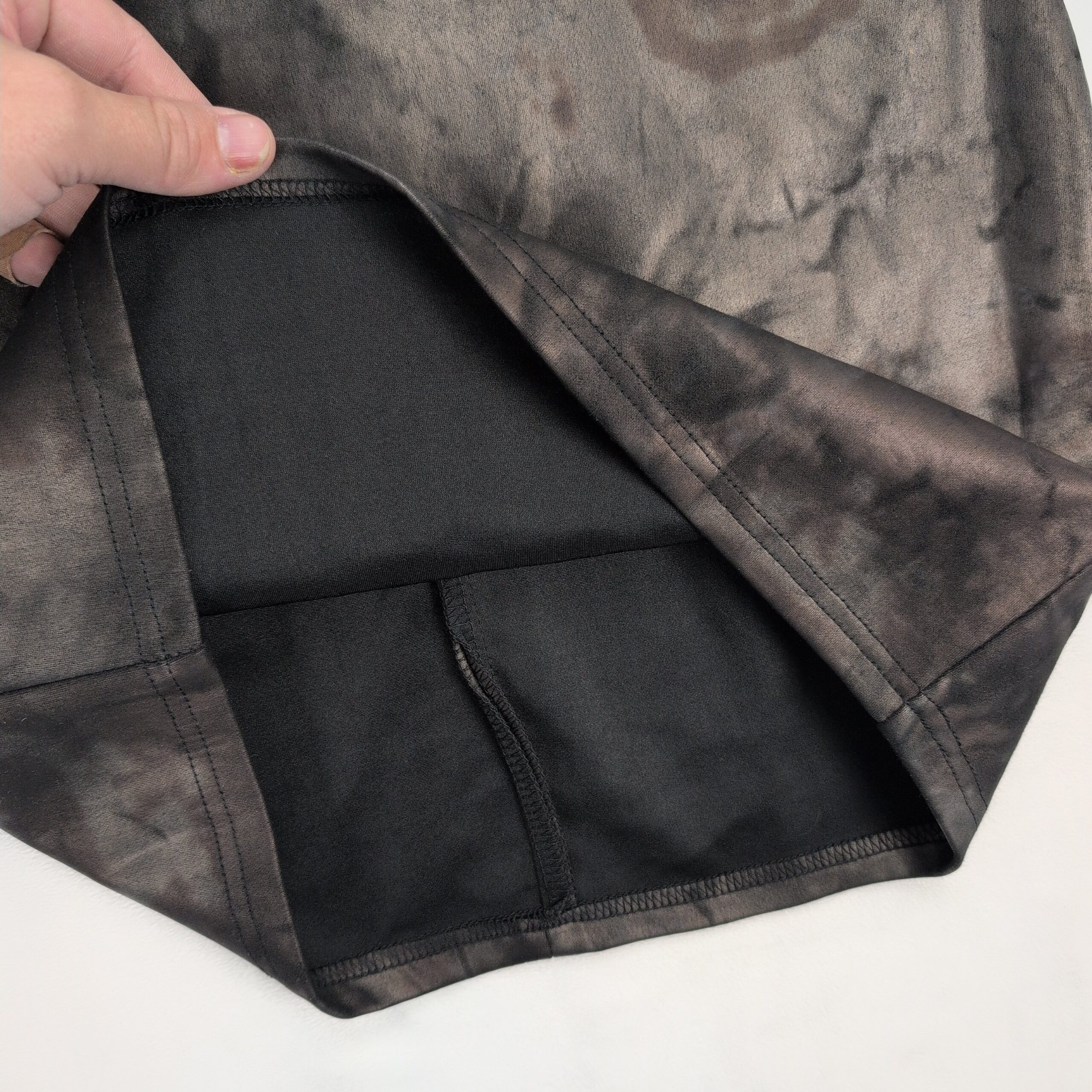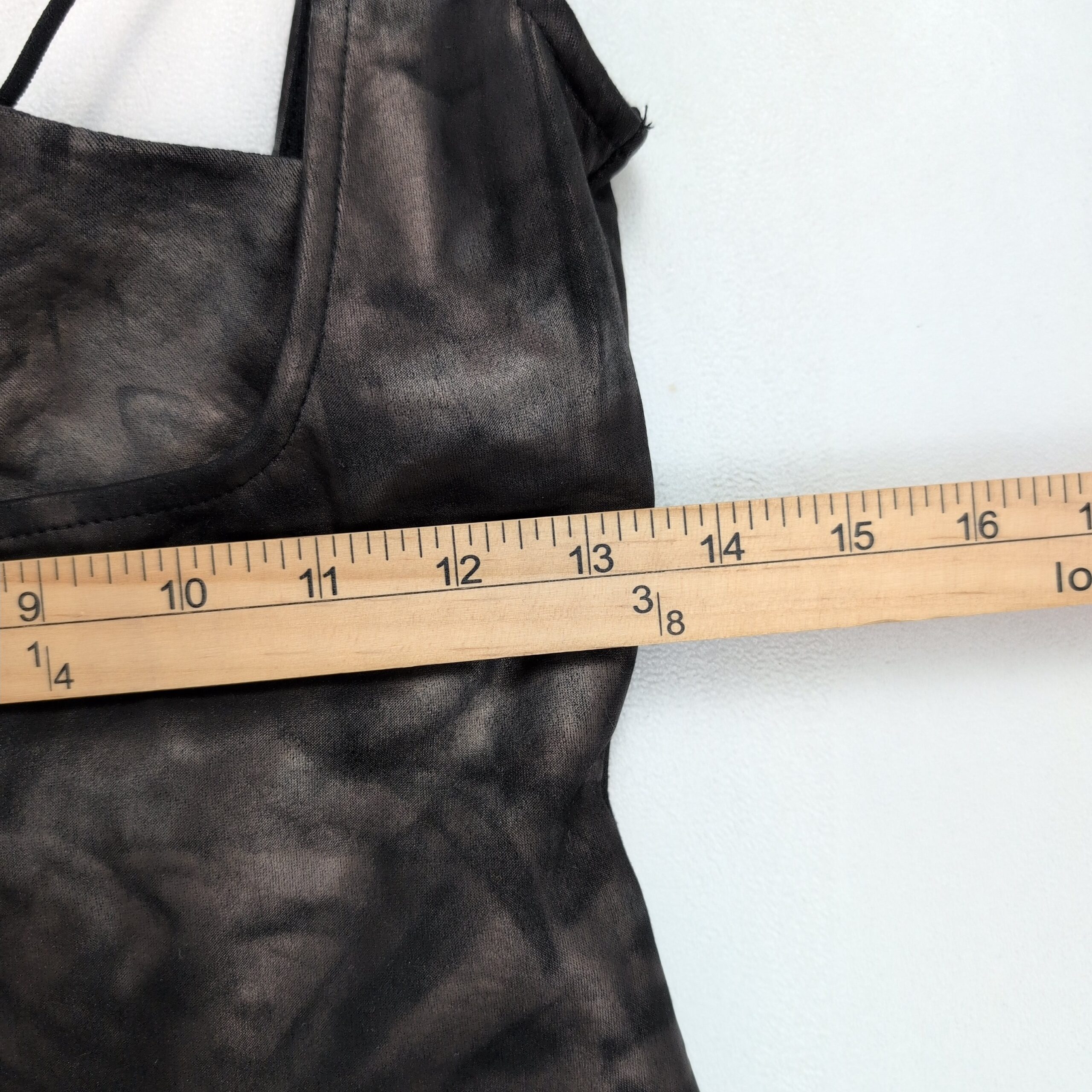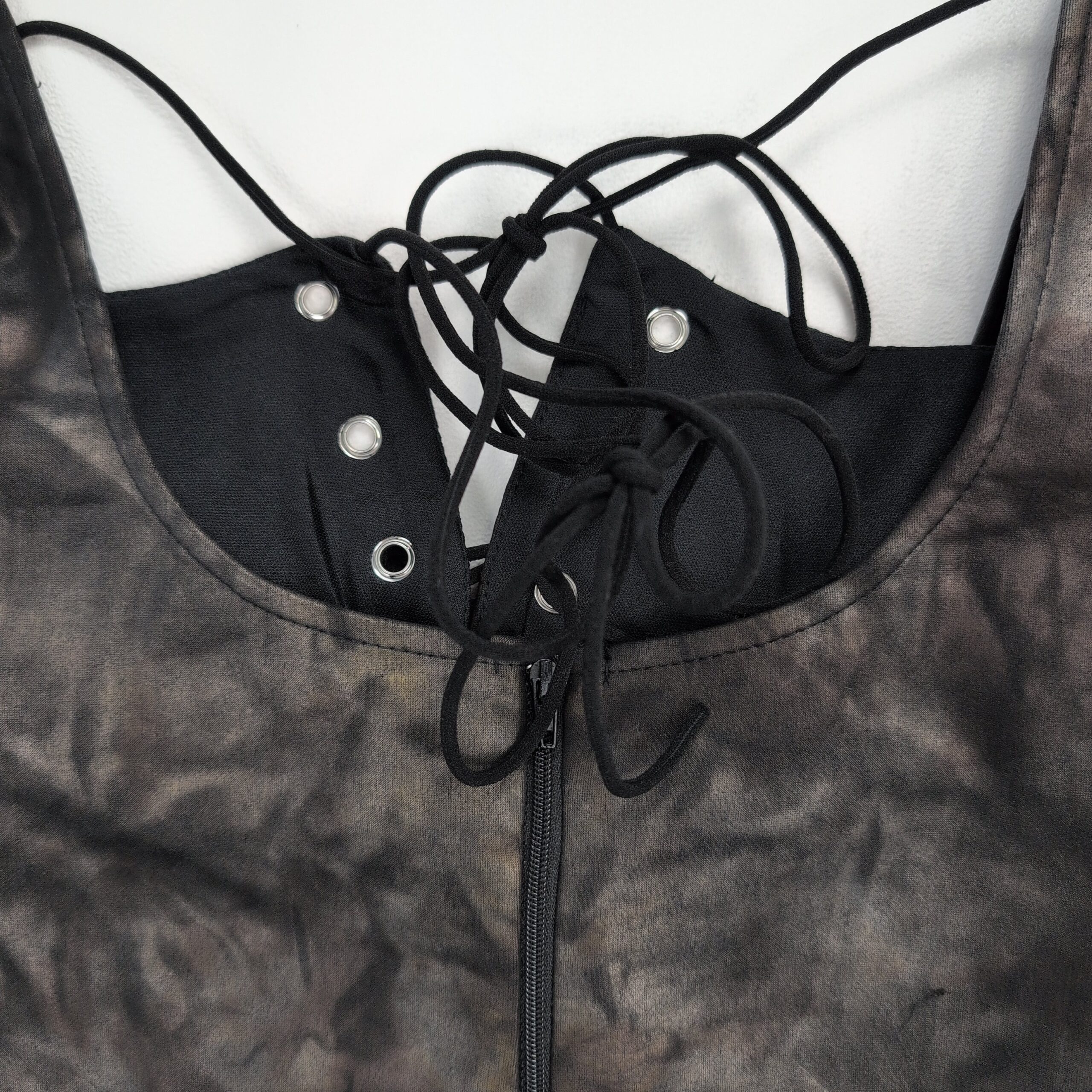 Windsor size S tie-dye lace-up bodycon mini dress in charcoal/black. Features a scoop neckline with grommet lace-up front, adjustable back tie, sleeveless straps, and a fitted mini silhouette — great for nights out or parties. Stretchy, figure-hugging fabric for a sleek look. Excellent used condition — free of major rips, tears, stains, or flaws; typical light wear may be present.