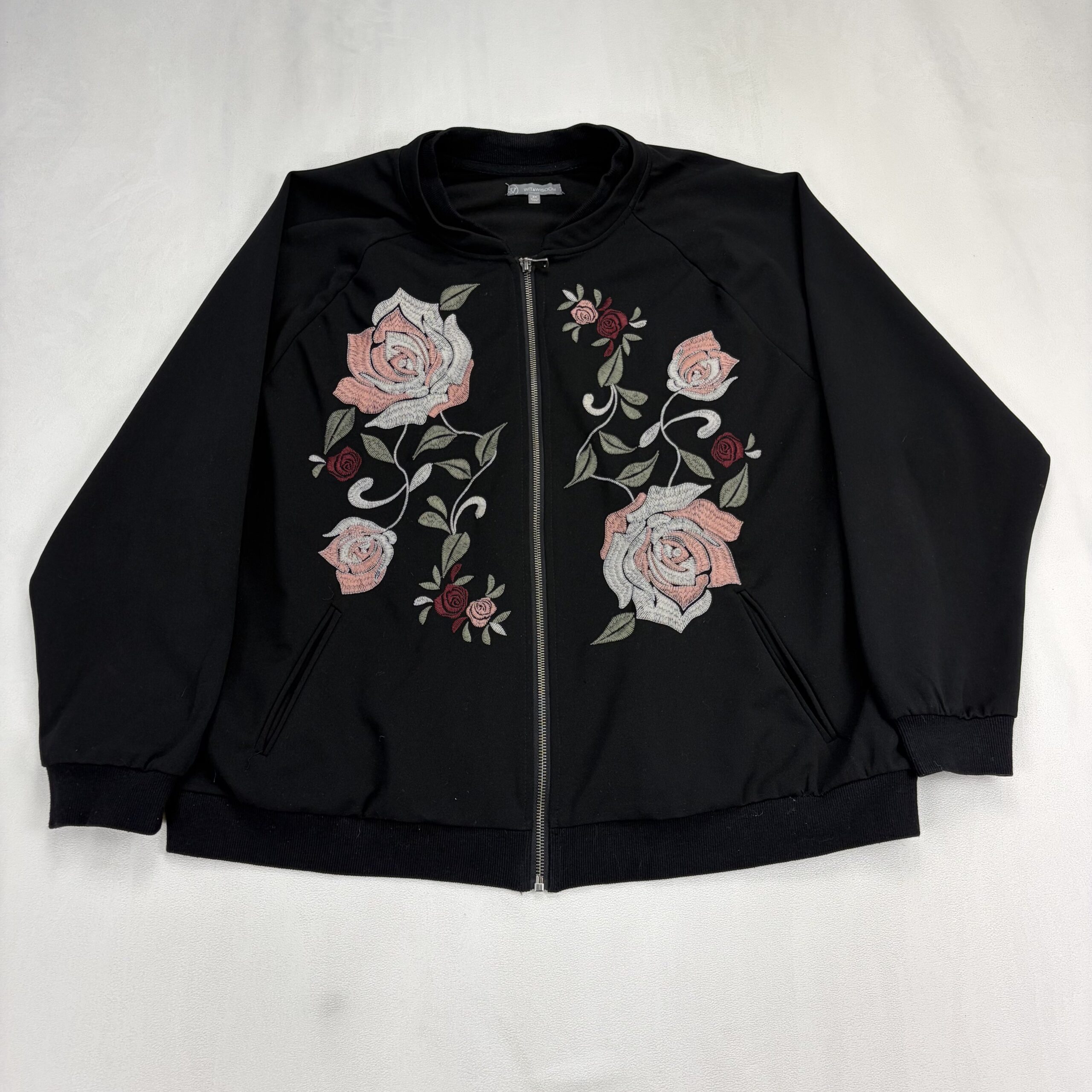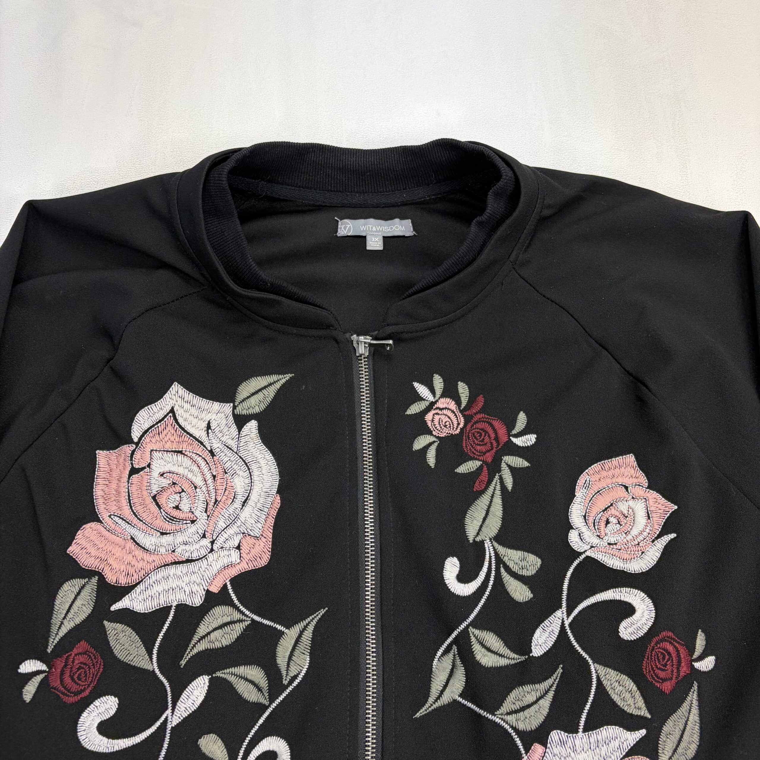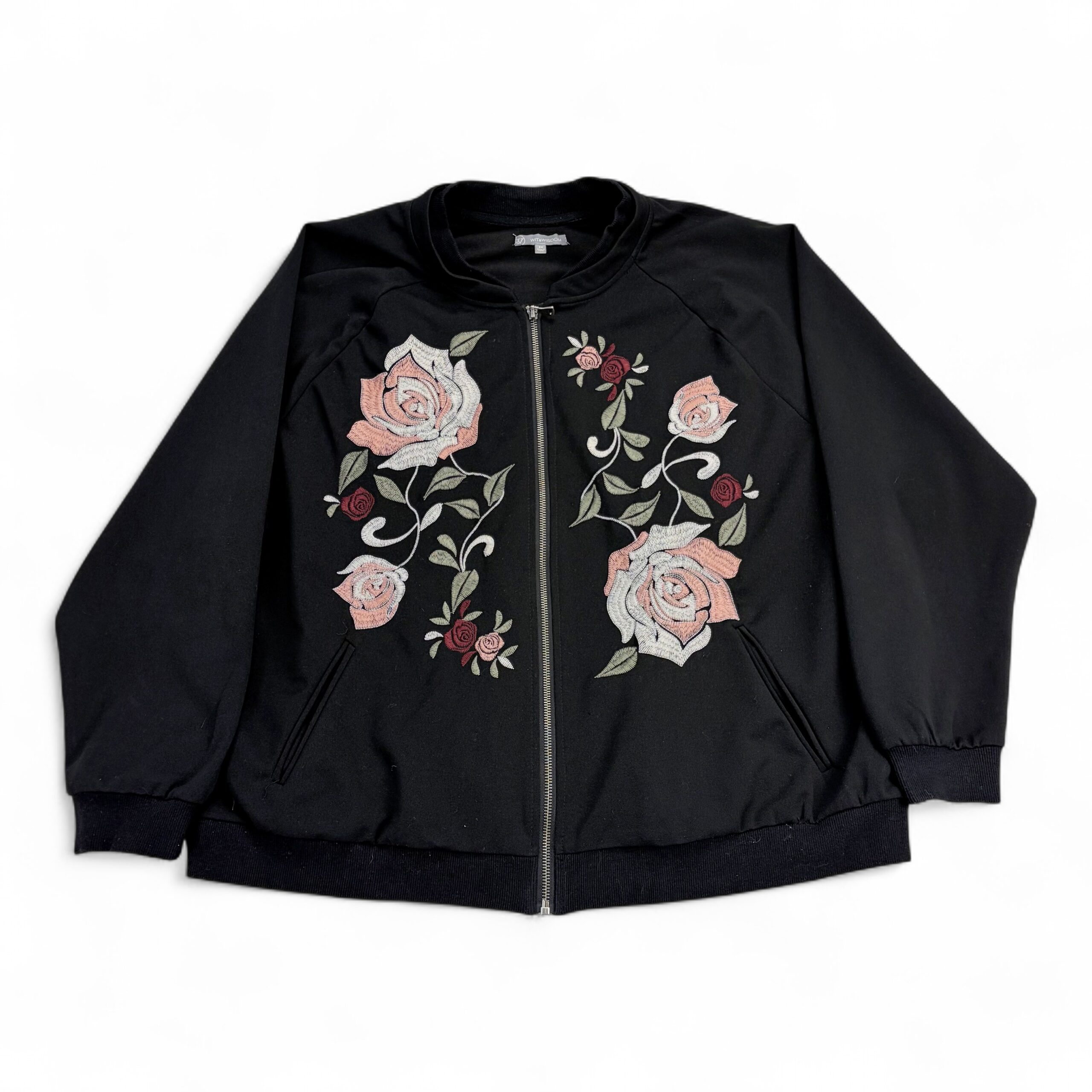 Wit & Wisdom women’s bomber-style zip jacket in size 3X (Plus). Black knit with full-length front zipper, ribbed collar, cuffs and hem, and front welt pockets. Features large pink and rosebud embroidery on both front panels — see photos for detail. Lightweight midweight layer perfect for transitional seasons. Excellent used condition; free of major rips, tears, stains, or flaws, with only typical gentle wear.