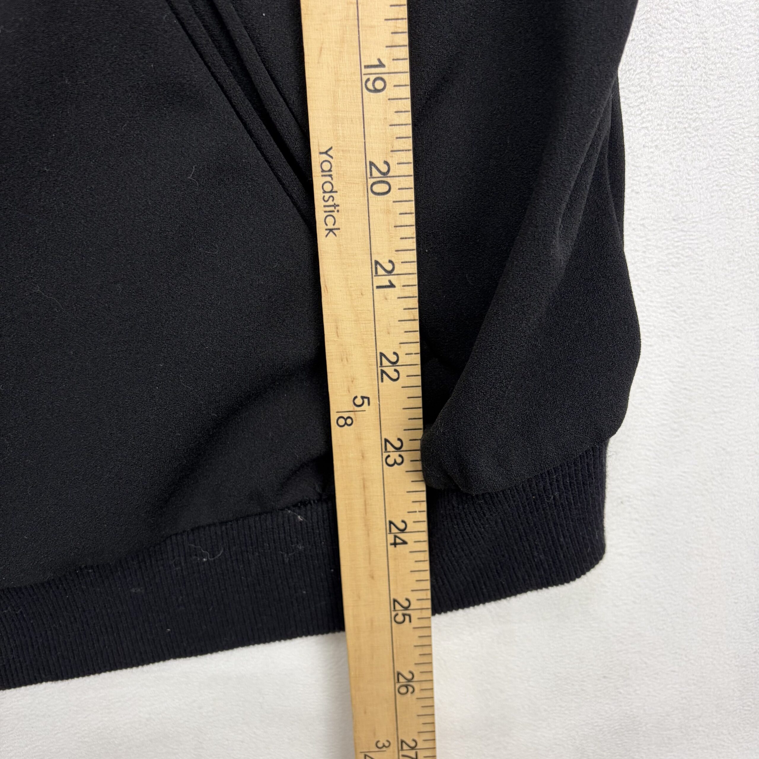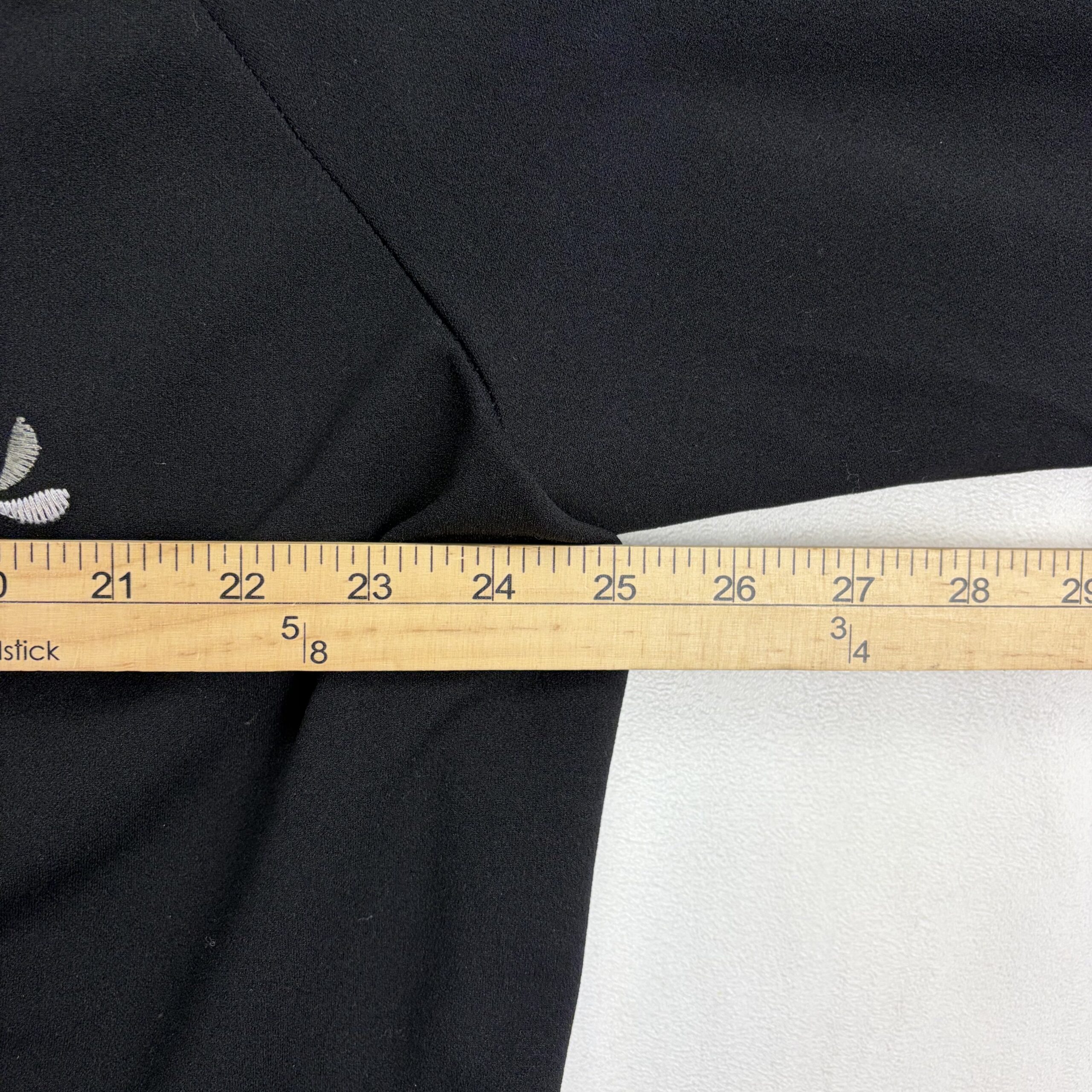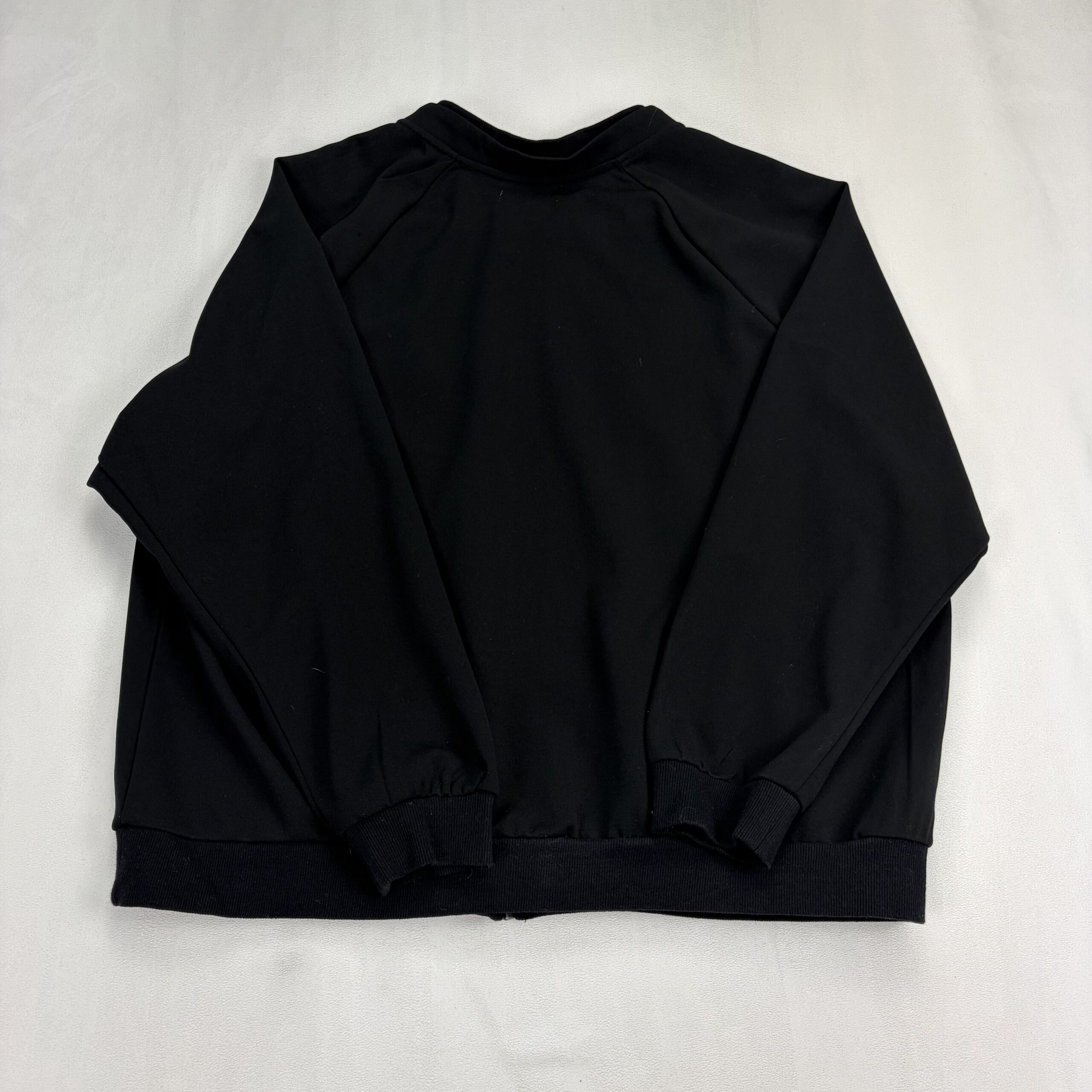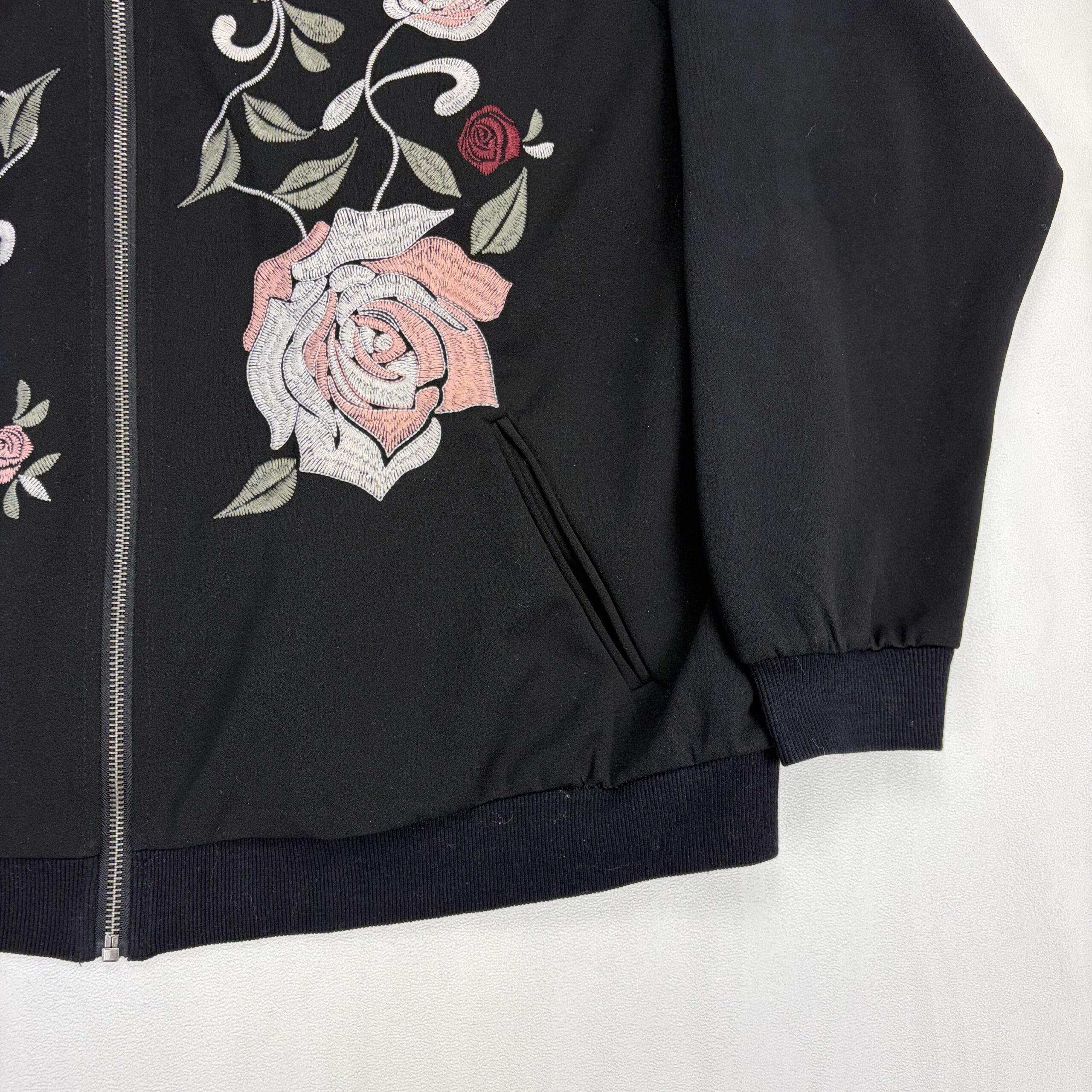 Wit & Wisdom women’s bomber-style zip jacket in size 3X (Plus). Black knit with full-length front zipper, ribbed collar, cuffs and hem, and front welt pockets. Features large pink and rosebud embroidery on both front panels — see photos for detail. Lightweight midweight layer perfect for transitional seasons. Excellent used condition; free of major rips, tears, stains, or flaws, with only typical gentle wear.