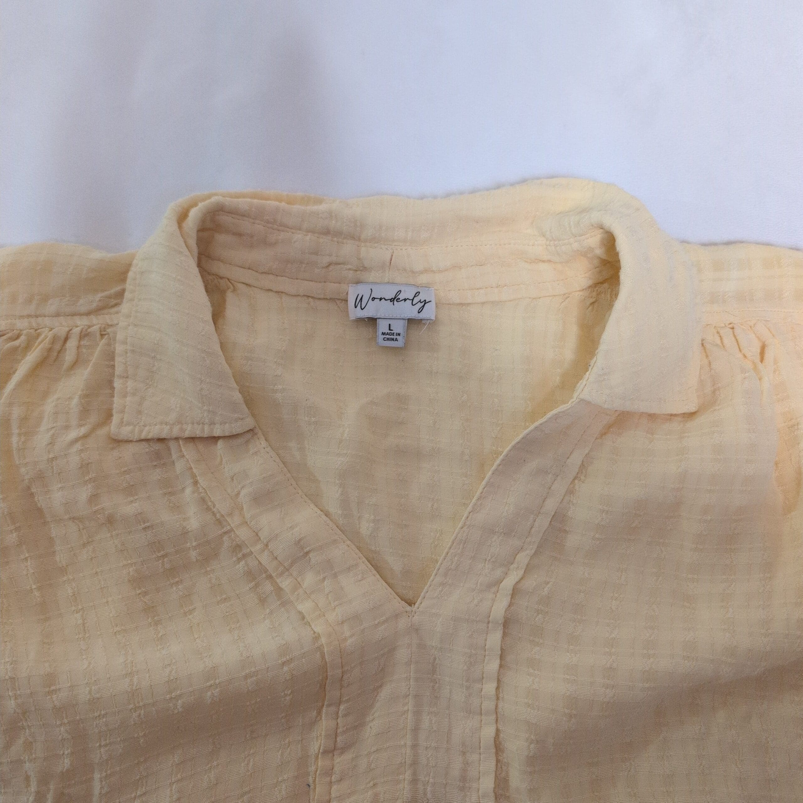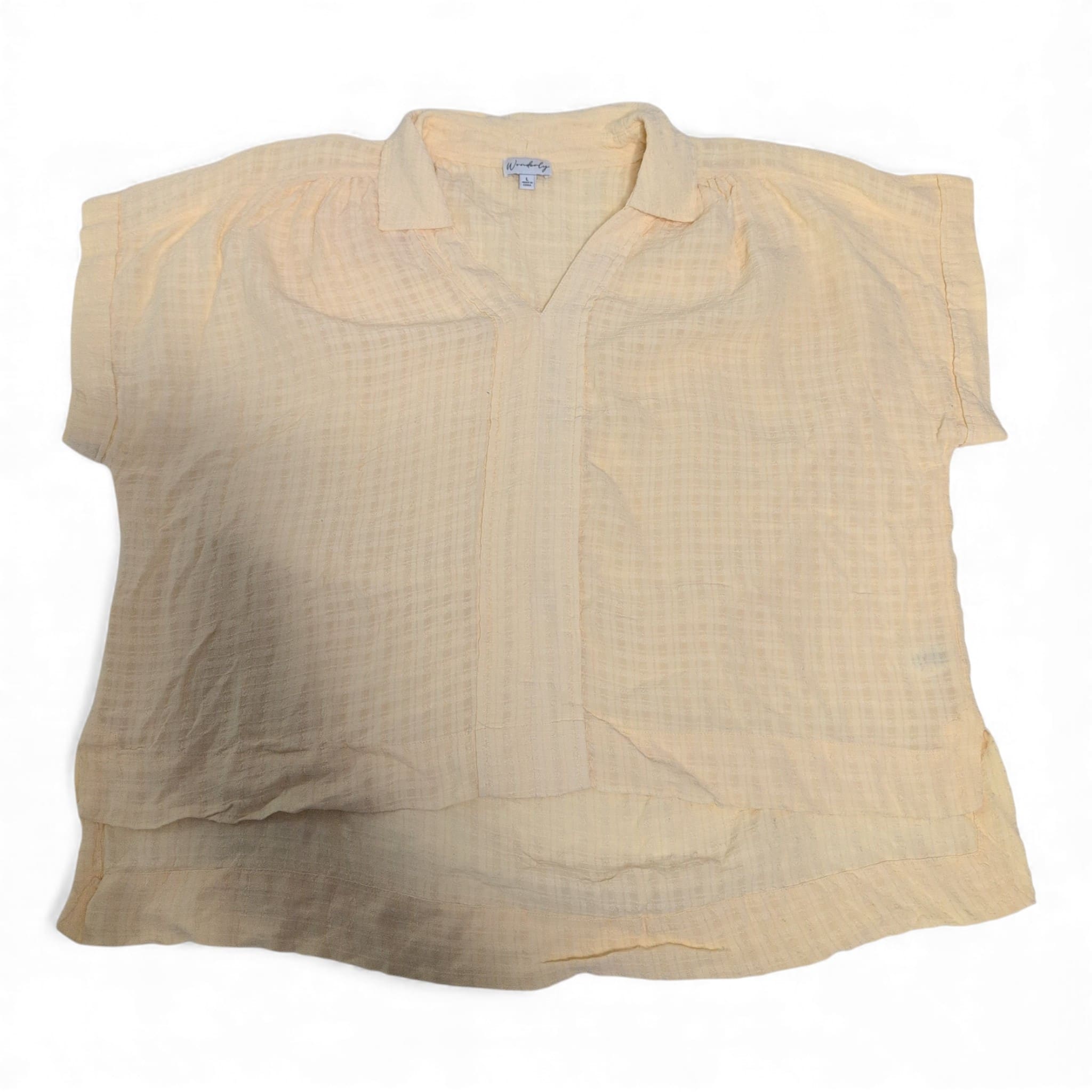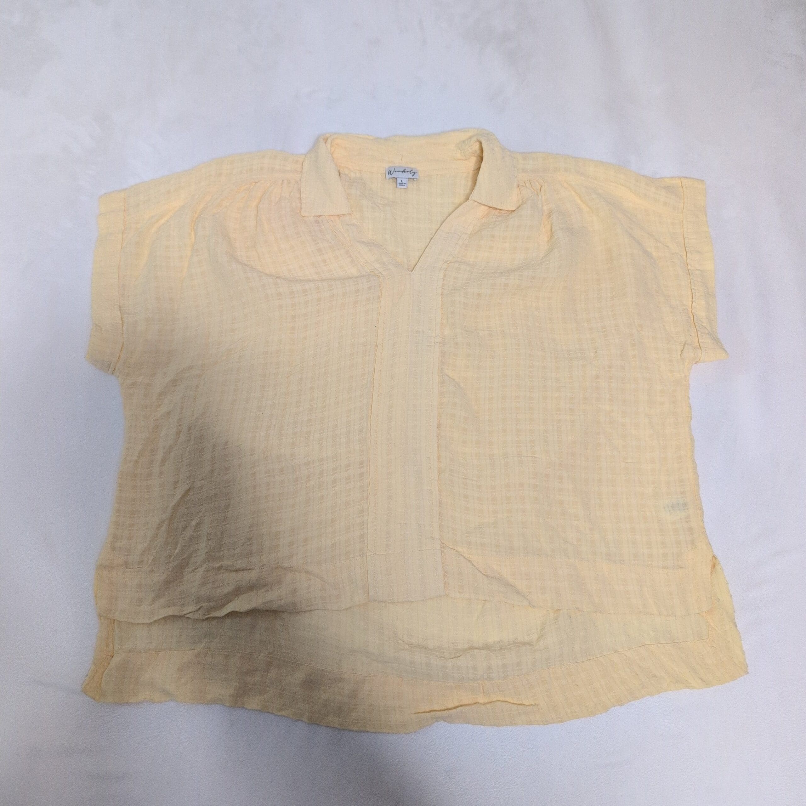 Lightweight Wonderly women’s blouse in soft yellow, size L. Relaxed, boxy fit with short sleeves, small collar and V-placket. Subtle gauze-like textured fabric with a layered hem and side slits for easy movement — ideal for casual summer outfits or layering. Gently used; fabric has natural crinkle texture and light wrinkles consistent with this style. Please review photos for color and condition details.