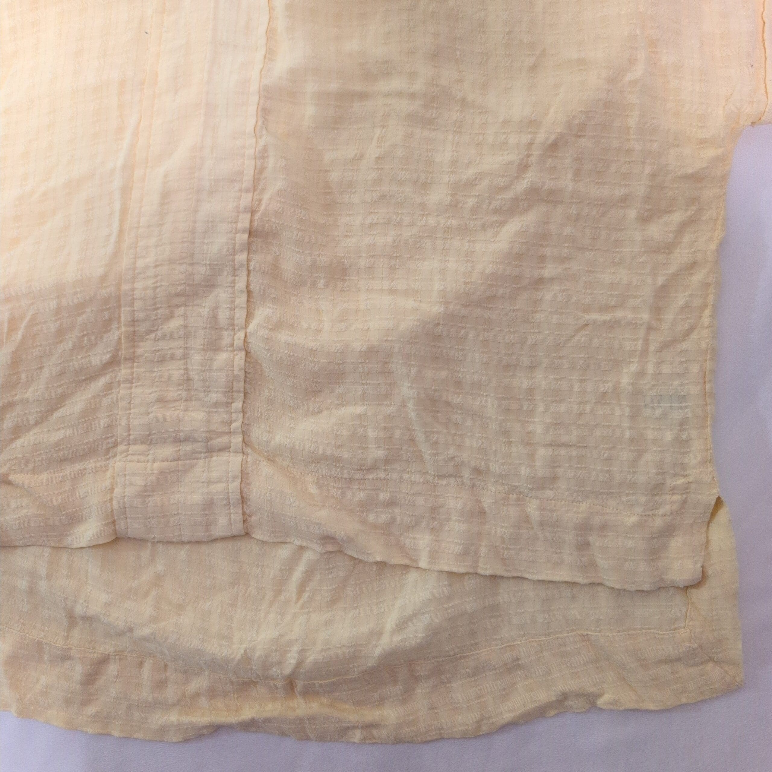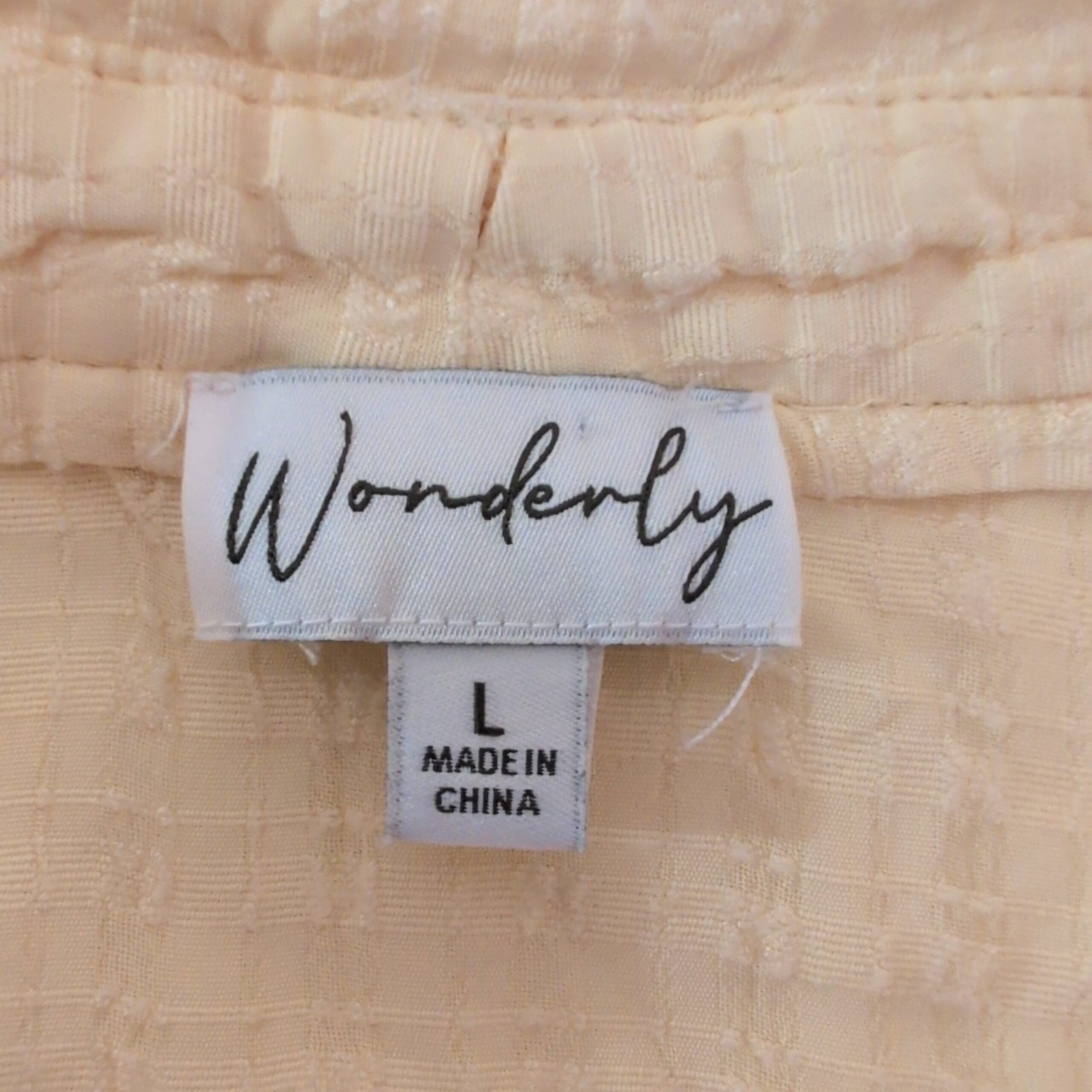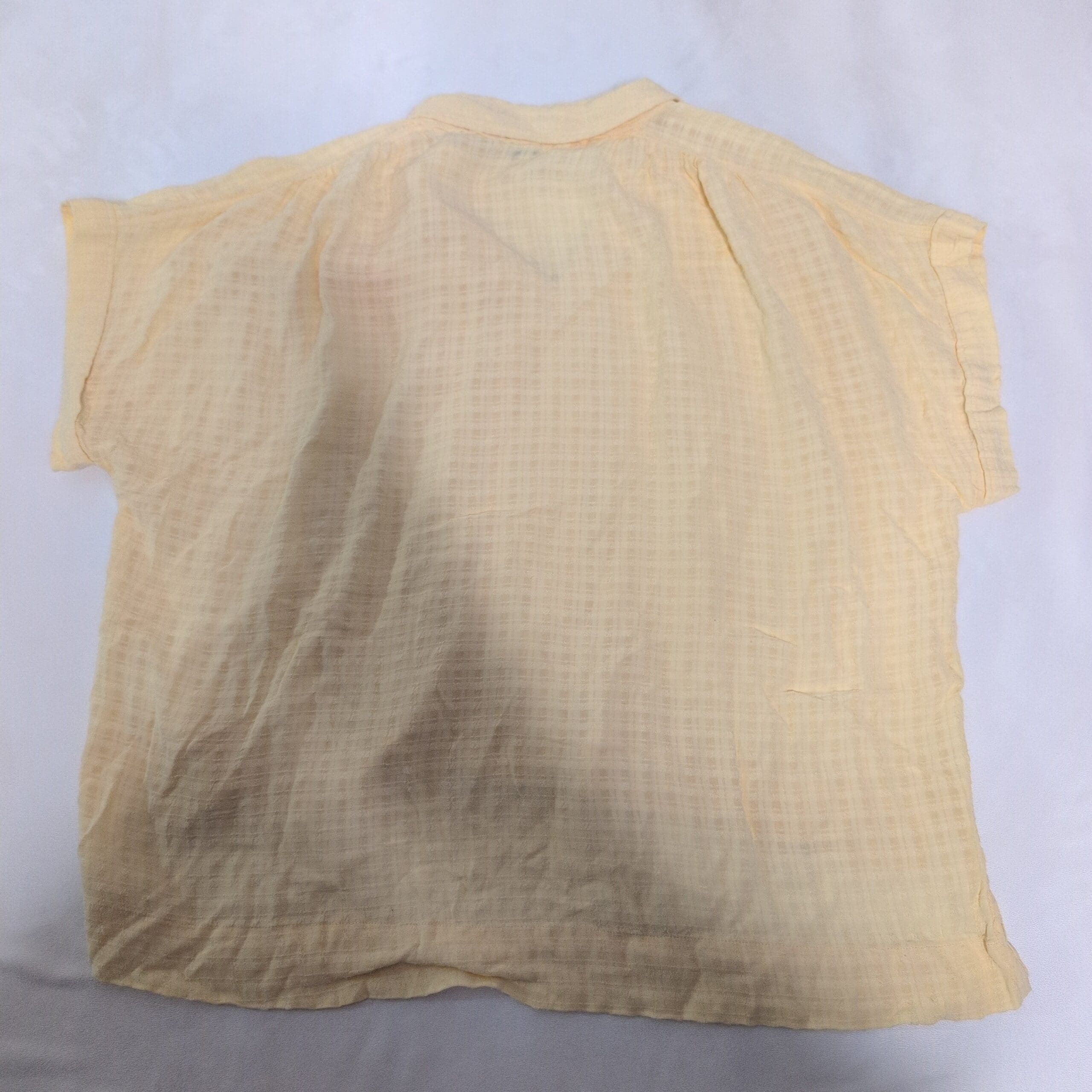 Lightweight Wonderly women’s blouse in soft yellow, size L. Relaxed, boxy fit with short sleeves, small collar and V-placket. Subtle gauze-like textured fabric with a layered hem and side slits for easy movement — ideal for casual summer outfits or layering. Gently used; fabric has natural crinkle texture and light wrinkles consistent with this style. Please review photos for color and condition details.