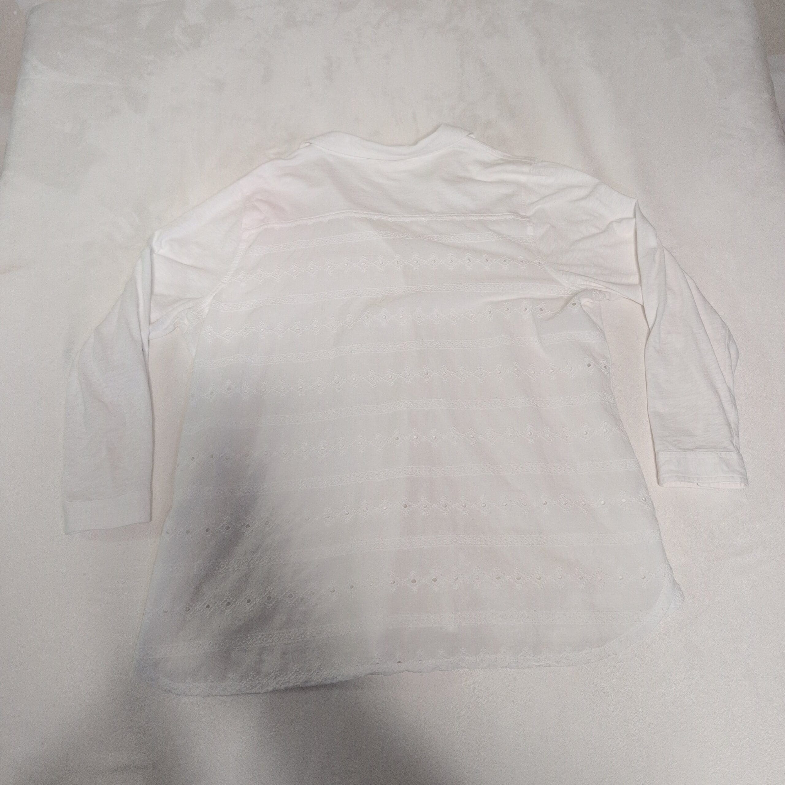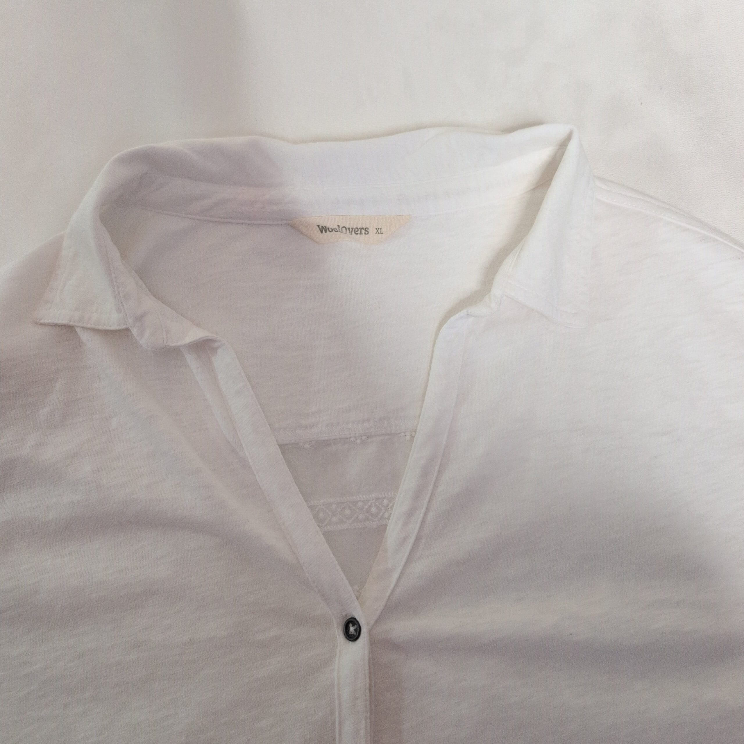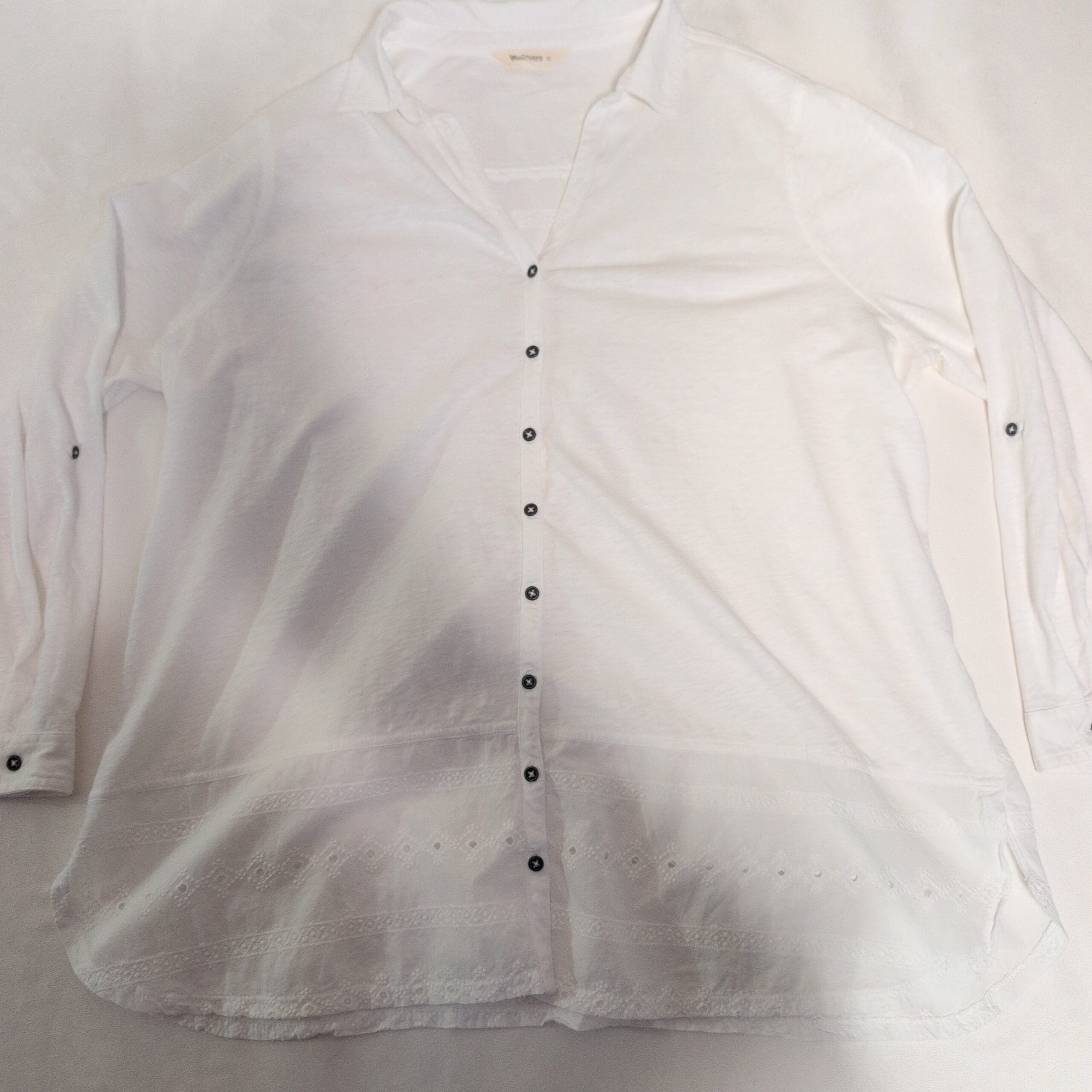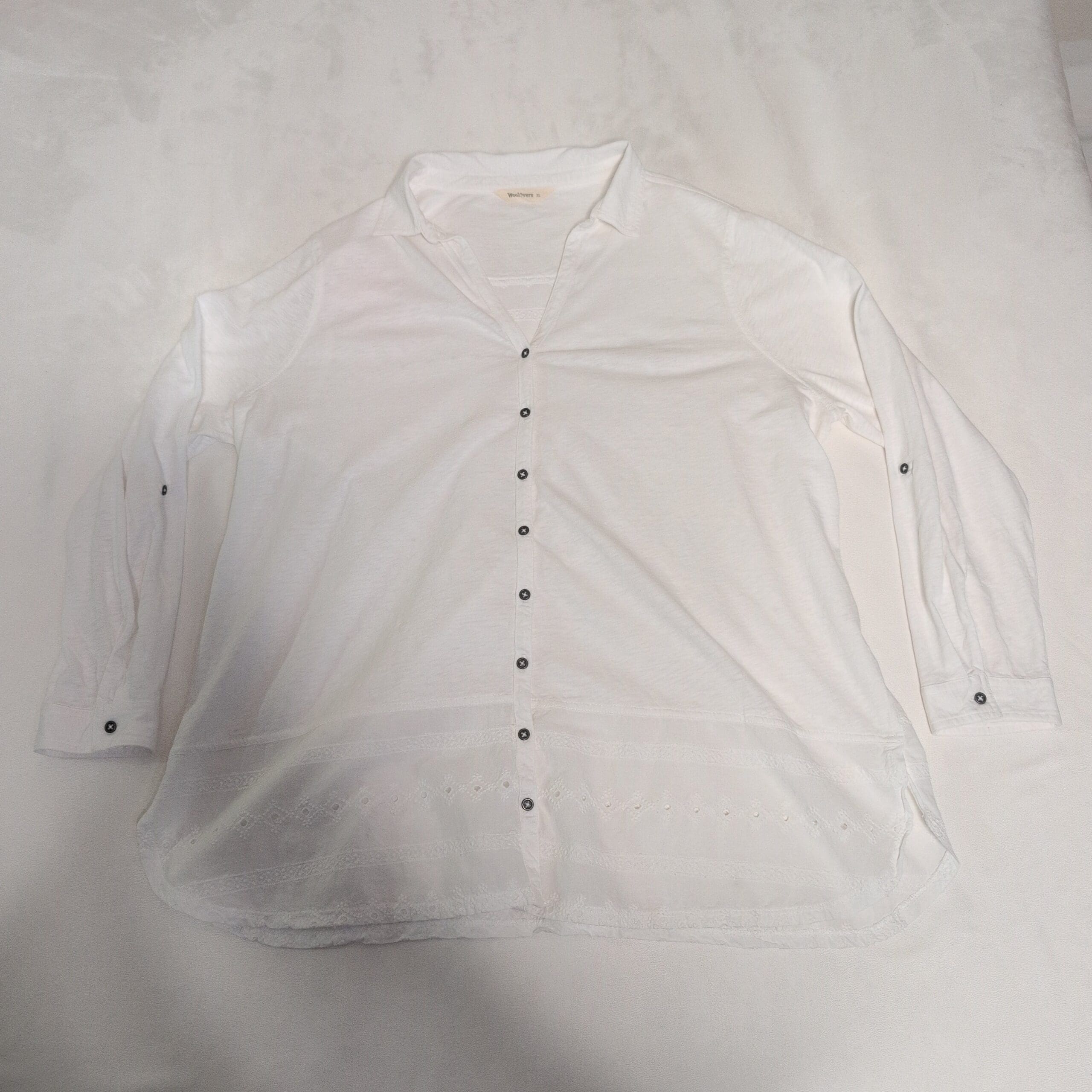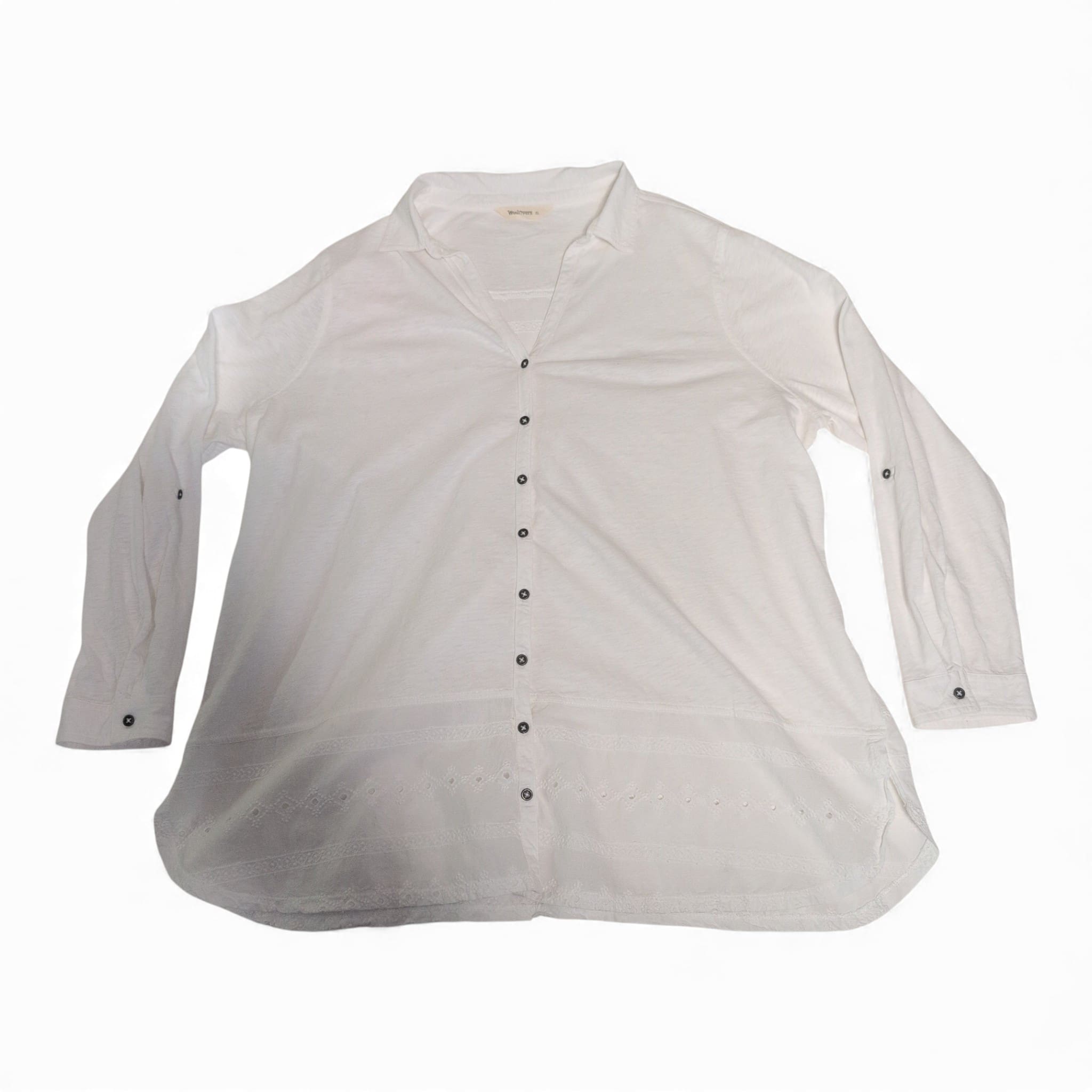 White WoolOvers women’s tunic in size XL. Lightweight, relaxed-fit button-front tunic with a soft collar and V-neck opening. Features full-length sleeves with roll-tab detail and contrasting dark buttons down the center. Sheer eyelet lace and embroidered trim along the high-low hem add feminine texture and breathability. Versatile for layering over leggings, skinny jeans or a slip dress for a casual, polished look. Pre-owned — excellent condition with no visible stains, snags, or missing buttons; see photos for details and the care label for fabric content and washing instructions.