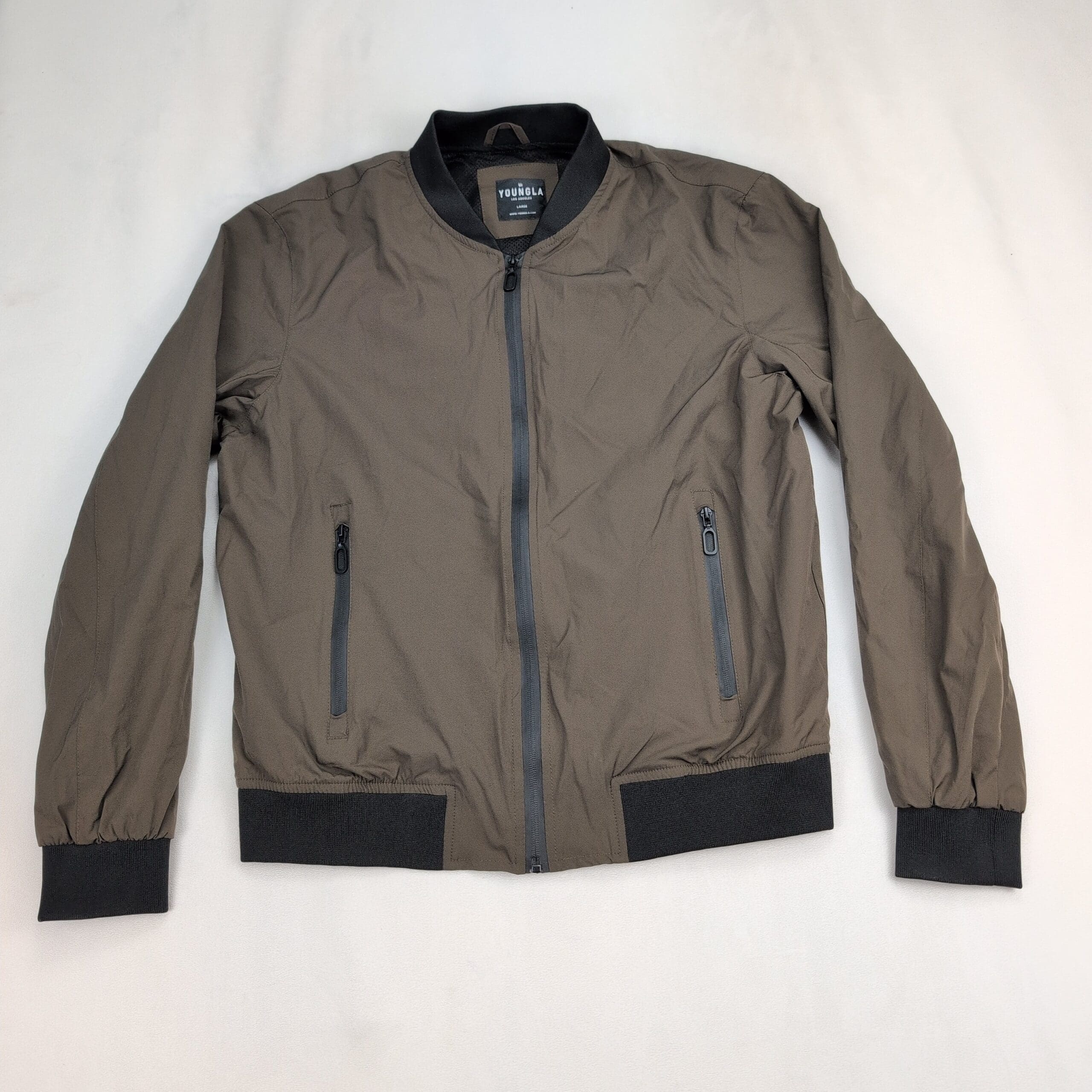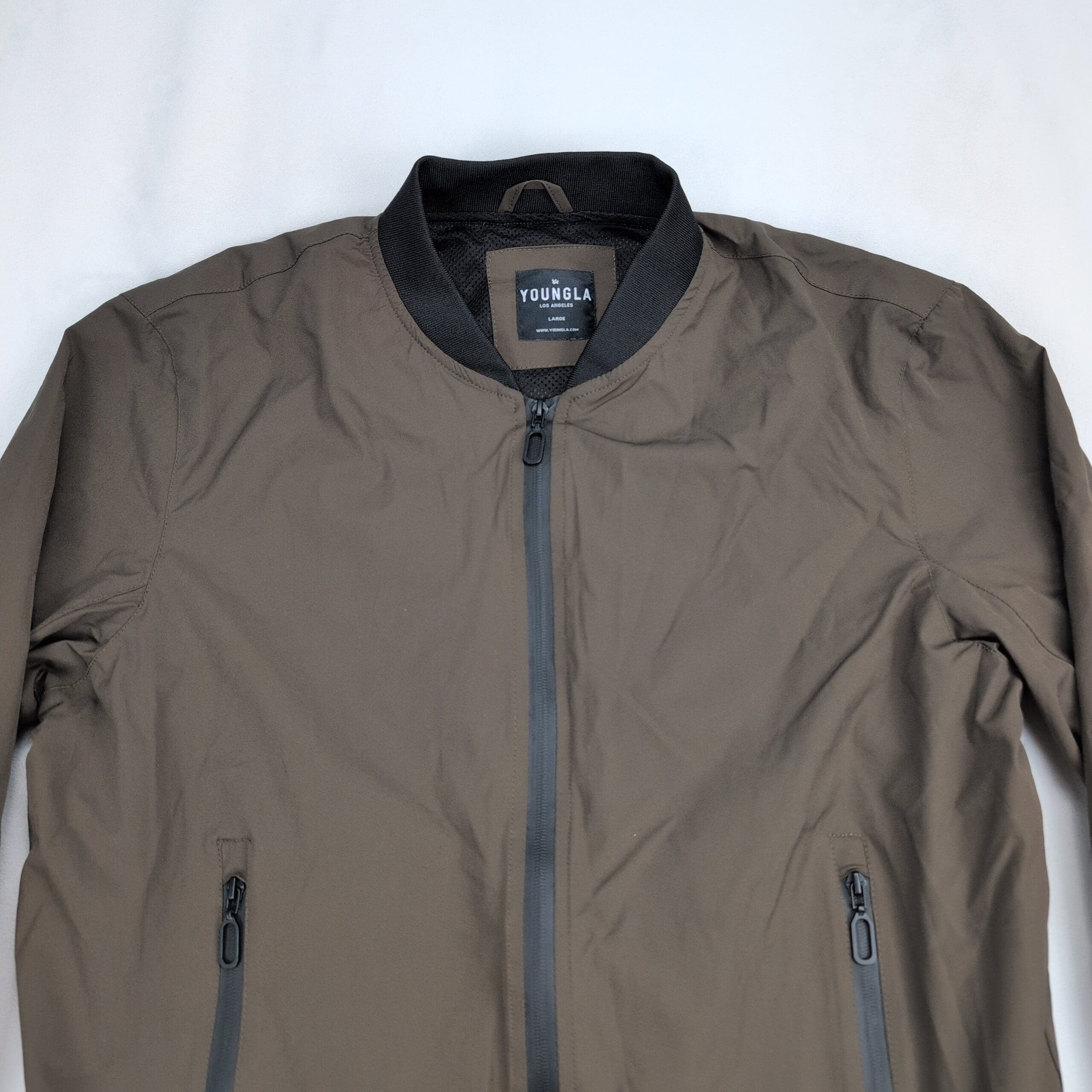 YoungLA men’s bomber jacket in olive/khaki, size L. Lightweight, casual style with full front zipper, two zippered hand pockets, and ribbed collar, cuffs, and hem. Clean interior and exterior; tag reads YoungLA L. Material not specified on tag.