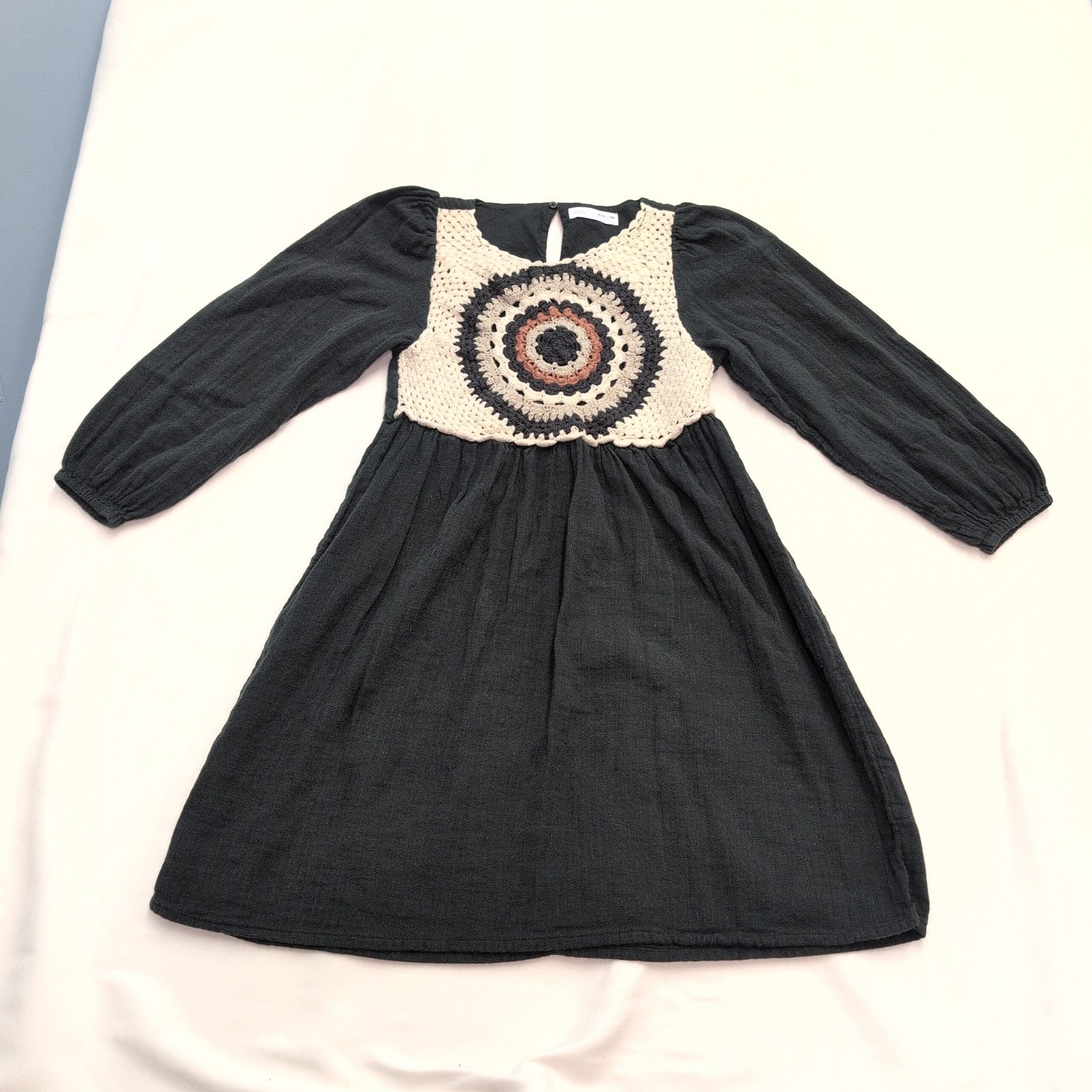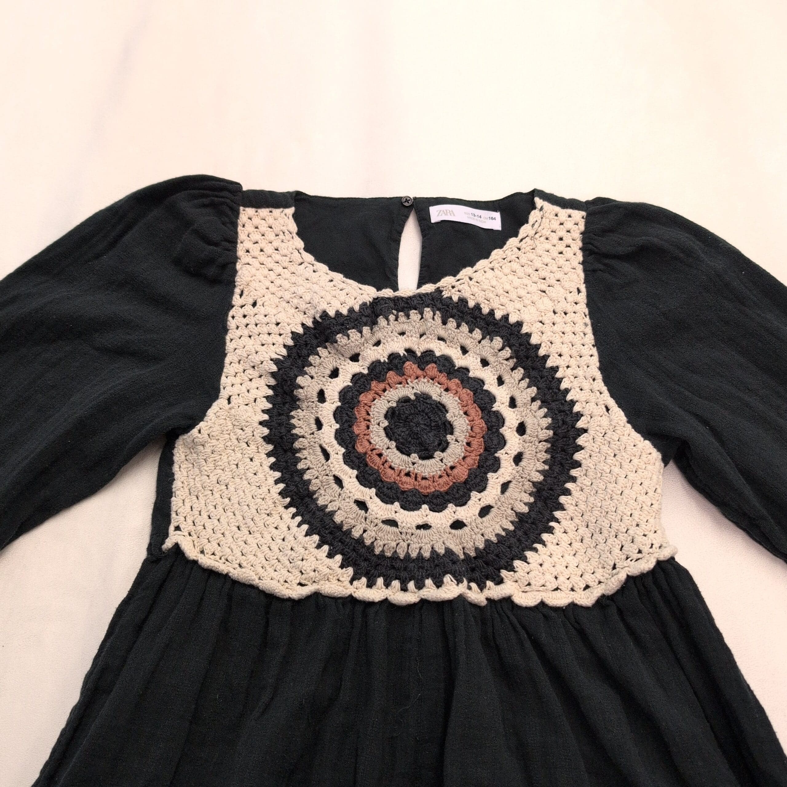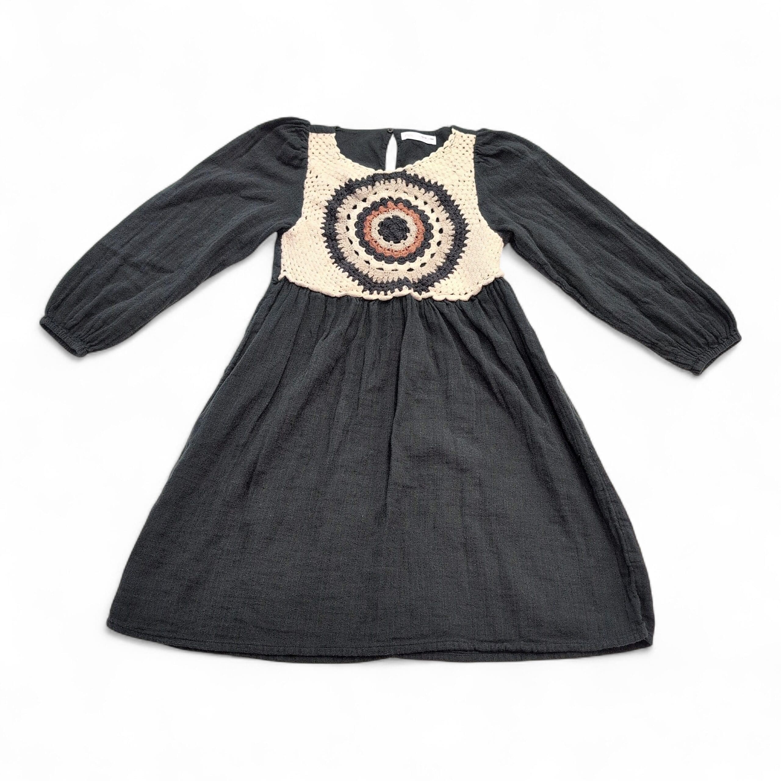 Black long-sleeve Zara dress, women’s size 14 (plus). Features a cream-and-black crochet medallion bodice with a gathered waist that creates a relaxed A-line skirt. Elasticized cuffs and a small keyhole back closure add subtle details. Lightweight textured fabric with a bohemian vibe—ideal for everyday wear or layering for cooler weather.
