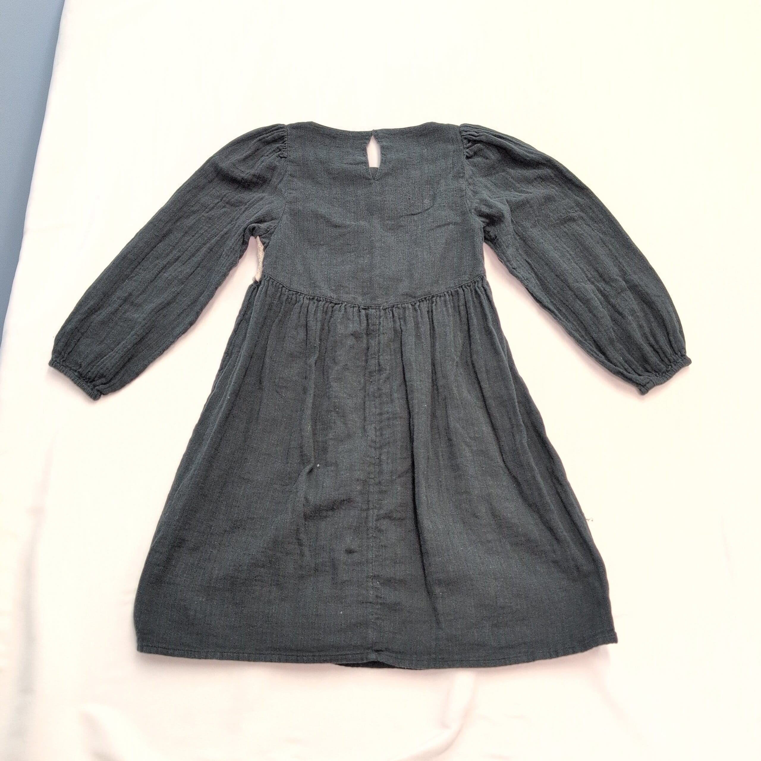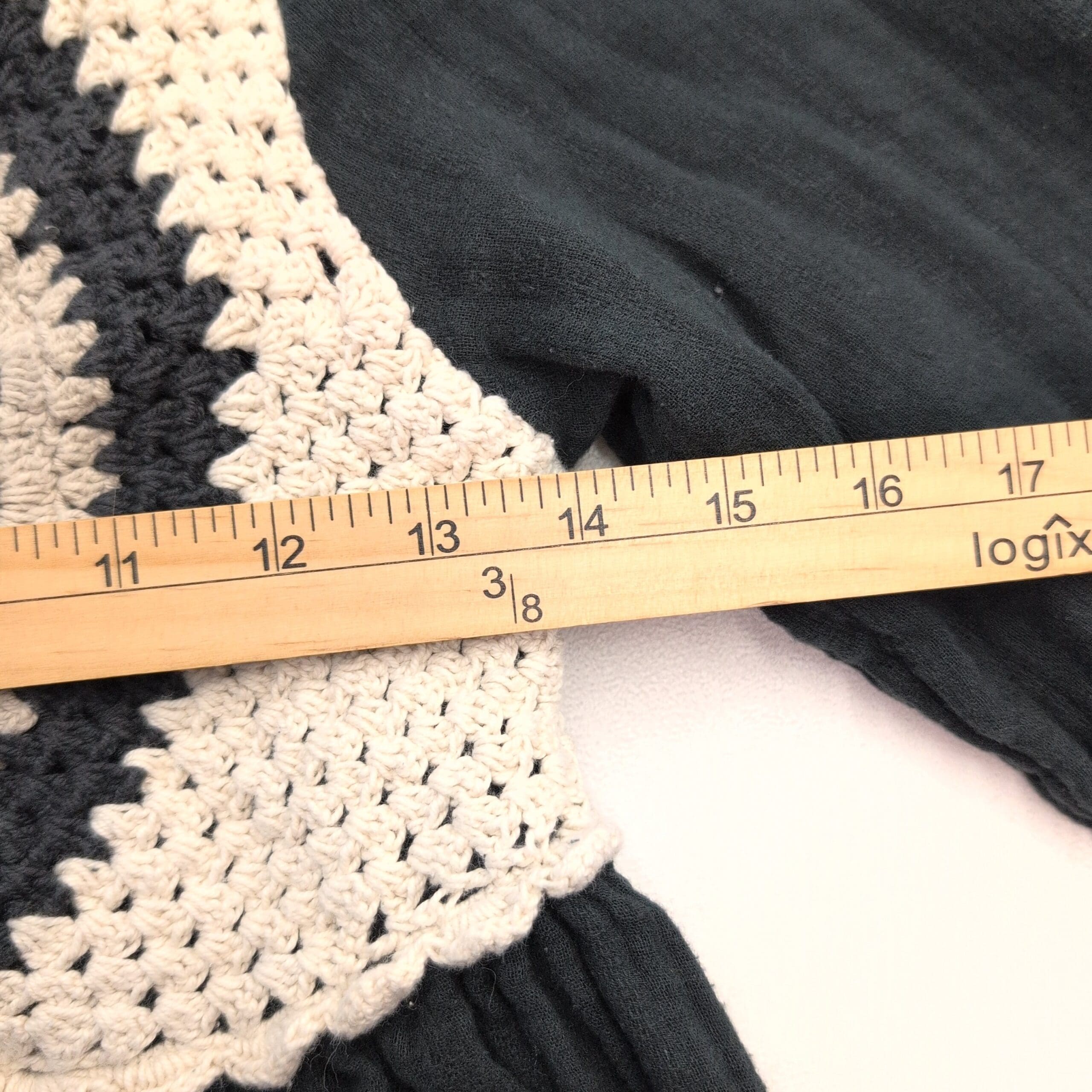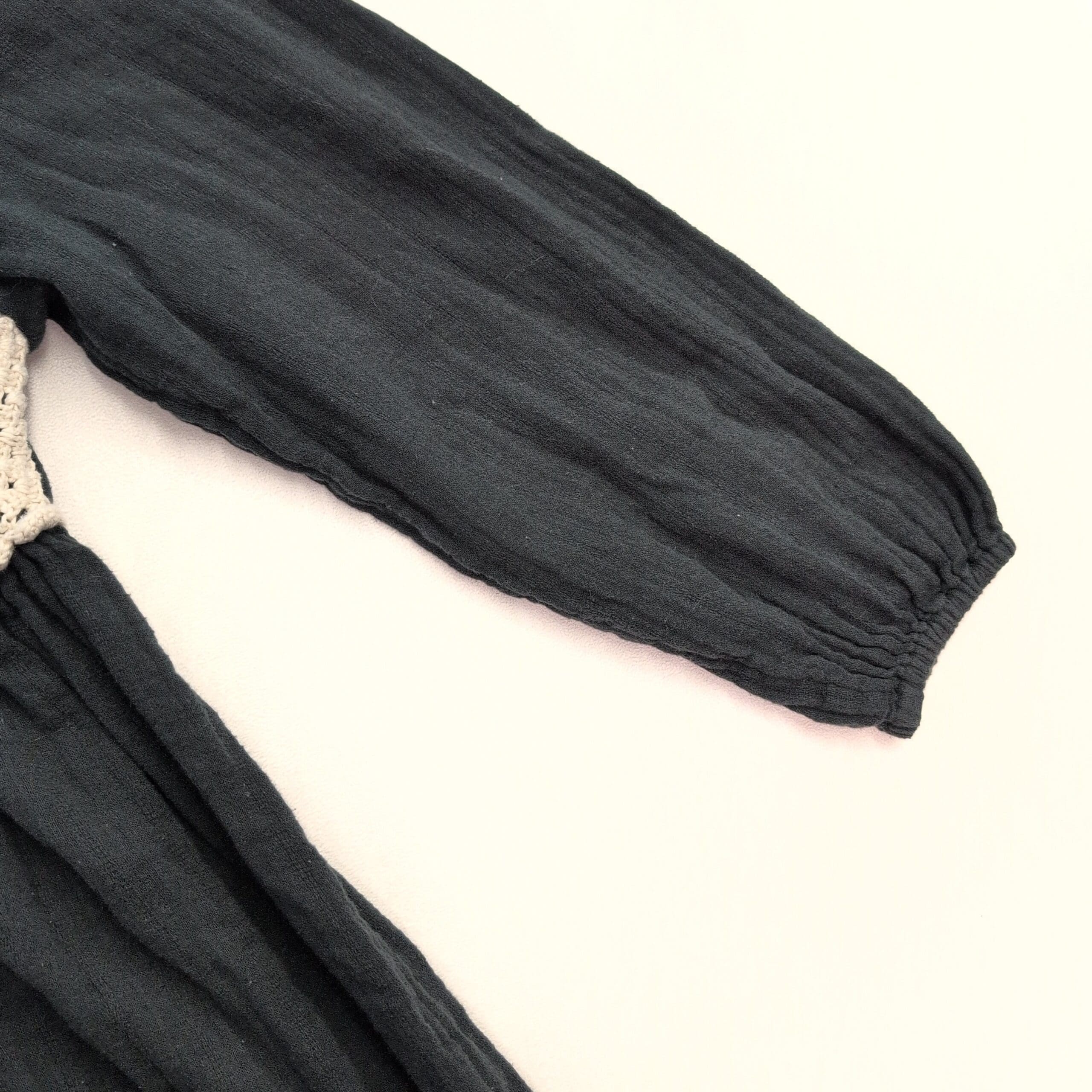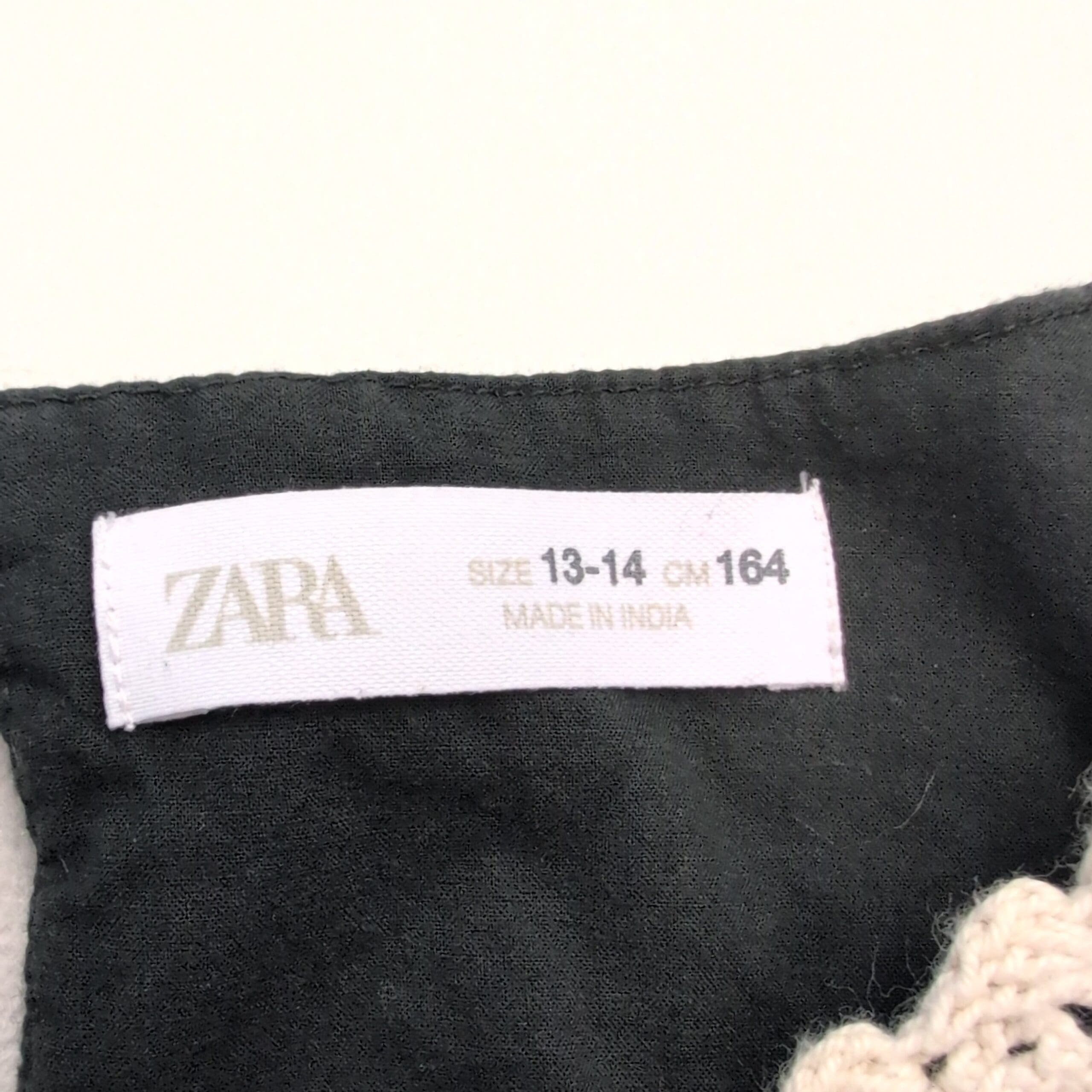 Black long-sleeve Zara dress, women’s size 14 (plus). Features a cream-and-black crochet medallion bodice with a gathered waist that creates a relaxed A-line skirt. Elasticized cuffs and a small keyhole back closure add subtle details. Lightweight textured fabric with a bohemian vibe—ideal for everyday wear or layering for cooler weather.
