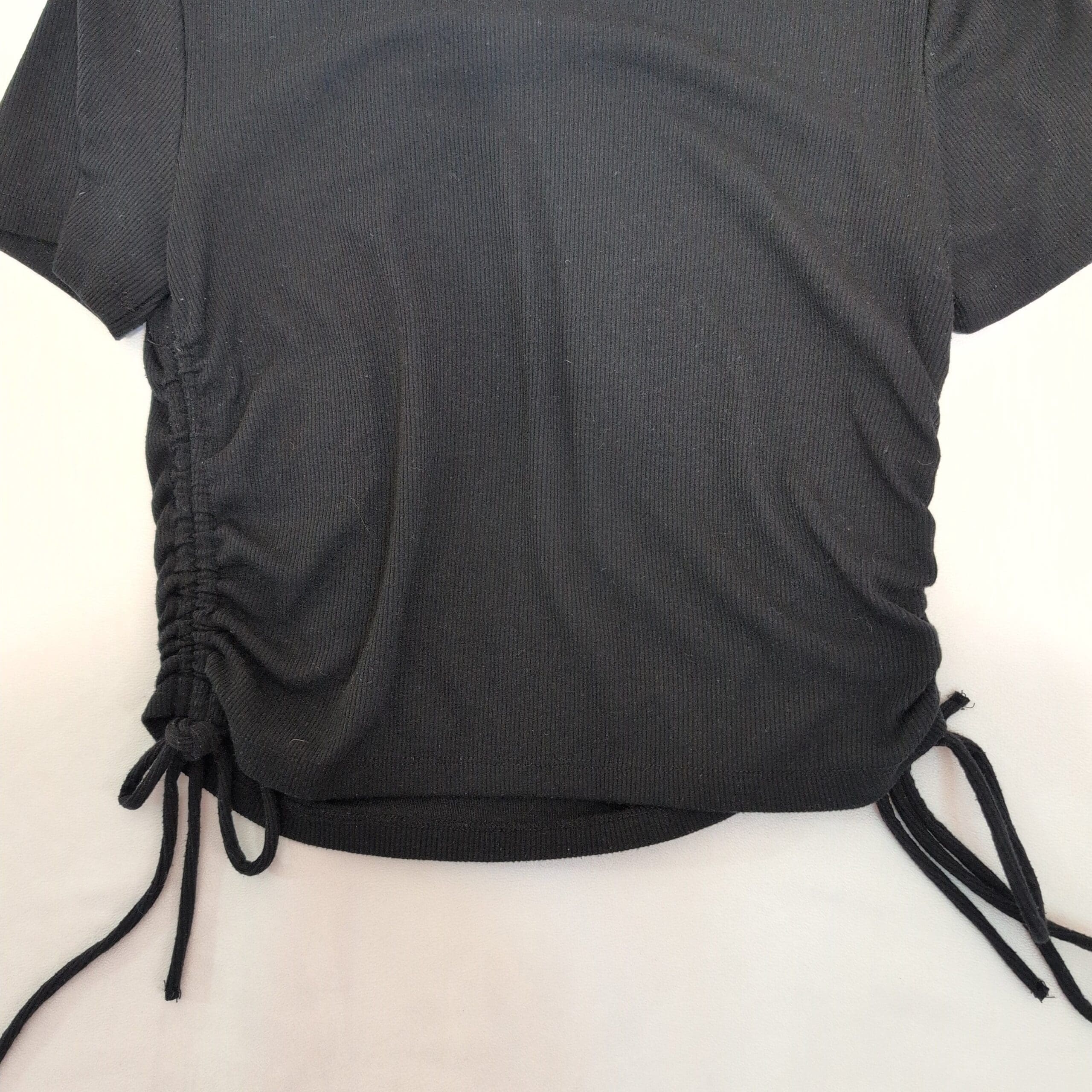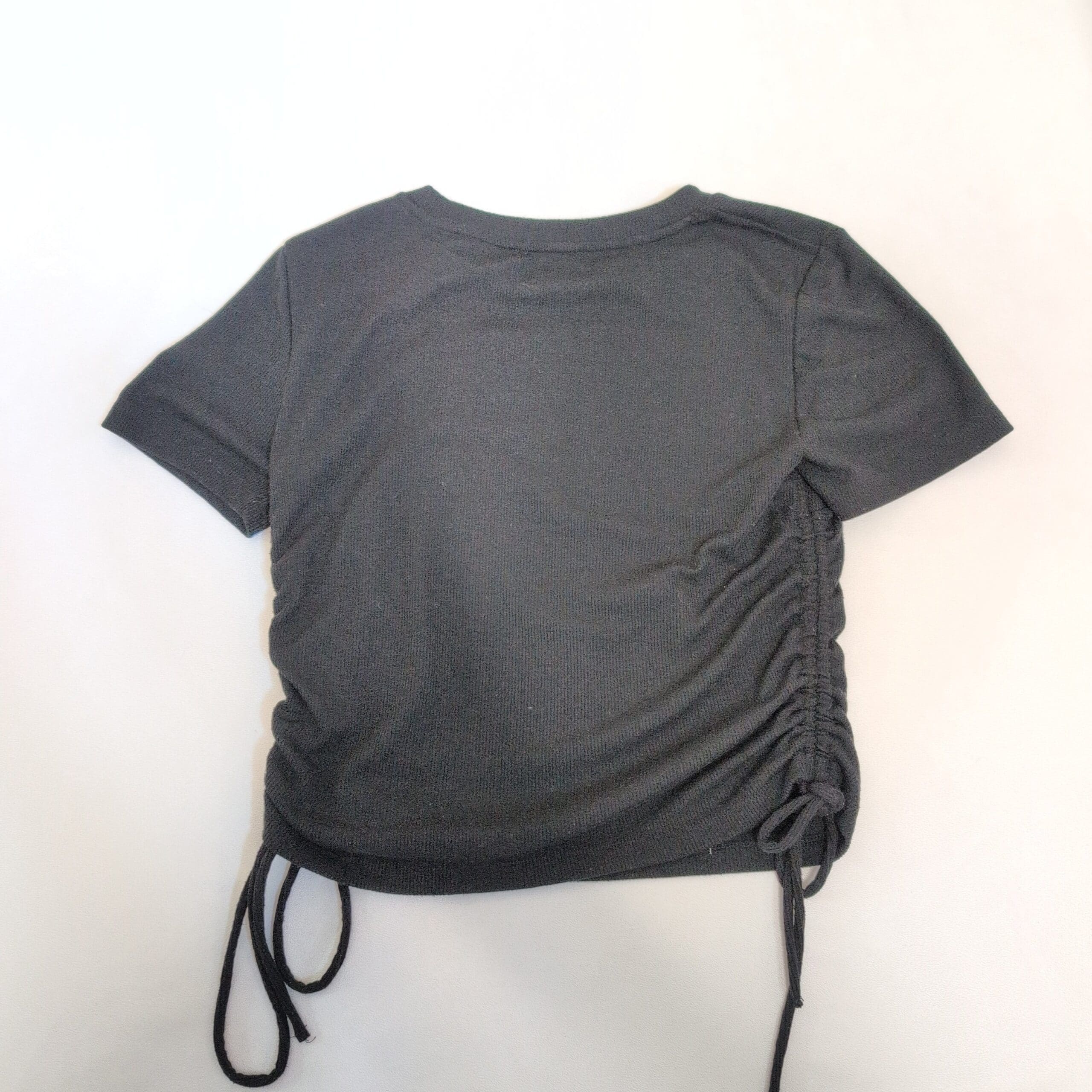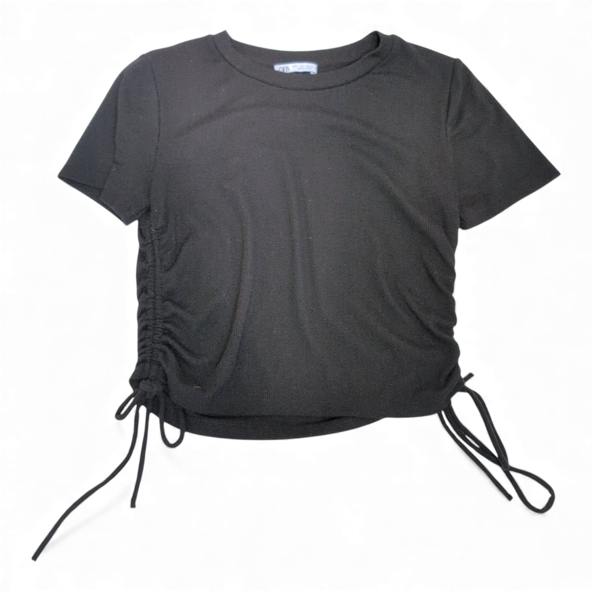 Zara women’s black short sleeve tee in size L. Features a classic crew neckline and adjustable ruched sides with tie details for a customizable silhouette. Simple, versatile staple that pairs well with jeans, skirts, or layered looks for everyday wear.