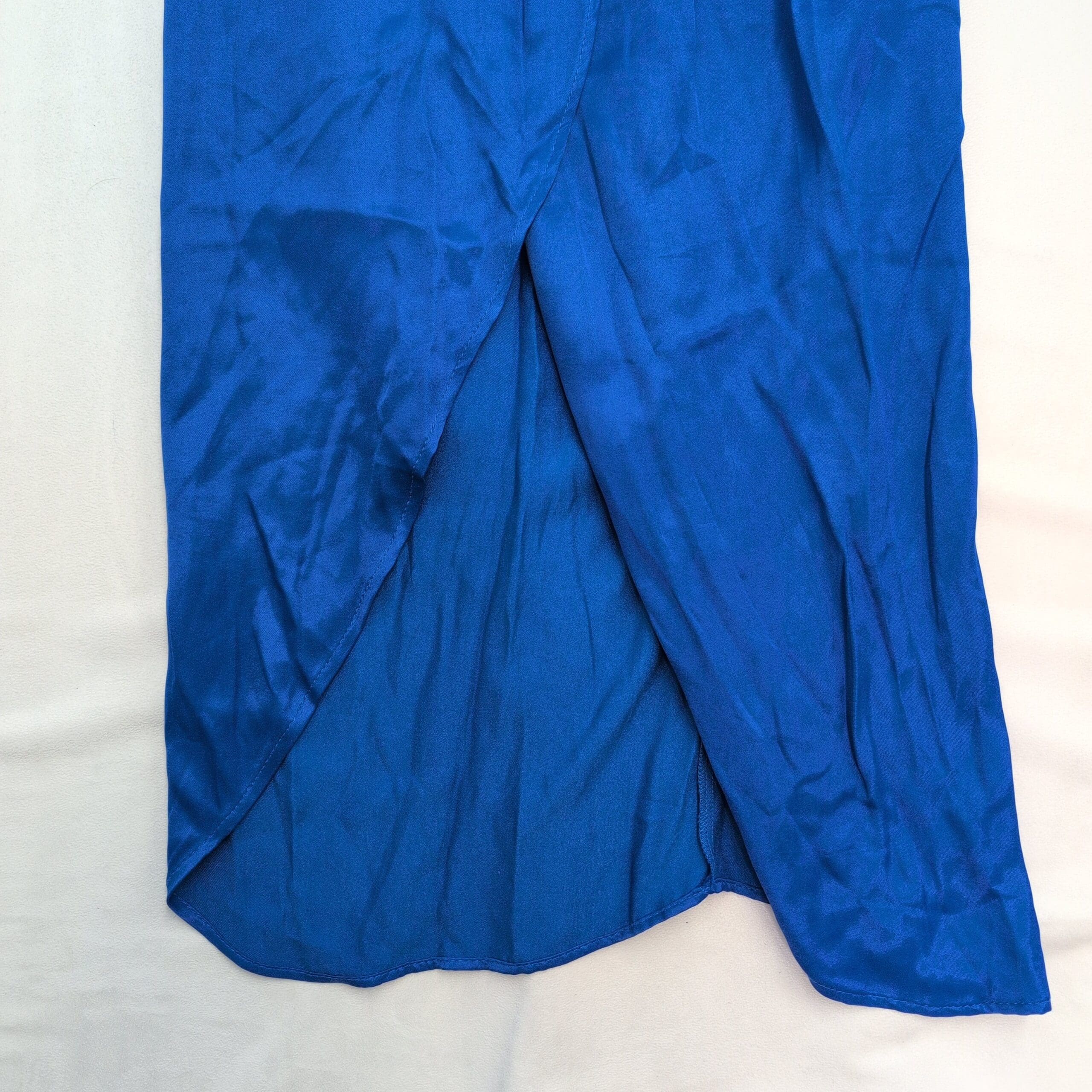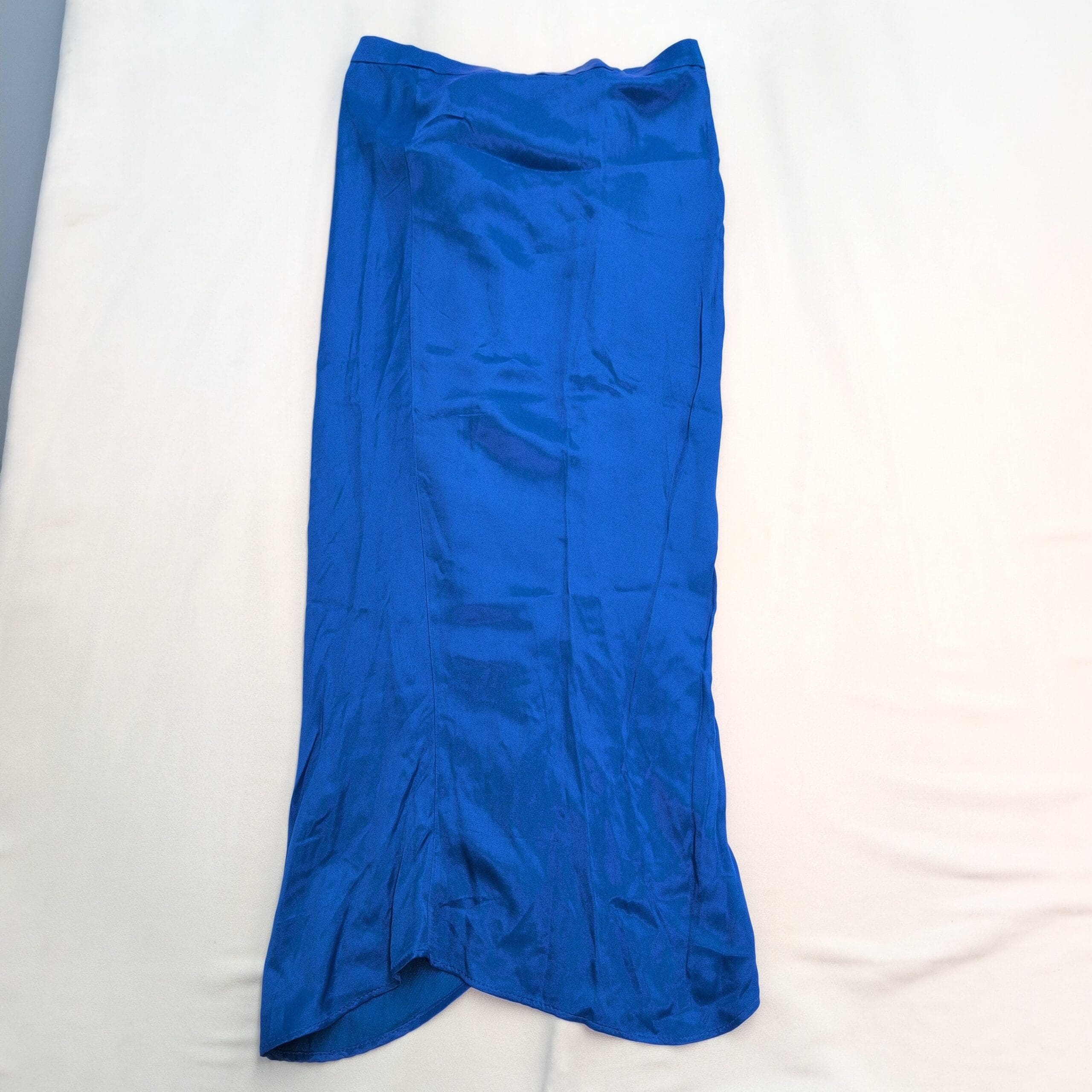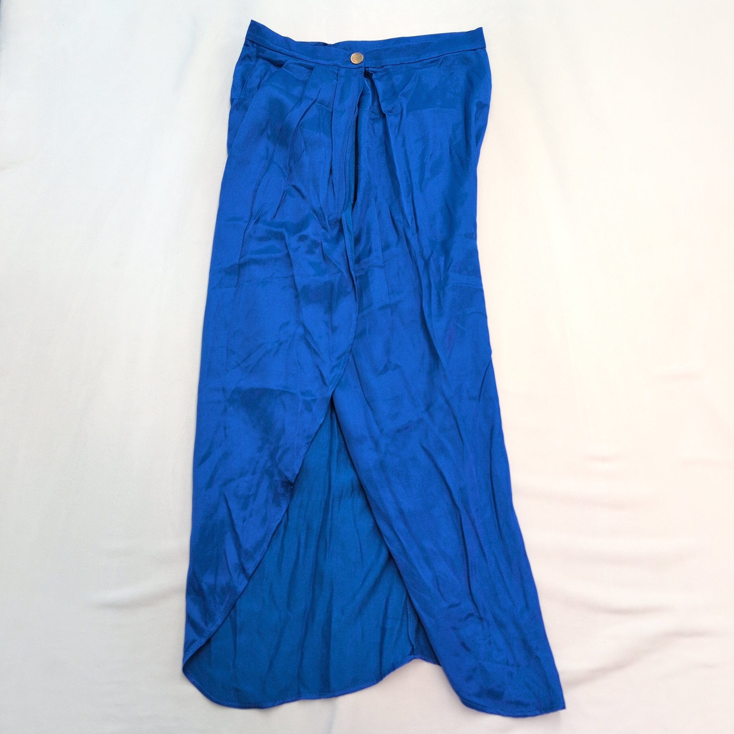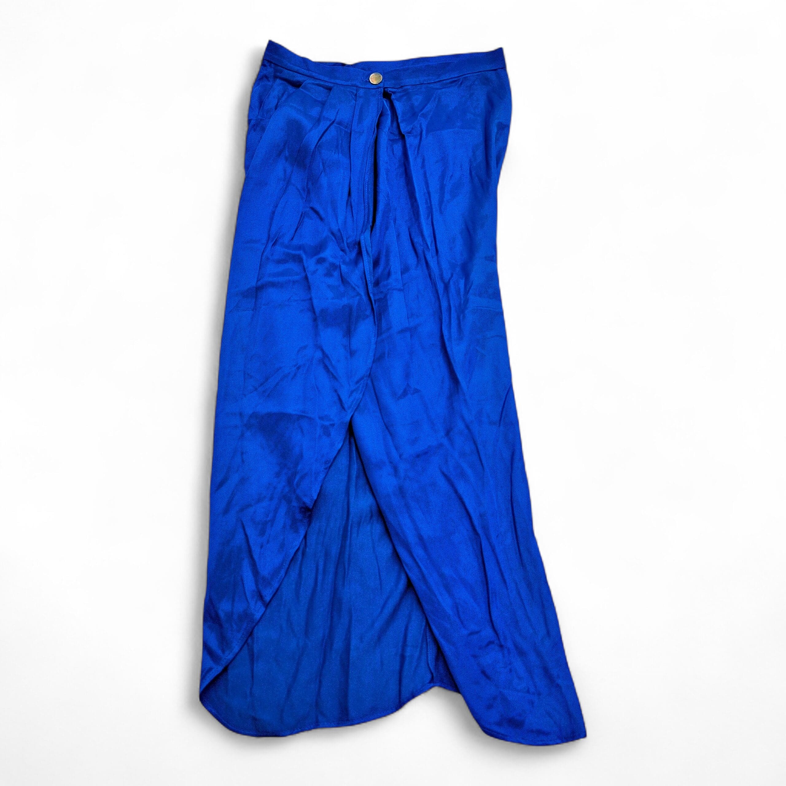 Bright cobalt blue Zara wrap maxi skirt in size L. Lightweight satin-look fabric with a subtle sheen; tulip front overlap and soft pleating at the waist create a flattering, flowy silhouette. Waistband features a button closure and hidden zipper. Gently used — free of major rips, tears, or stains; shows light wrinkles and typical wear consistent with pre-owned items. See photos for details and fabric appearance.