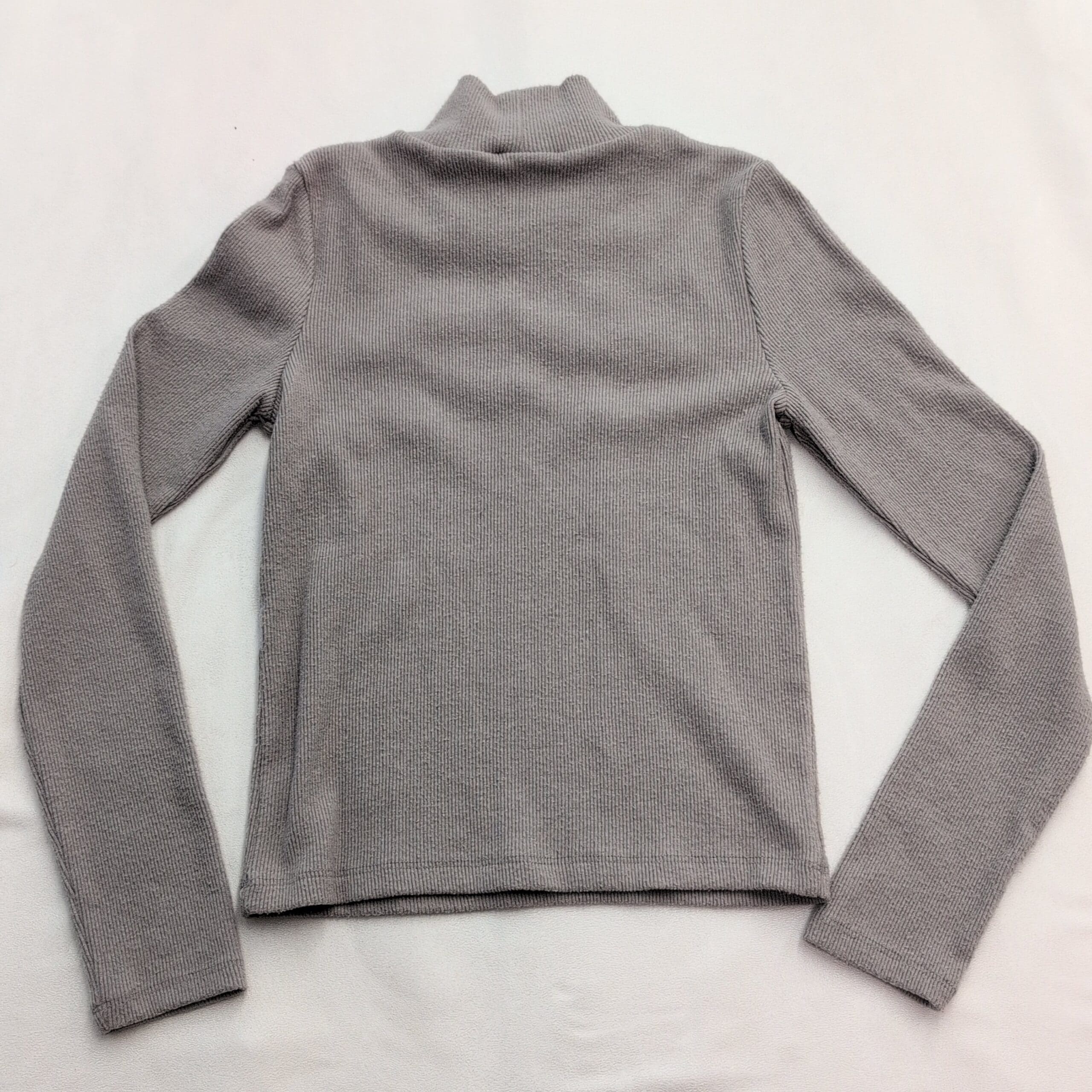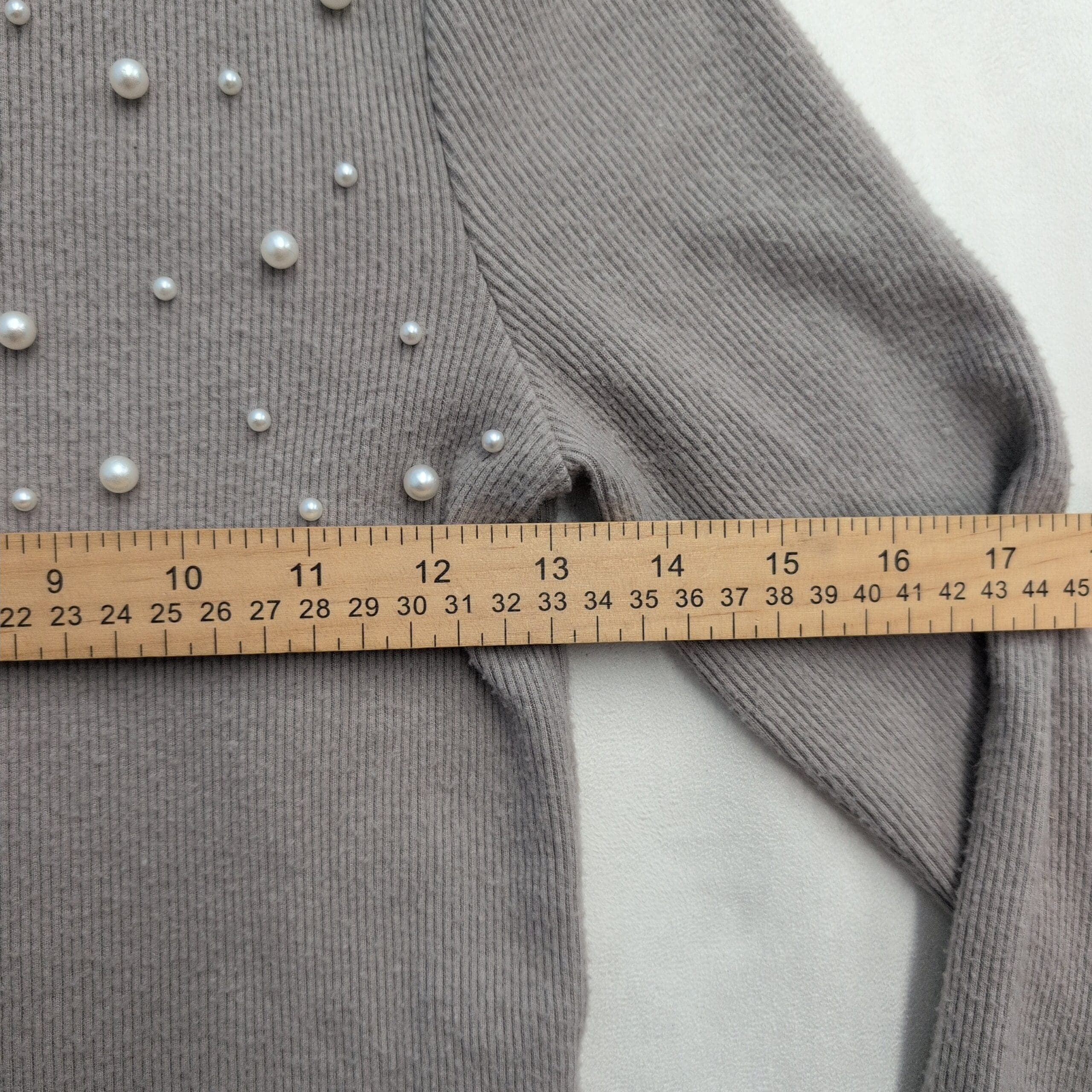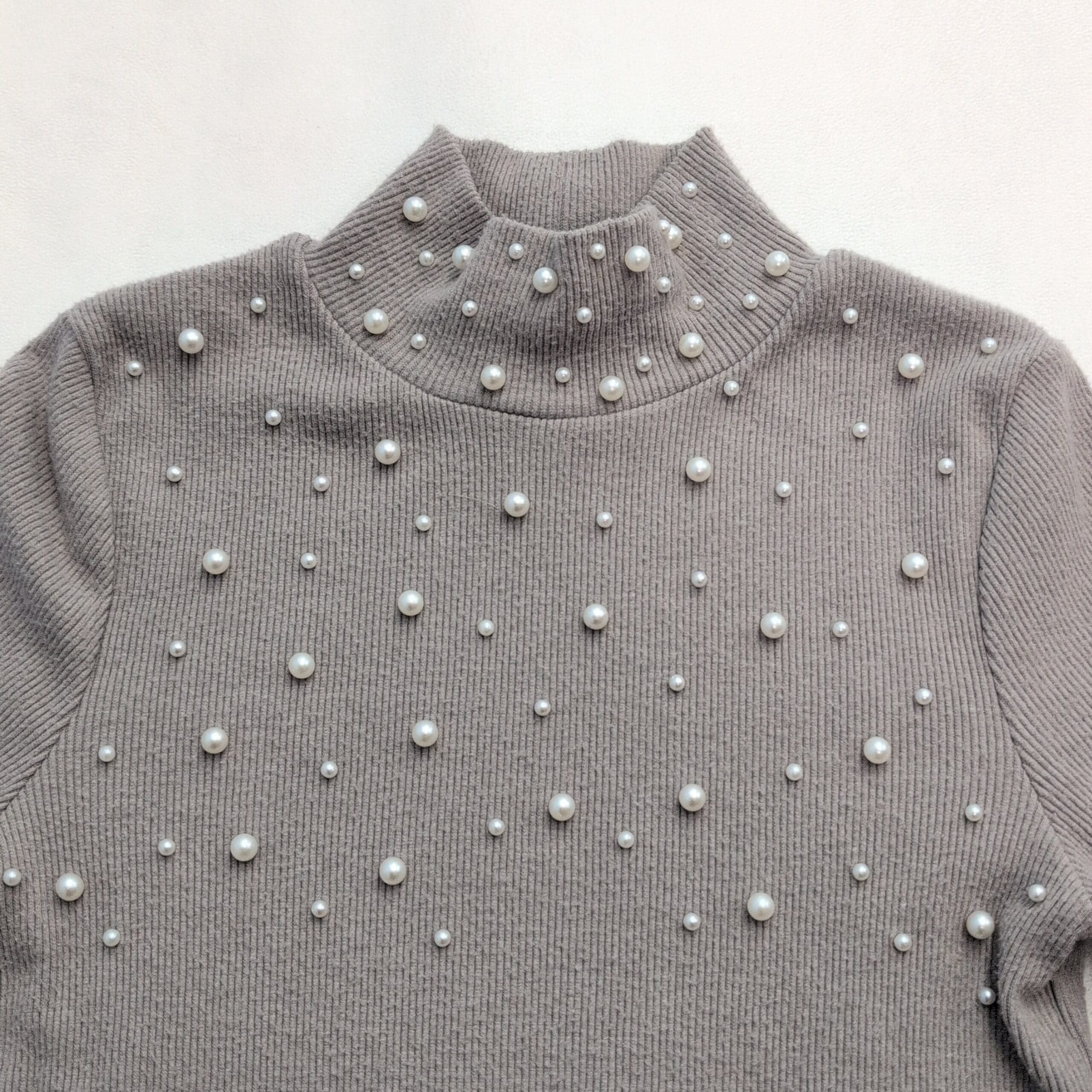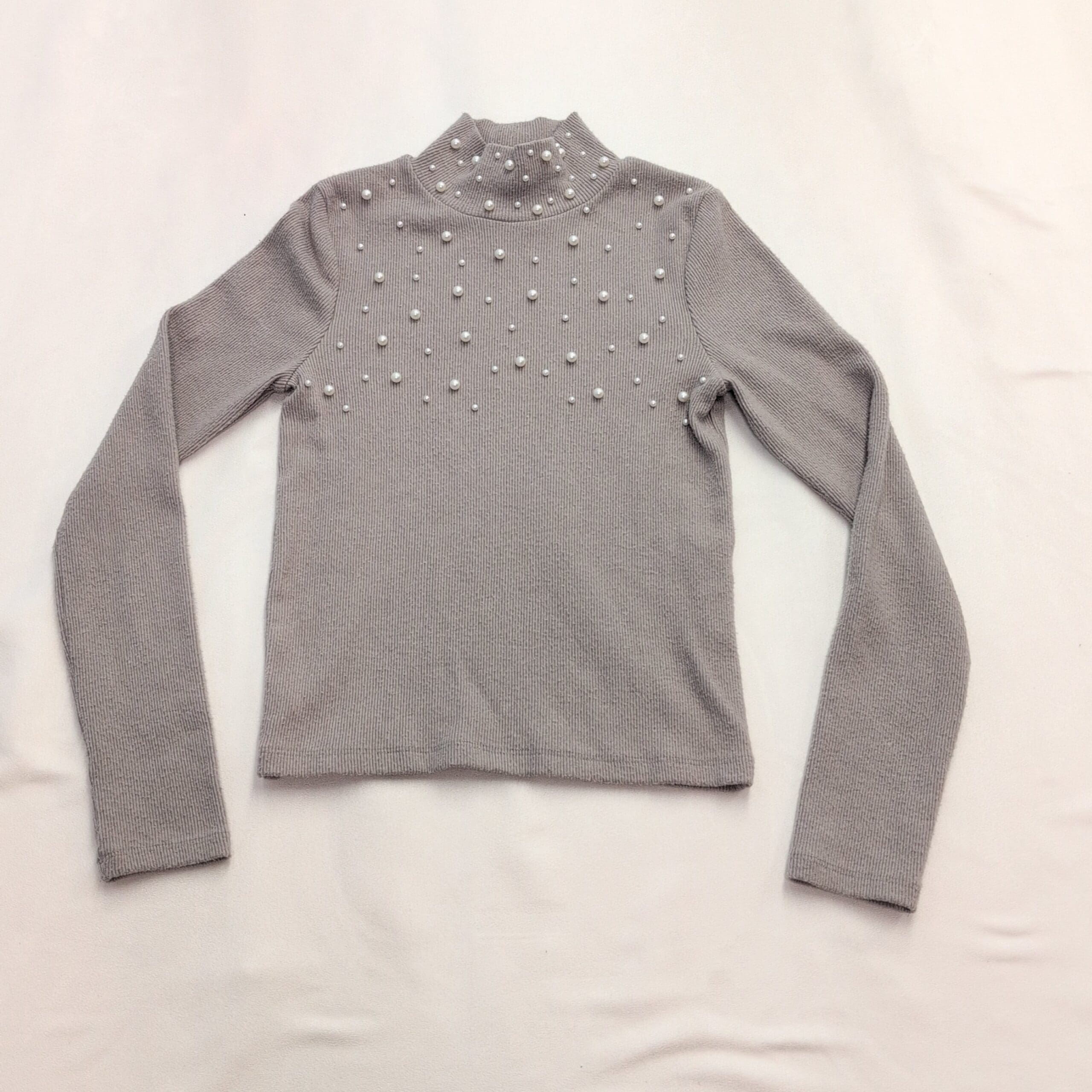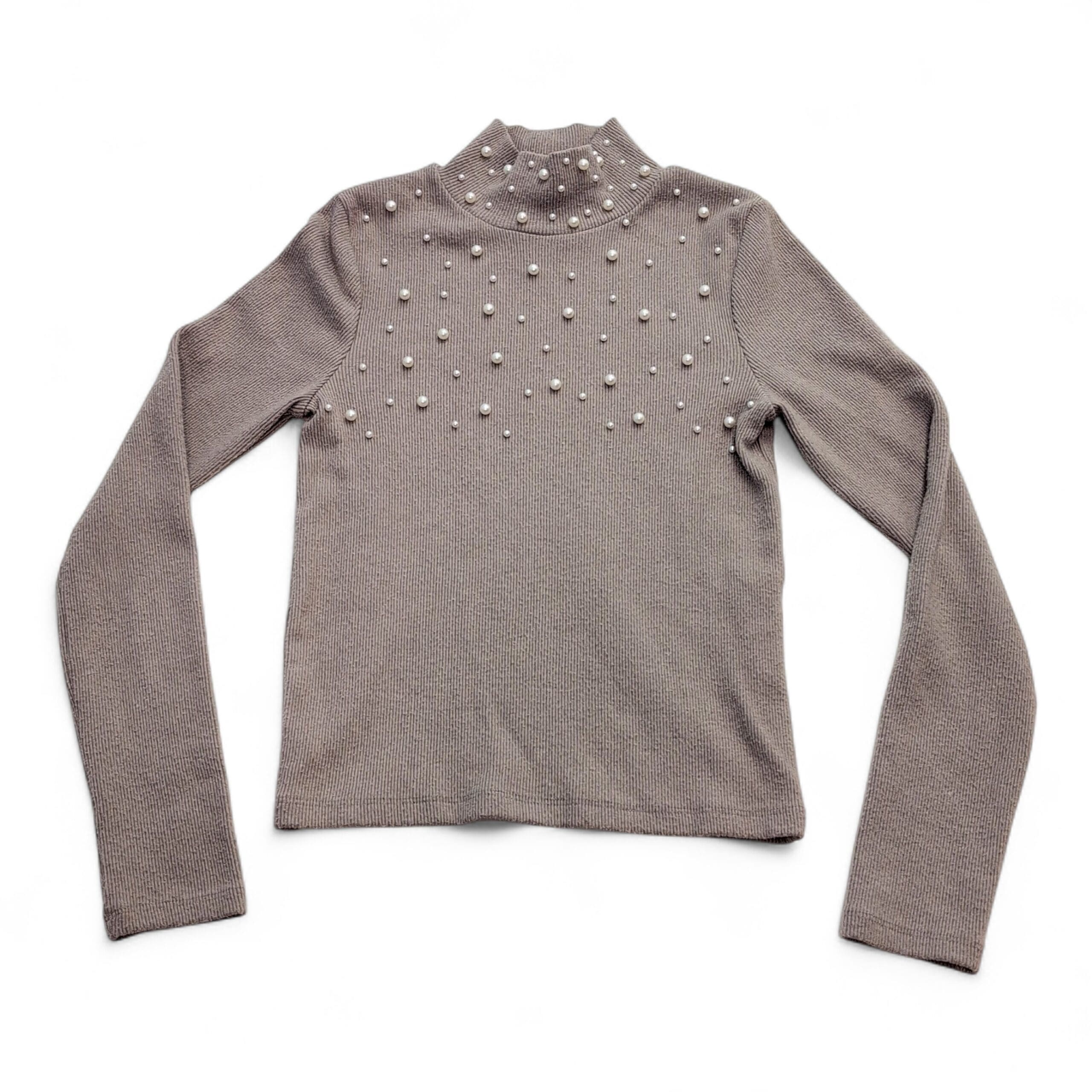 Zara gray turtleneck sweater in size S with decorative faux pearls across the chest and neck for a polished, feminine look. Ribbed knit long sleeves and a slightly fitted silhouette make this piece great for layering or wearing on its own. Gently used condition — free of major rips, tears, stains, or flaws. Typical light wear and minimal pilling consistent with normal use; pearls appear intact.
