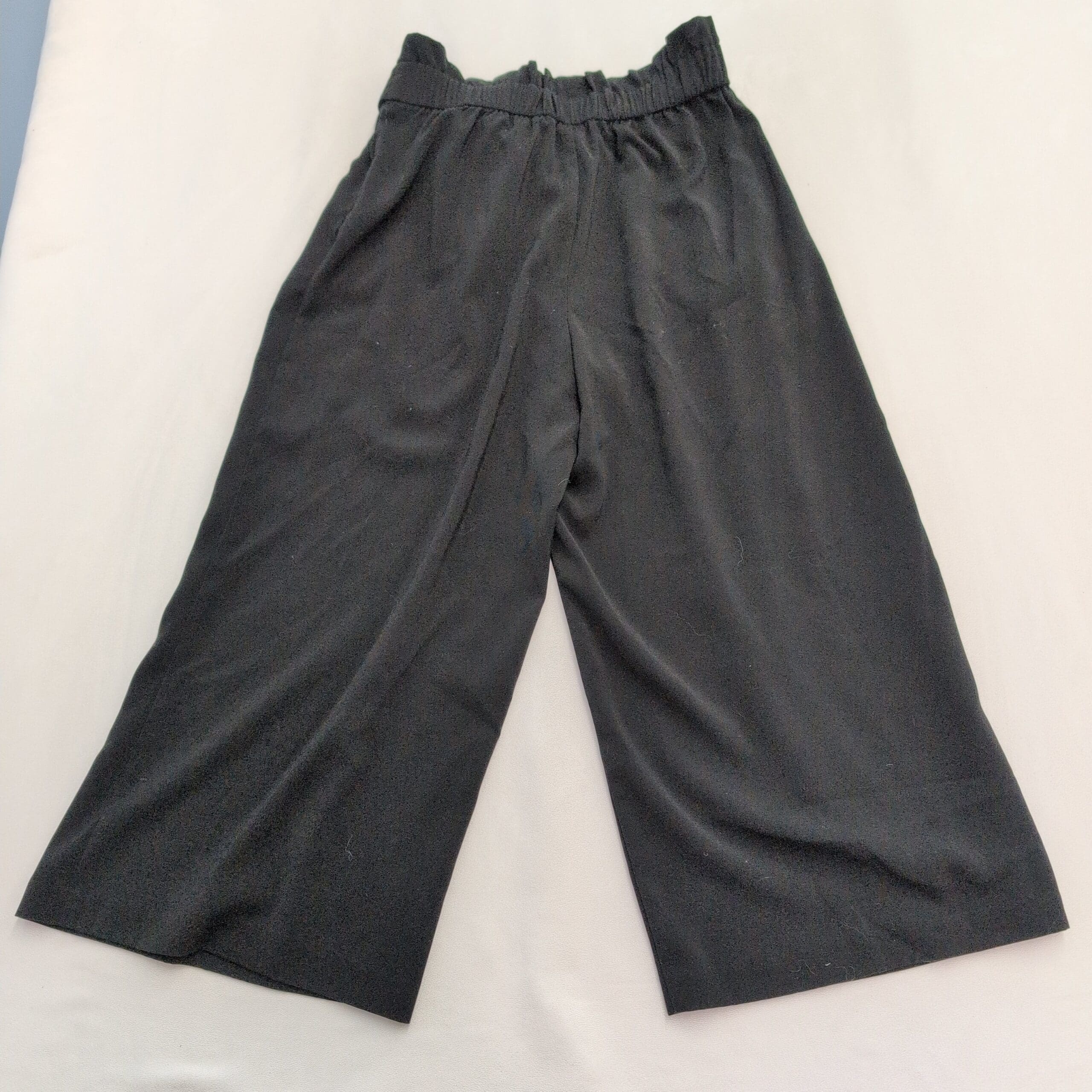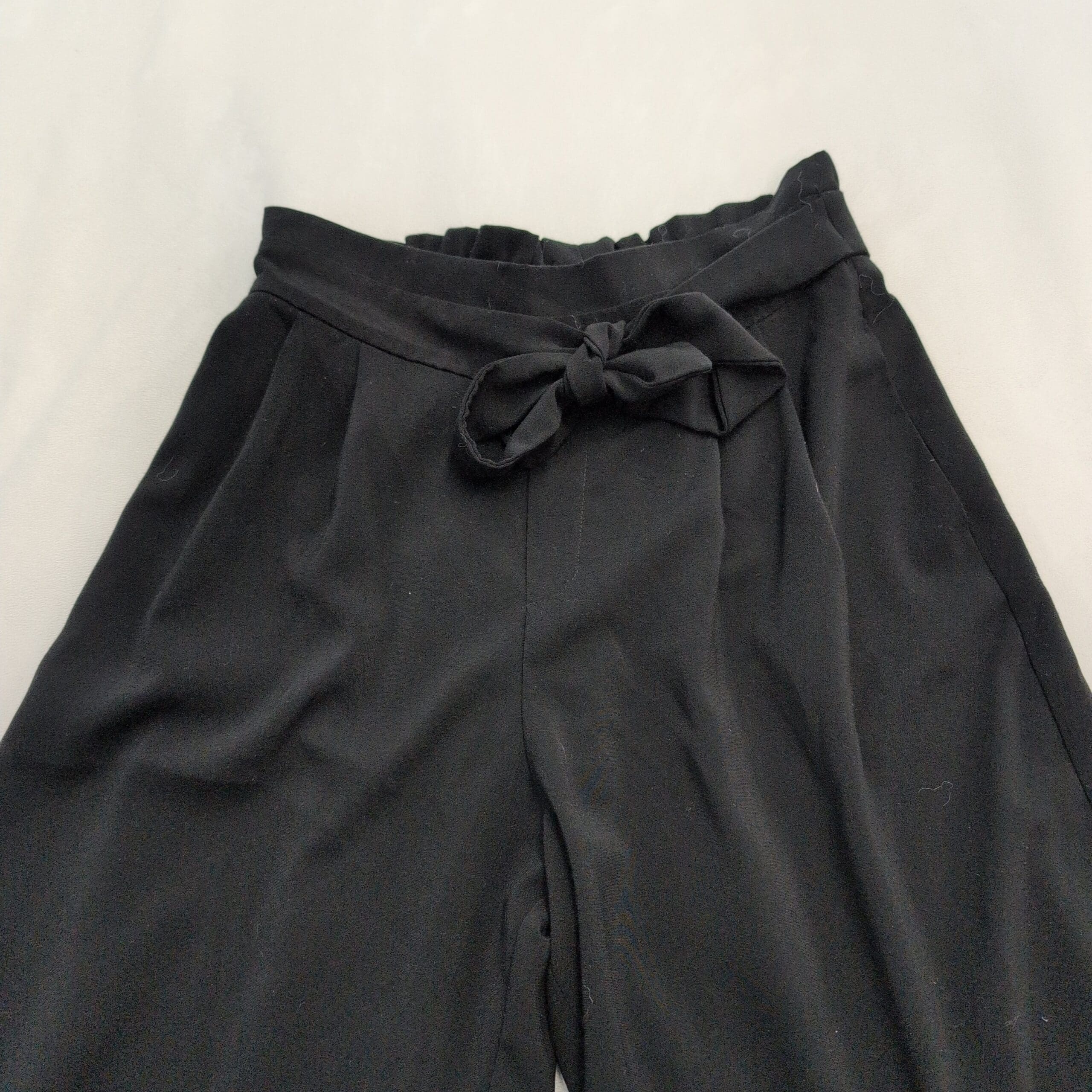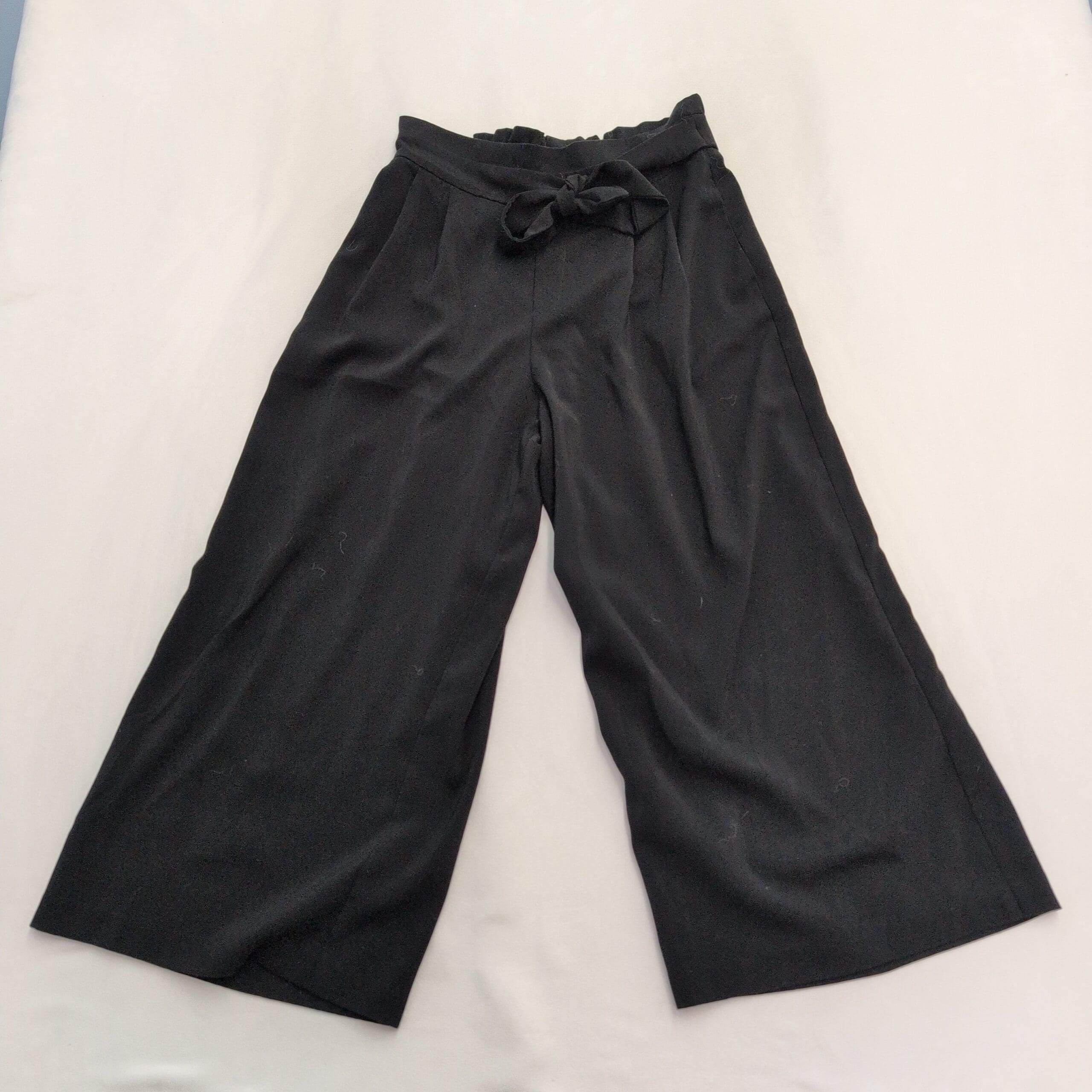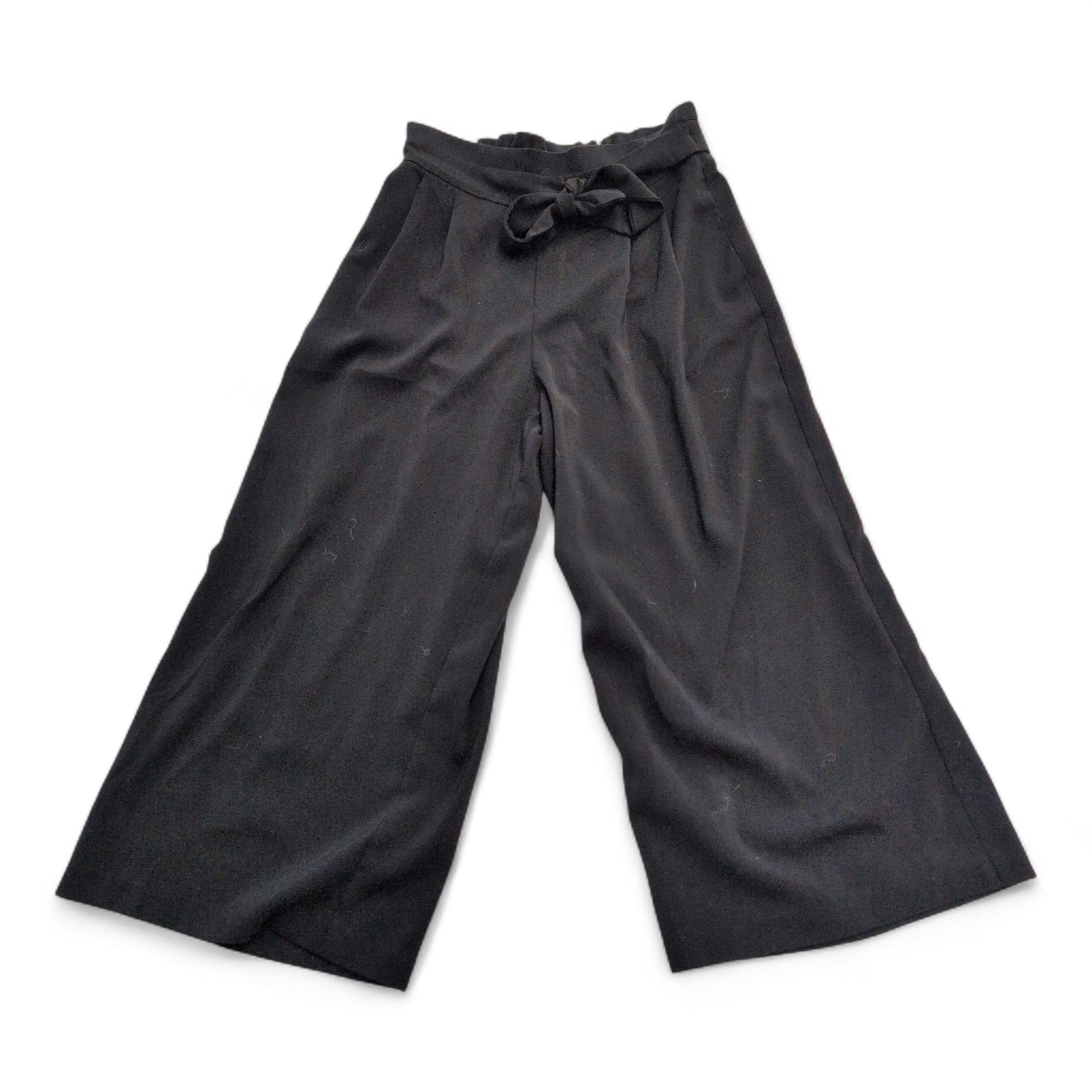 Zara Trafaluc (TRF) black wide-leg culotte pants in size M (standard). Features a tie-waist bow, subtle front pleats, and a cropped, roomy silhouette that can be dressed up or down. Exact fabric content not provided — fabric has a nice drape and structure.