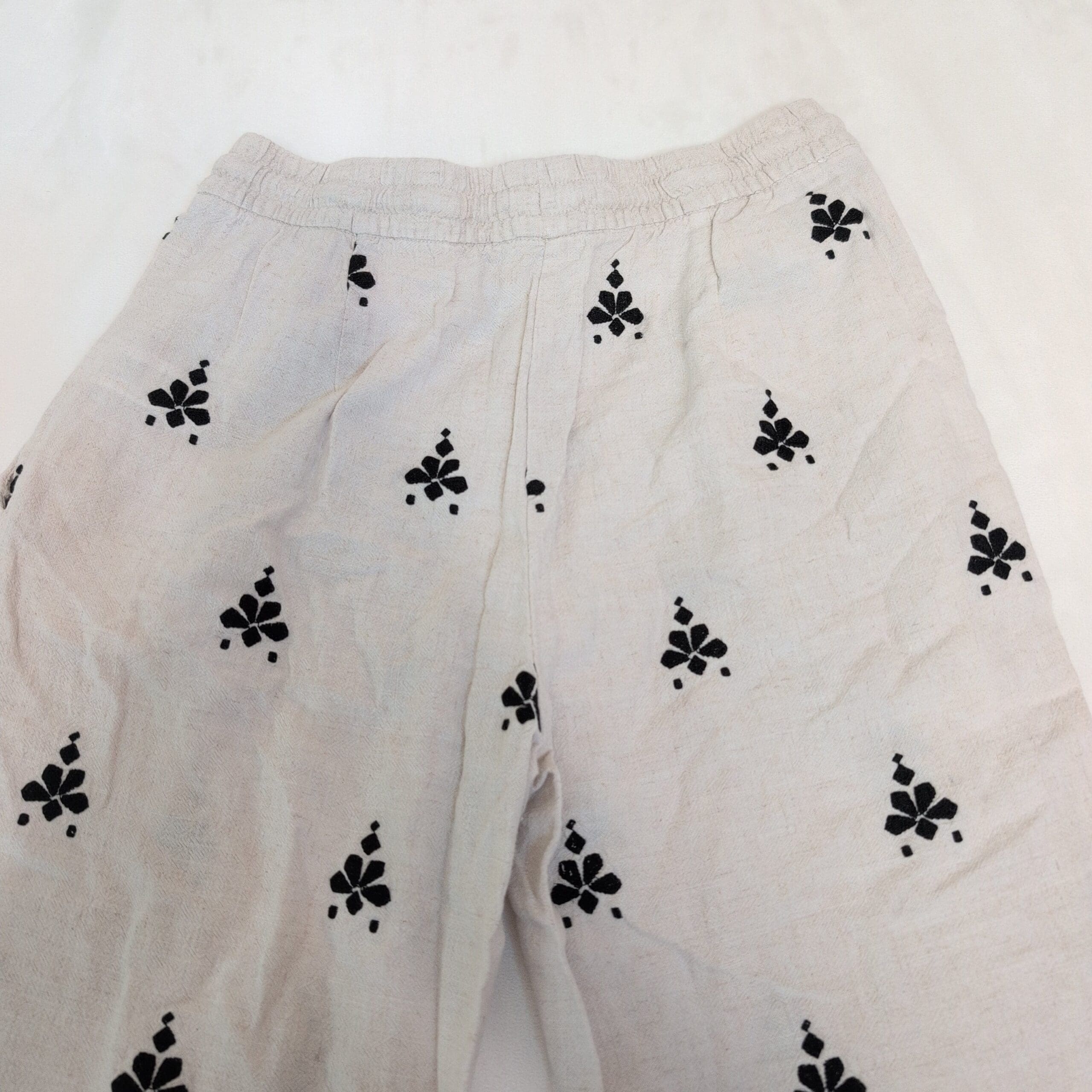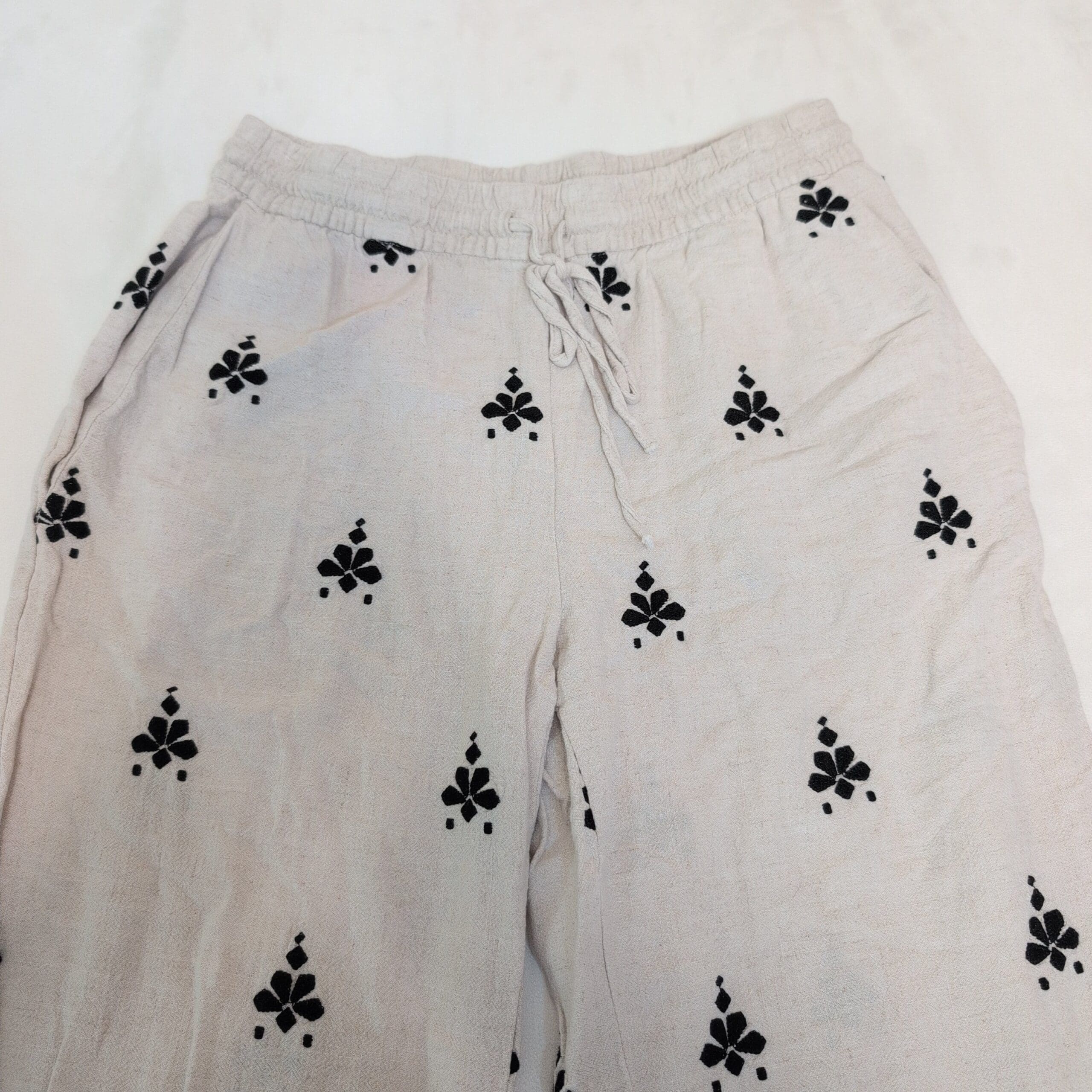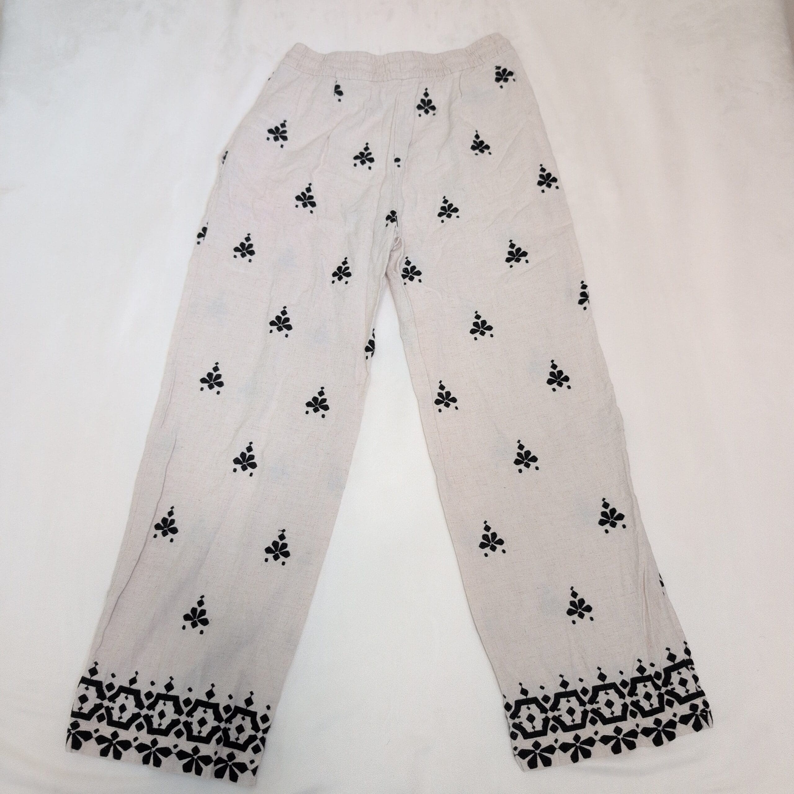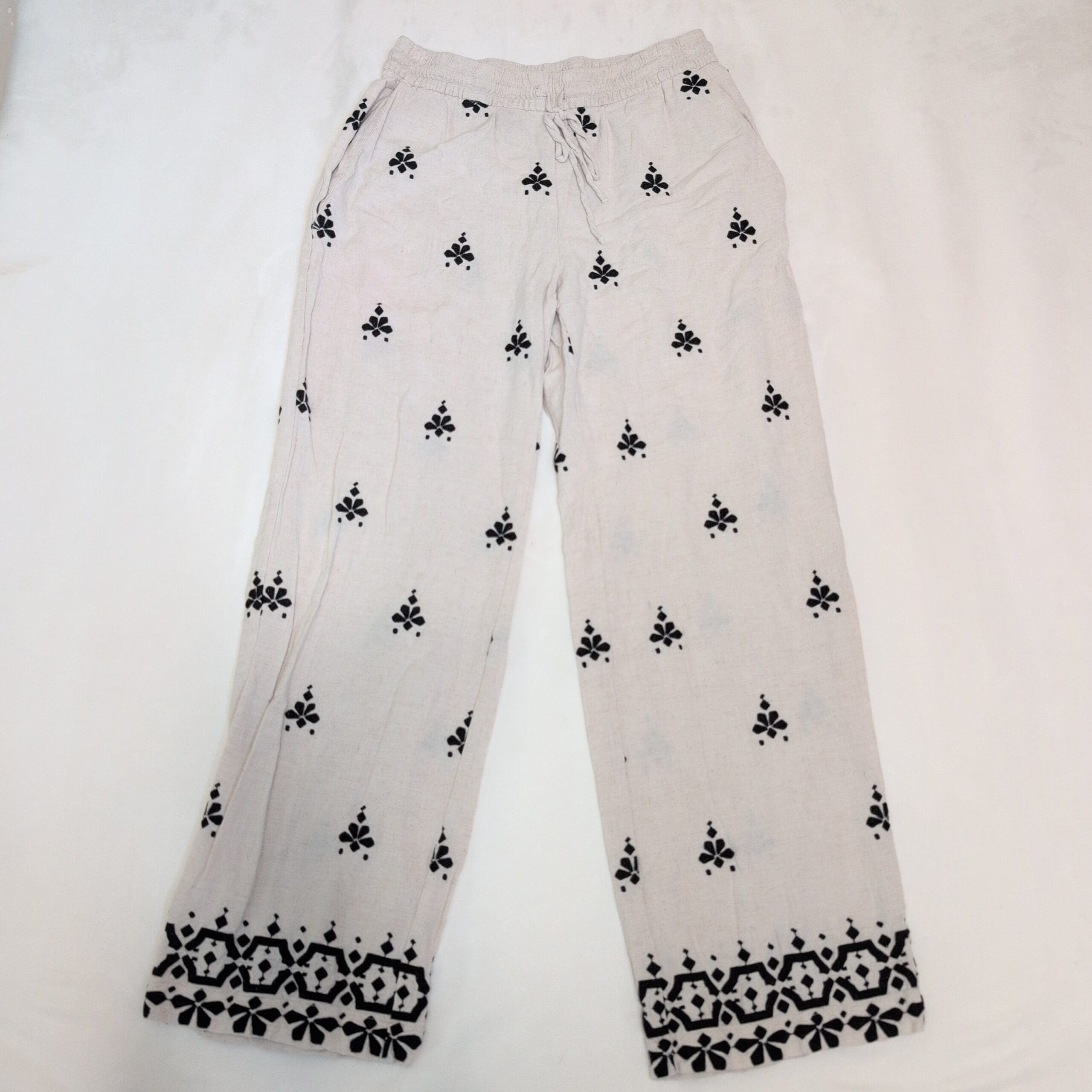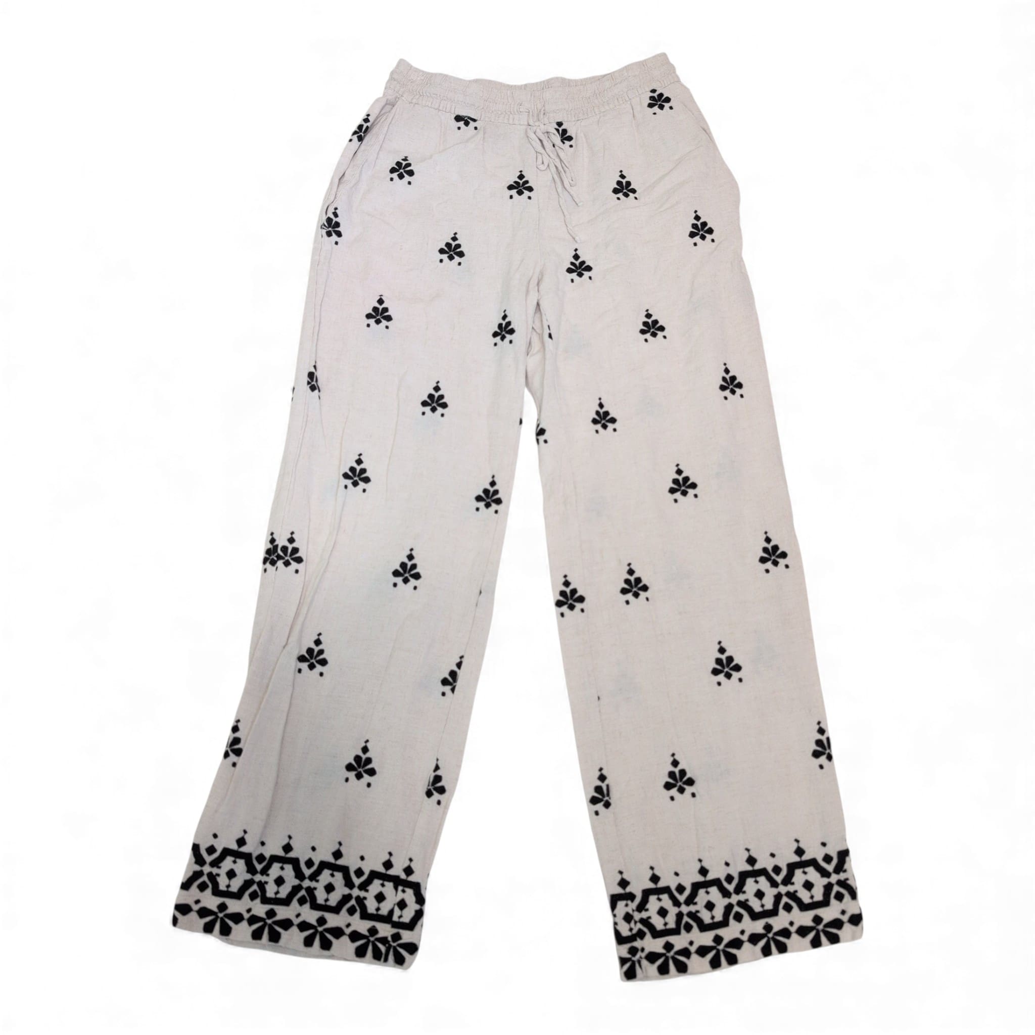 White Zara wide-leg women’s pants in size L featuring a relaxed, easy fit with an elastic drawstring waistband and side pockets. Lightweight woven construction with an all-over black printed motif and a decorative patterned border at the hem. True wide-leg silhouette perfect for warm-weather styling — pairs well with sandals, flats, or a tucked blouse. Gently used; in good pre-owned condition with normal light signs of wear. Please review photos for details.