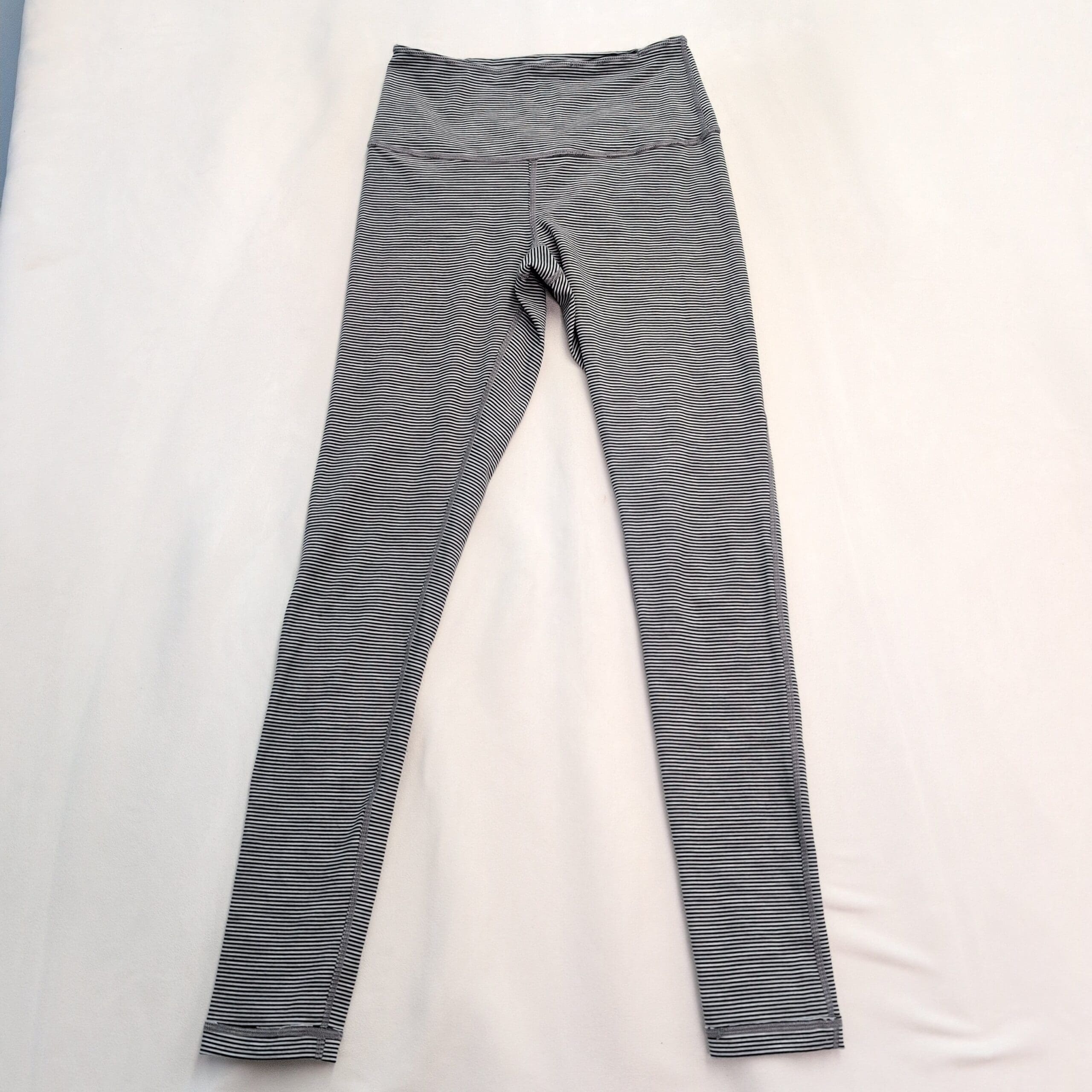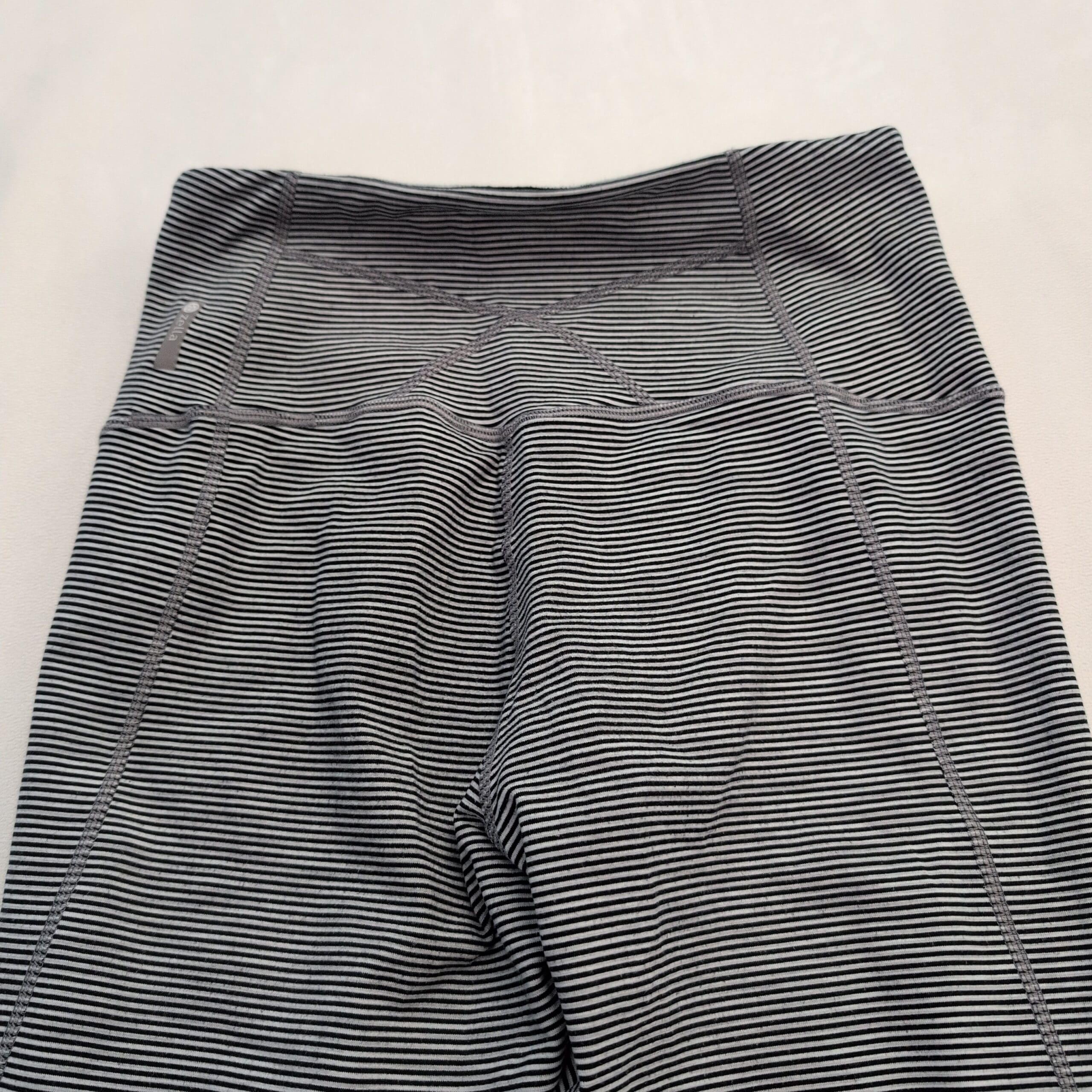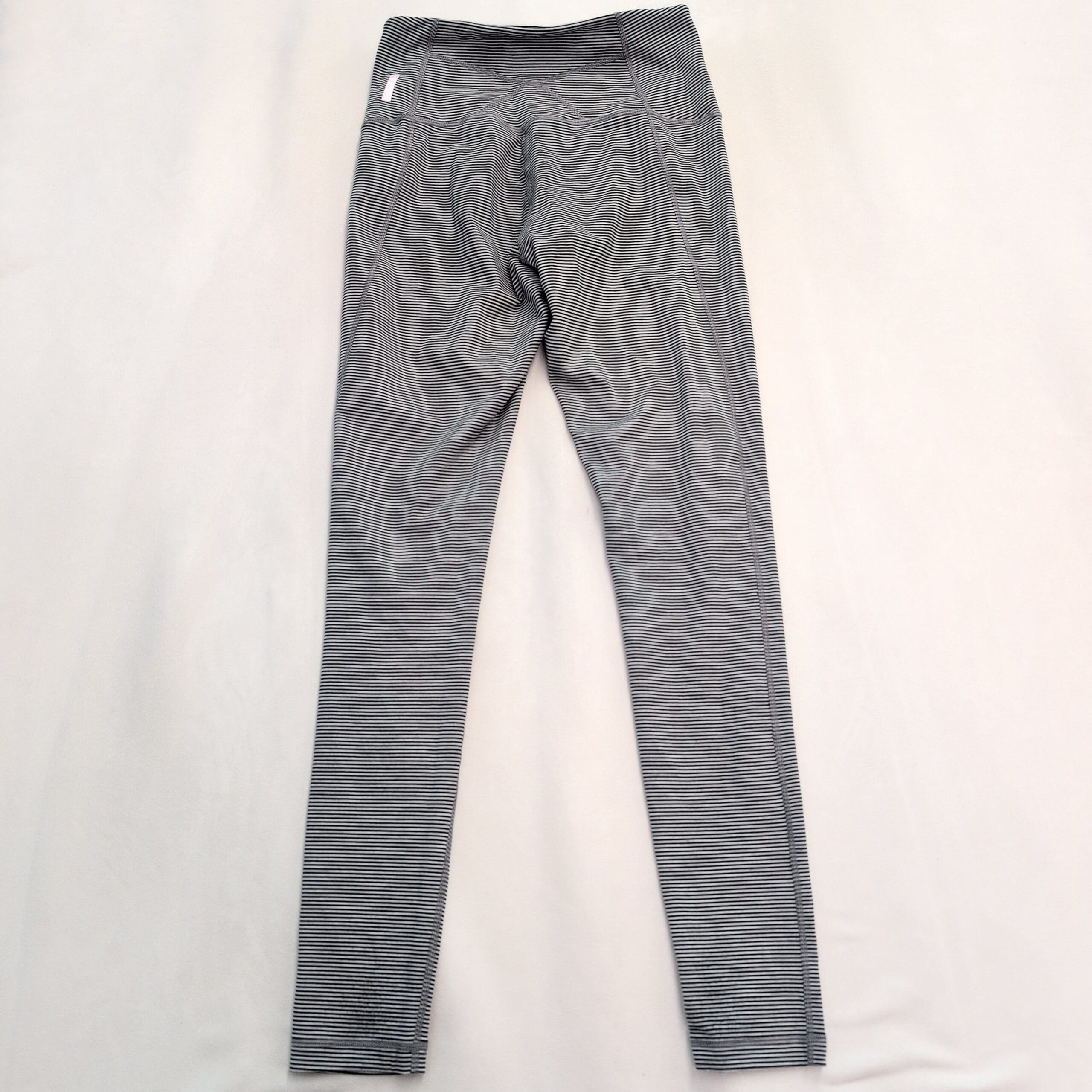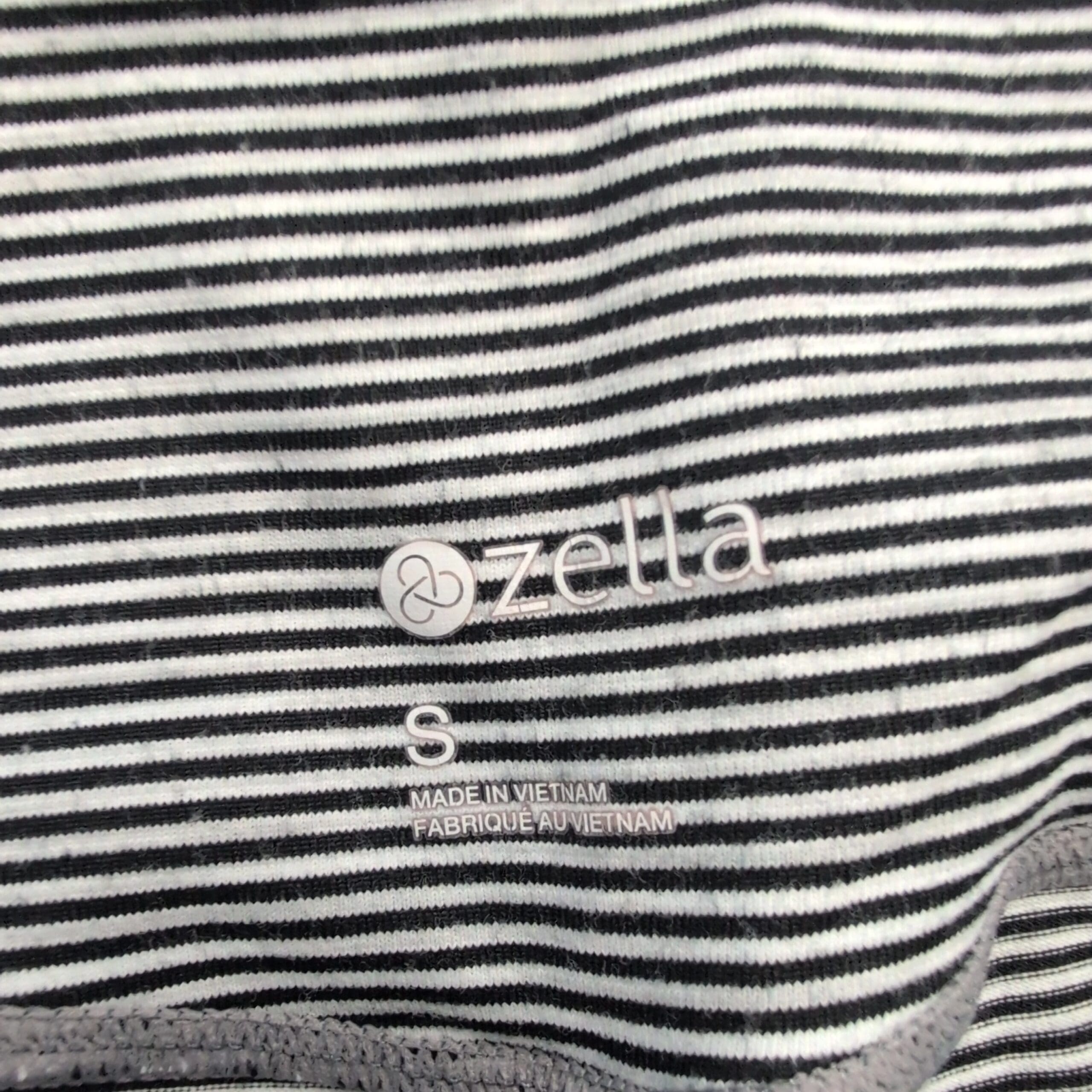 Zella women’s high-rise full-length leggings in black with thin horizontal stripes. Size S. Stretchy, supportive fit with a wide waistband for comfort and stay-in-place wear — great for workouts or everyday use. Fair condition with some piling and light surface wear consistent with normal use; free of major rips, tears, or stains. Please review photos for close-up details of texture and condition.