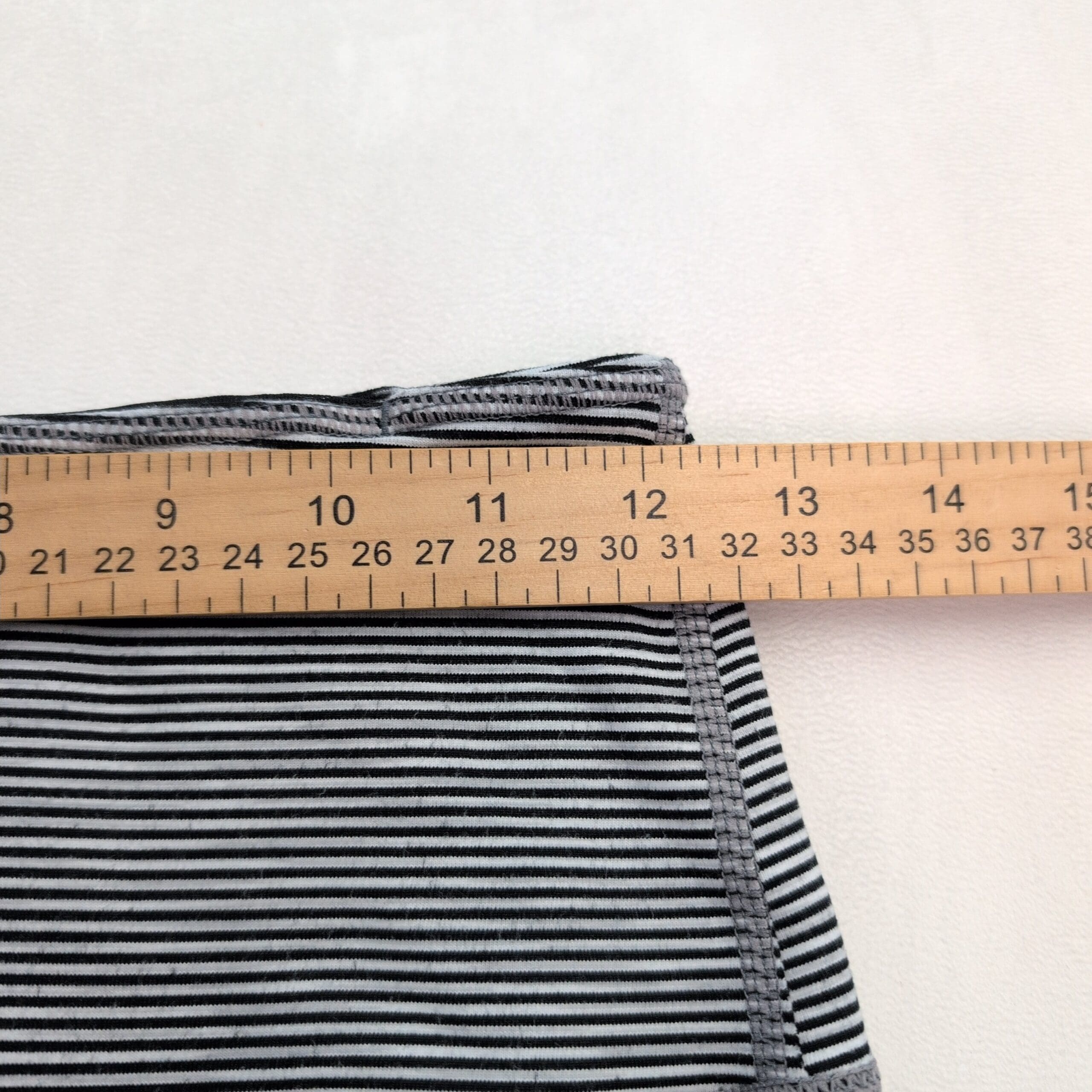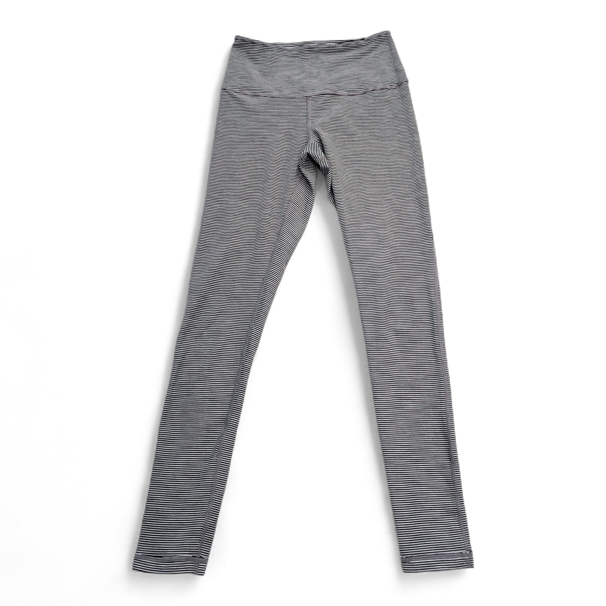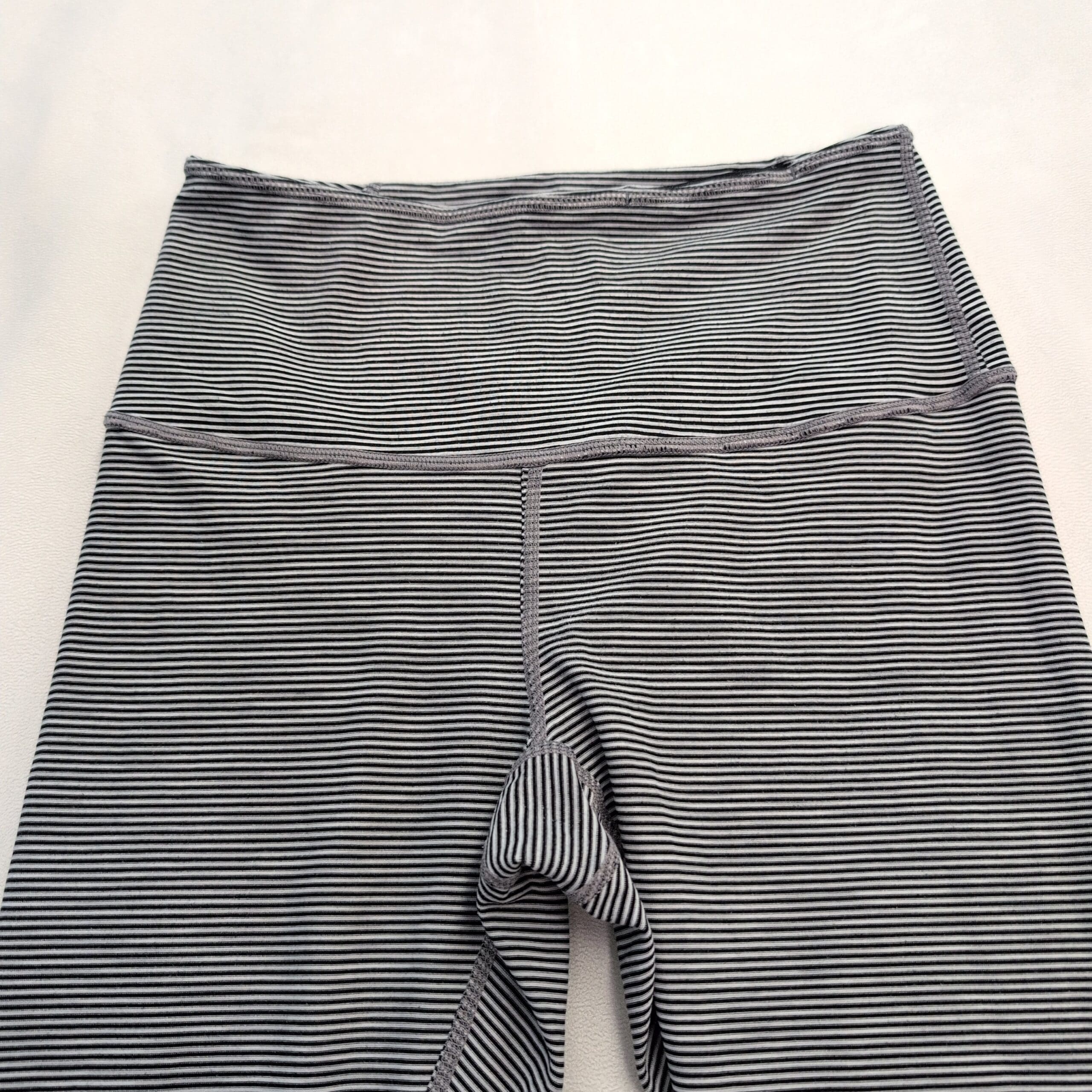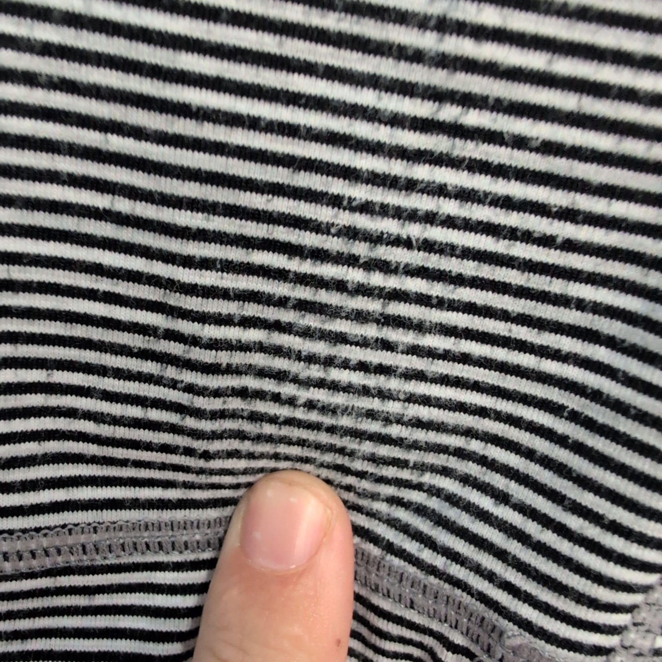 Zella women’s high-rise full-length leggings in black with thin horizontal stripes. Size S. Stretchy, supportive fit with a wide waistband for comfort and stay-in-place wear — great for workouts or everyday use. Fair condition with some piling and light surface wear consistent with normal use; free of major rips, tears, or stains. Please review photos for close-up details of texture and condition.