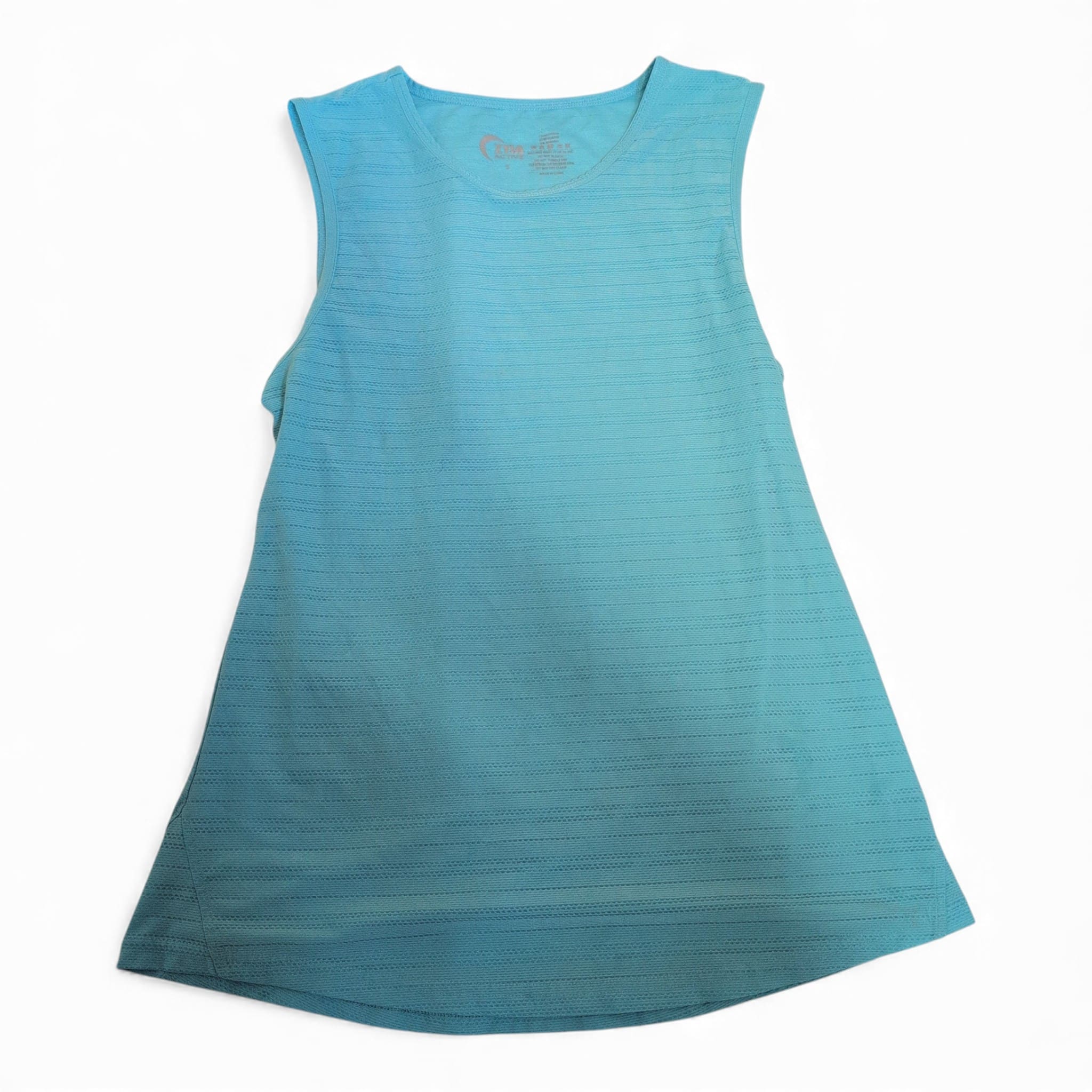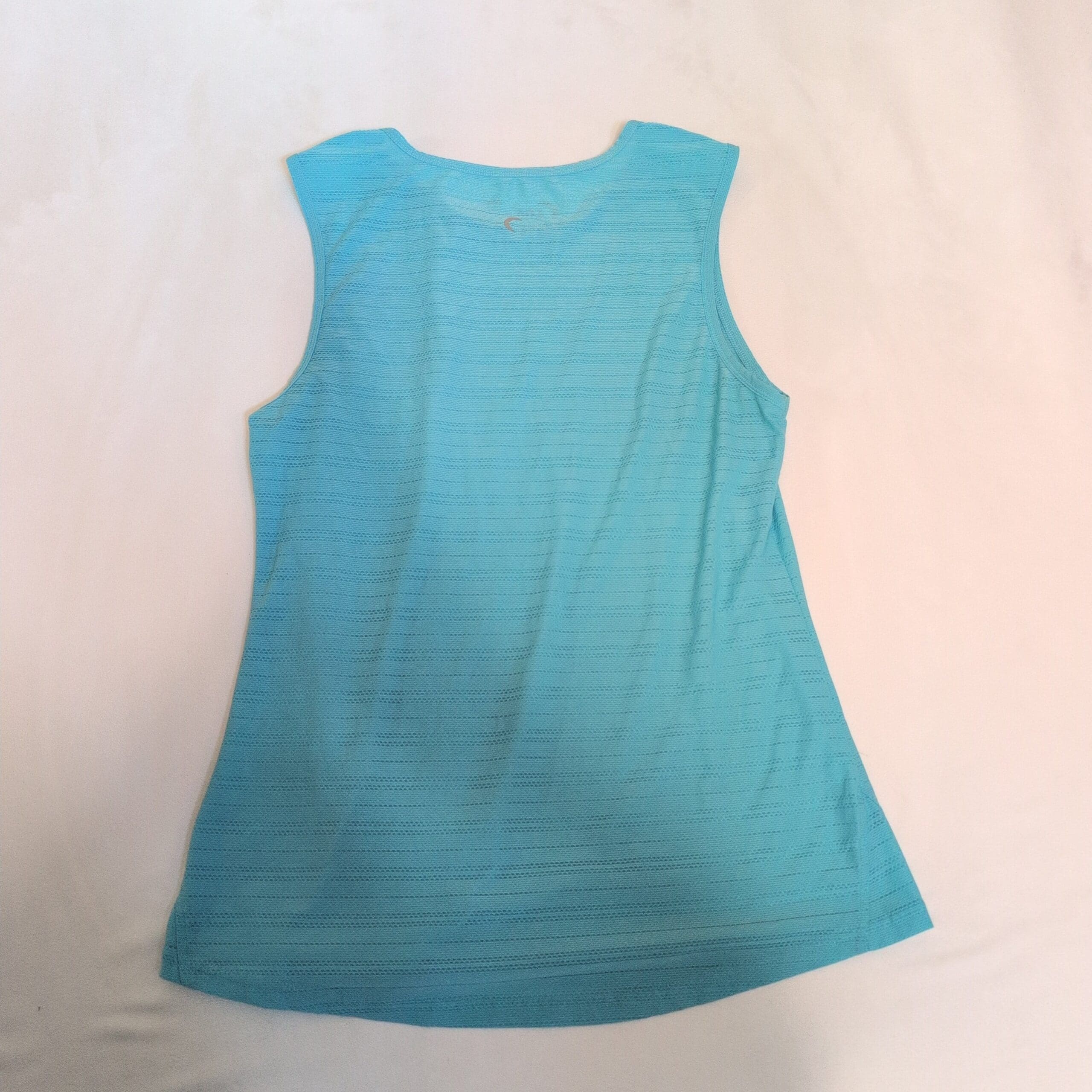 Zyia women’s tank top in a bright blue, size S. Features a scoop neckline, sleeveless cut, and a subtle horizontal textured knit with a slightly A-line swing hem for easy movement and a flattering, relaxed fit. Lightweight and breathable — great for workouts, yoga, or casual layering. Excellent pre-owned condition with minimal signs of wear.